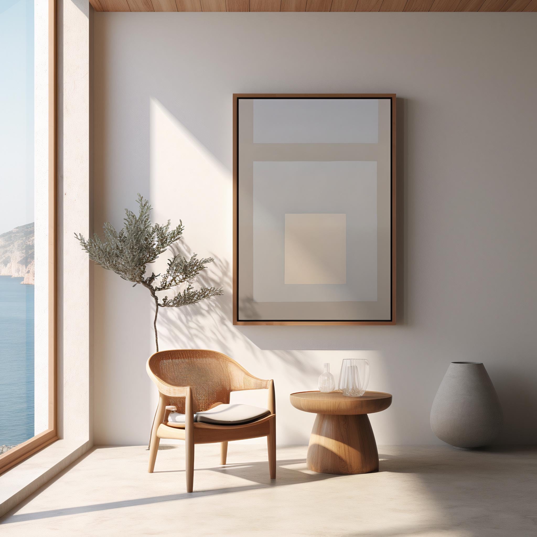 A calm, minimalist abstract composition featuring soft beige, warm taupe, and light neutral tones arranged in a balanced, geometric layout. Subtle layering and gentle contrast create a serene, architectural feel, while the textured canvas surface adds depth and richness. Designed to elevate Japandi, organic modern, and contemporary interiors.