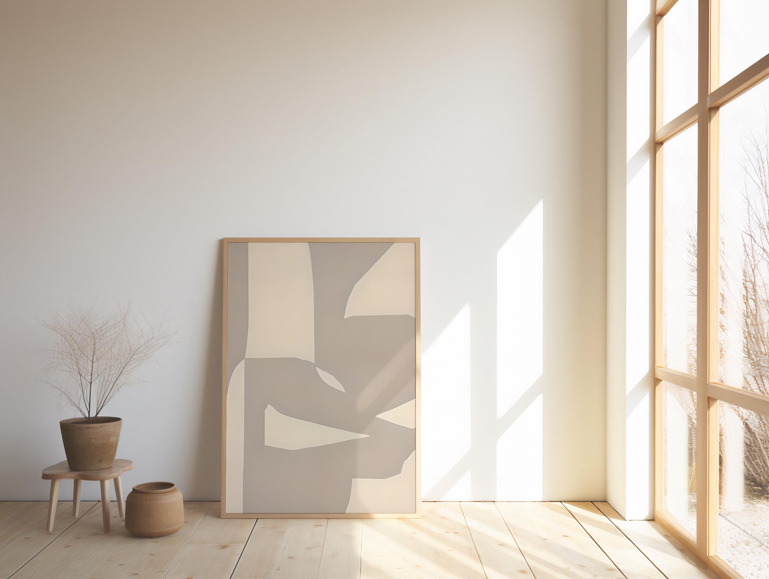 This is a digital download of a calm, organic abstract artwork featuring soft taupe, warm beige, and neutral tones layered in fluid, sculptural shapes. The composition is subtle and balanced, designed to feel serene, elevated, and timeless in modern interiors.