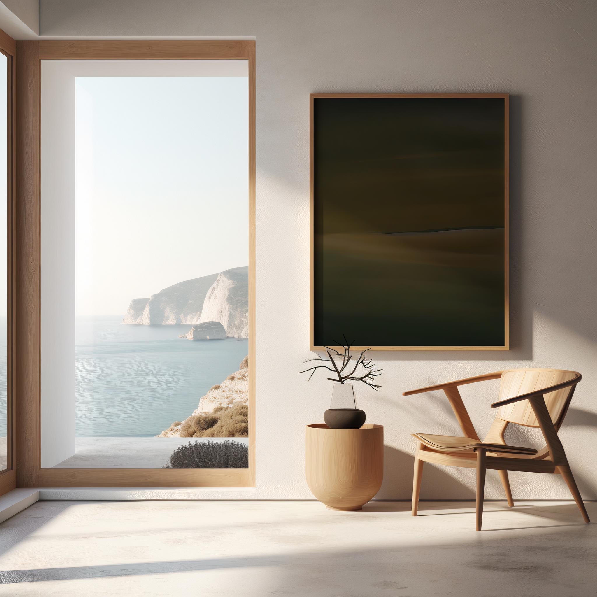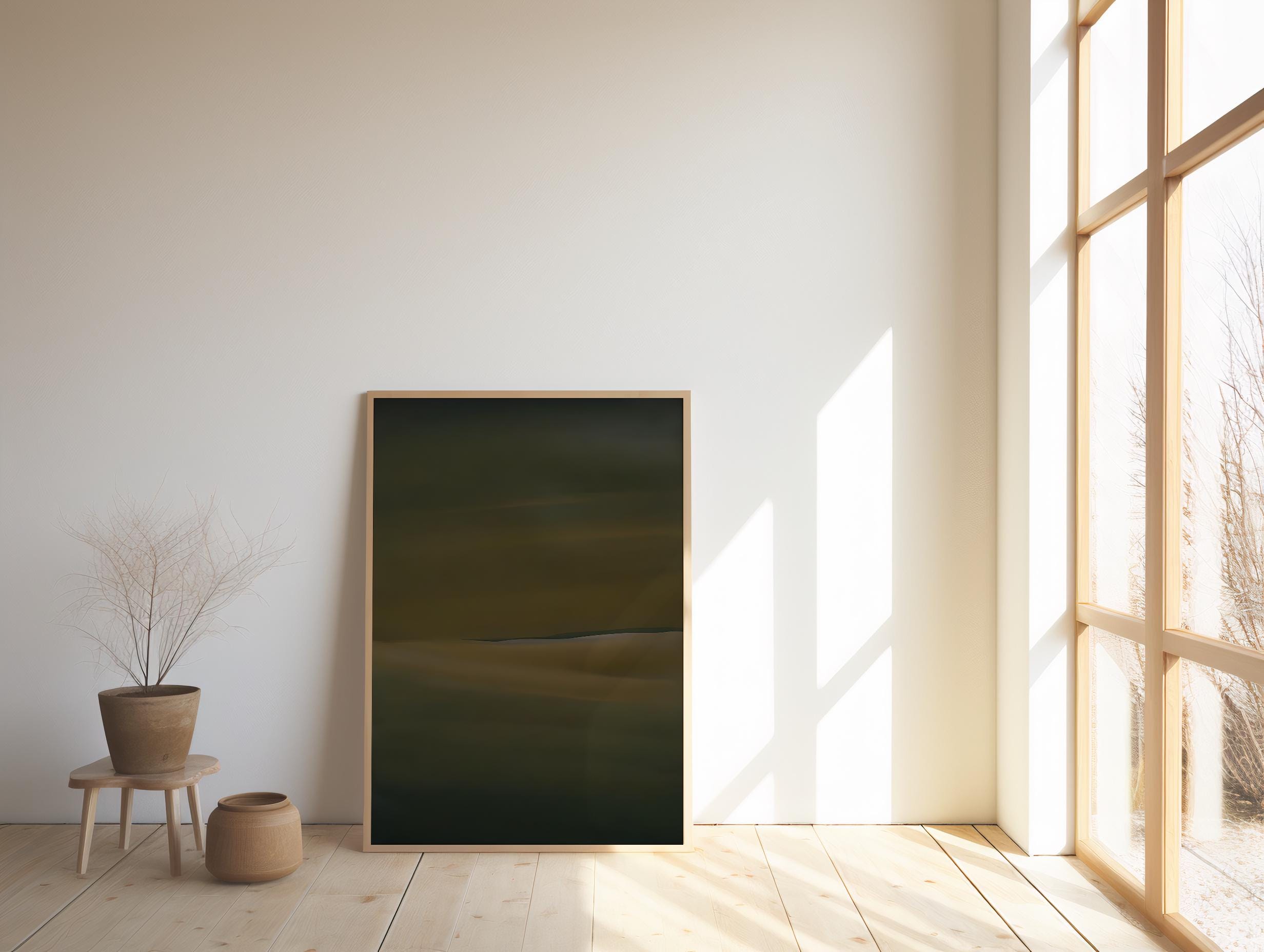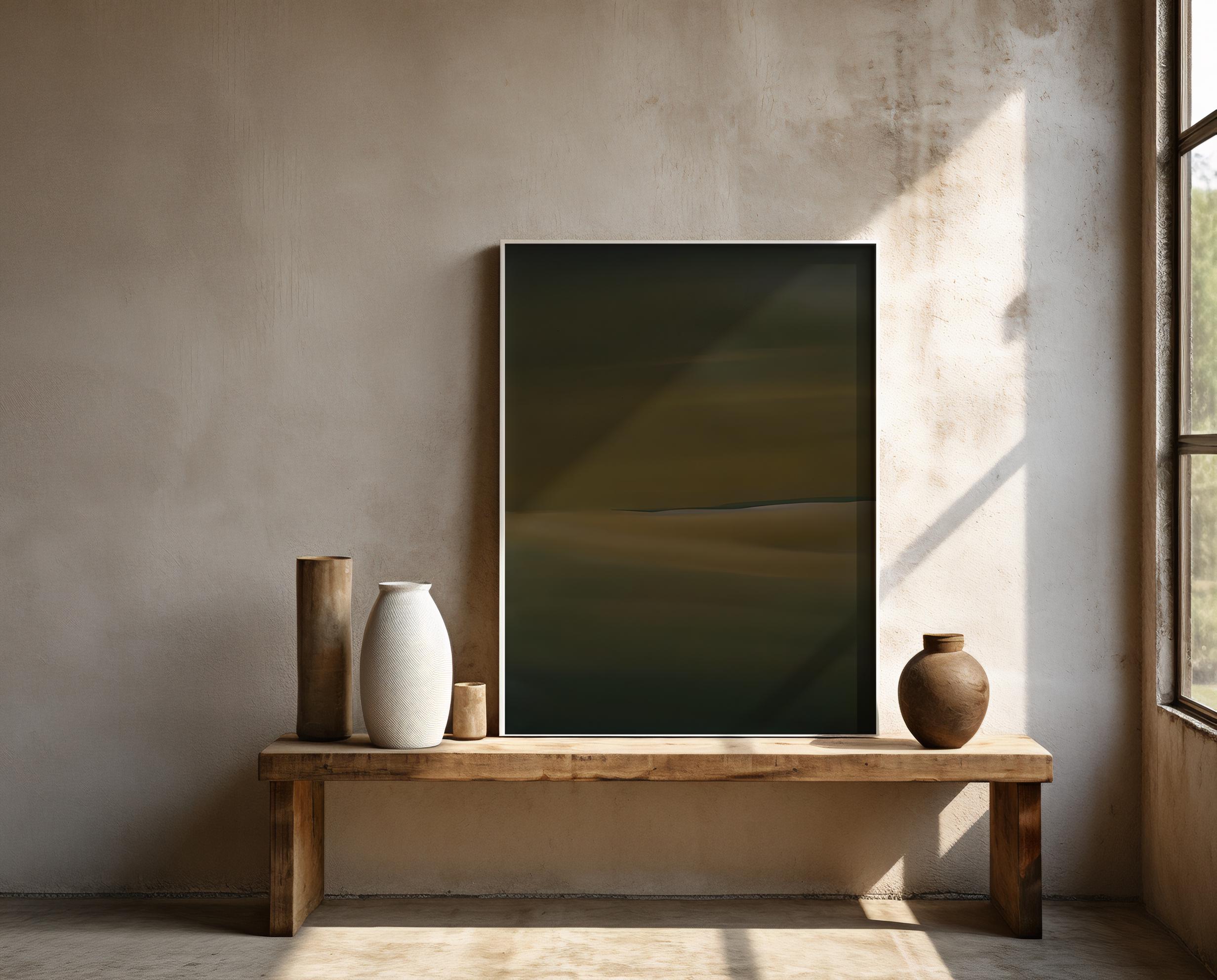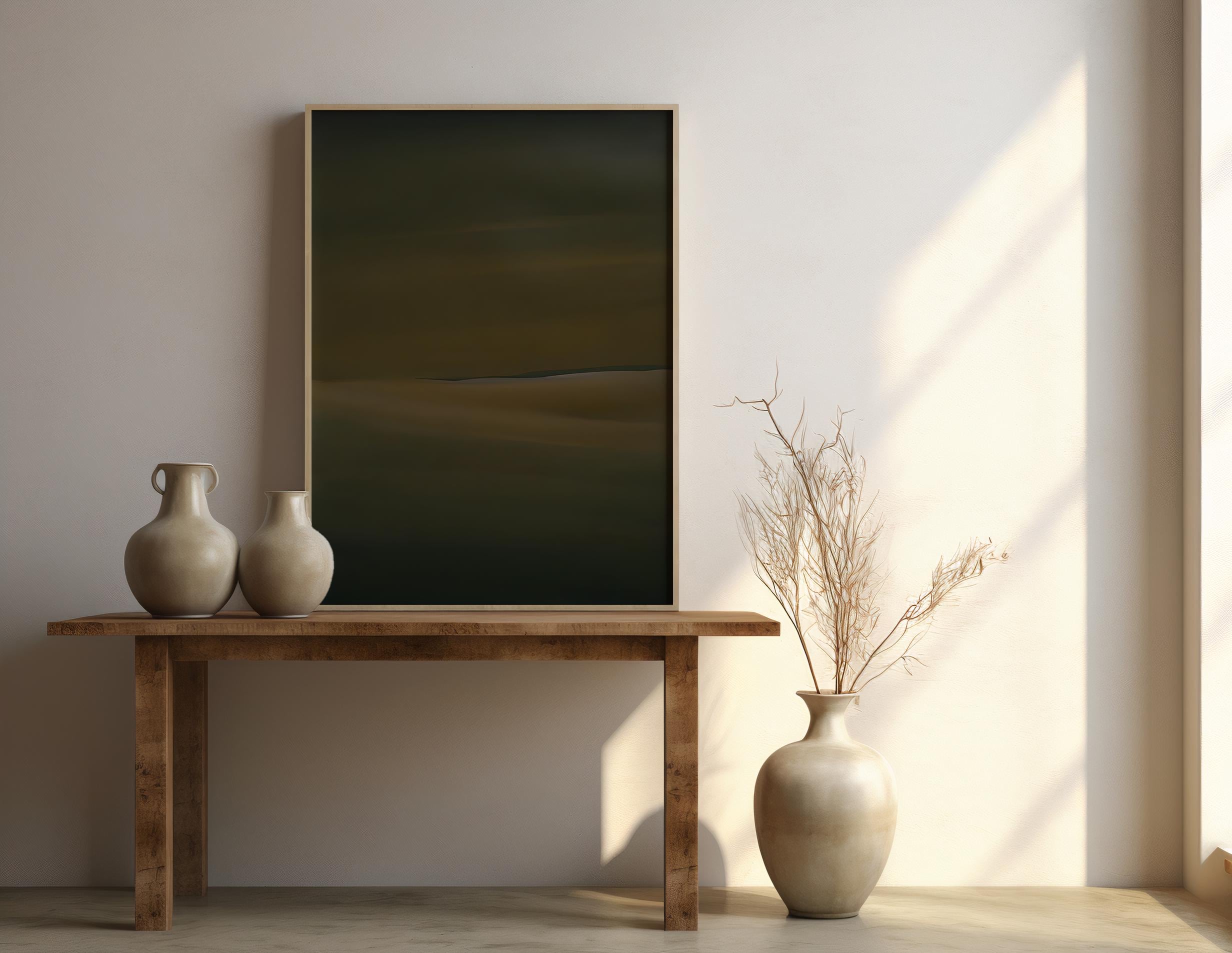 A soft, atmospheric abstract composition inspired by muted landscapes and tonal depth. Deep olive green, moss, and warm earth tones blend into a calm, horizontal flow that feels grounded, moody, and refined. Designed to bring quiet presence and balance to organic modern, Japandi, and minimalist interiors.