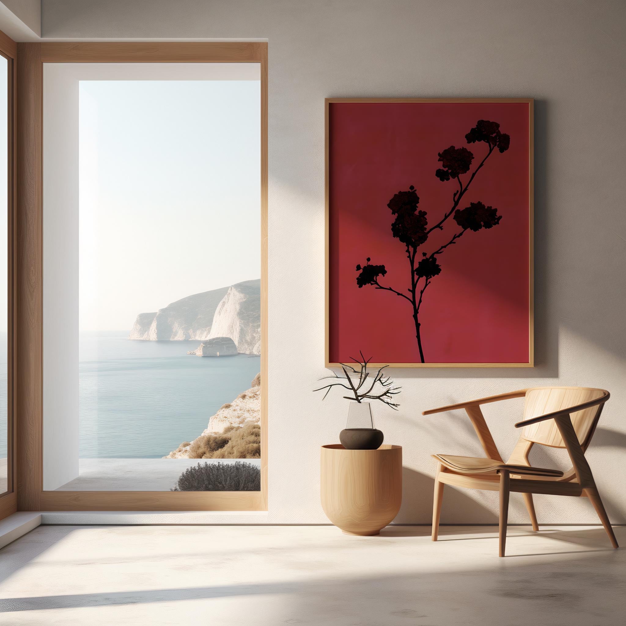 This is a digital download of a bold yet refined botanical artwork featuring a dark floral silhouette set against a rich red backdrop. The high-contrast composition feels dramatic, modern, and elegant—designed to bring depth and character to contemporary, moody, and design-forward interiors.