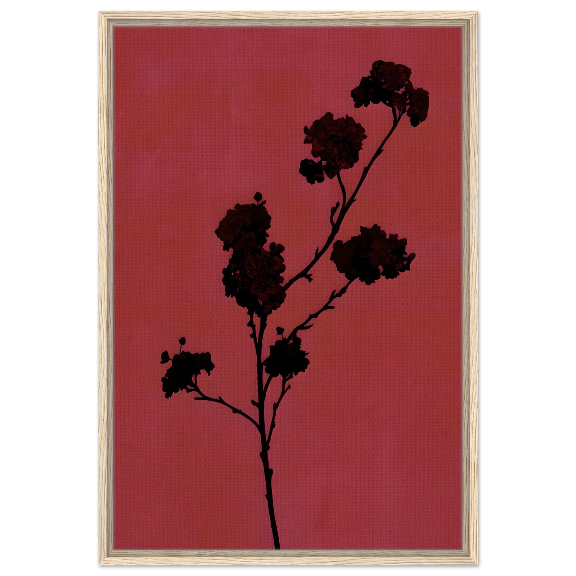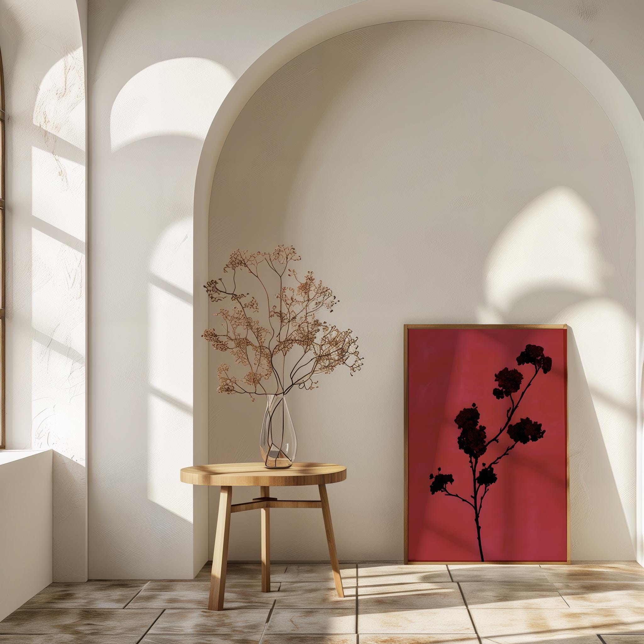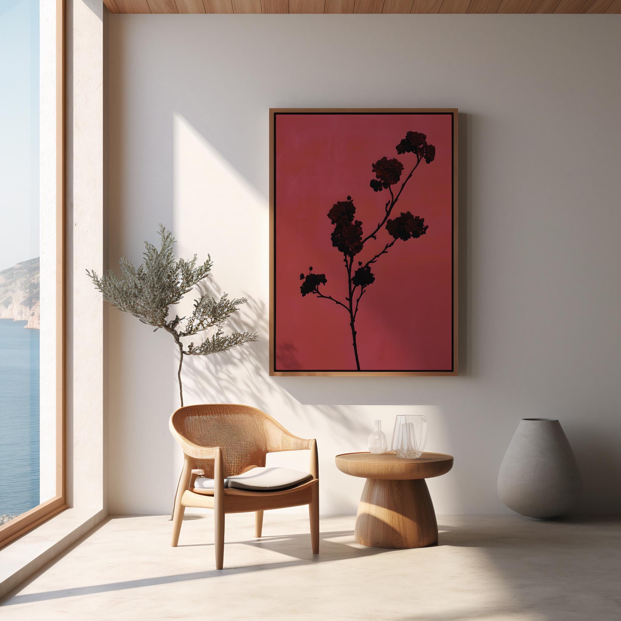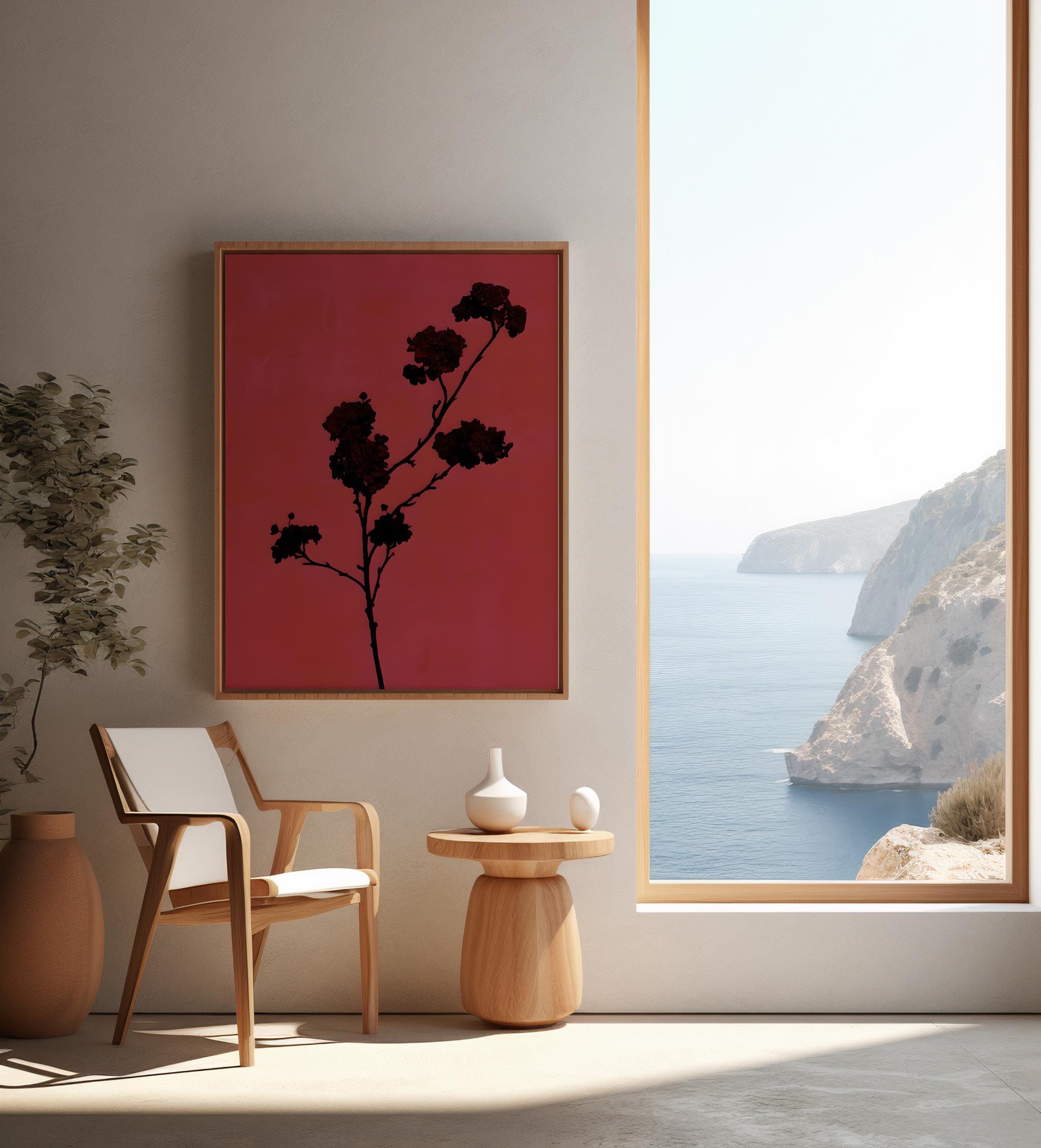 A refined botanical silhouette set against a warm red background, offering strong contrast and a clean, graphic presence. Printed on textured canvas and framed for a polished, gallery-ready finish, this piece brings confidence and clarity to contemporary, artistic, and design-forward interiors.