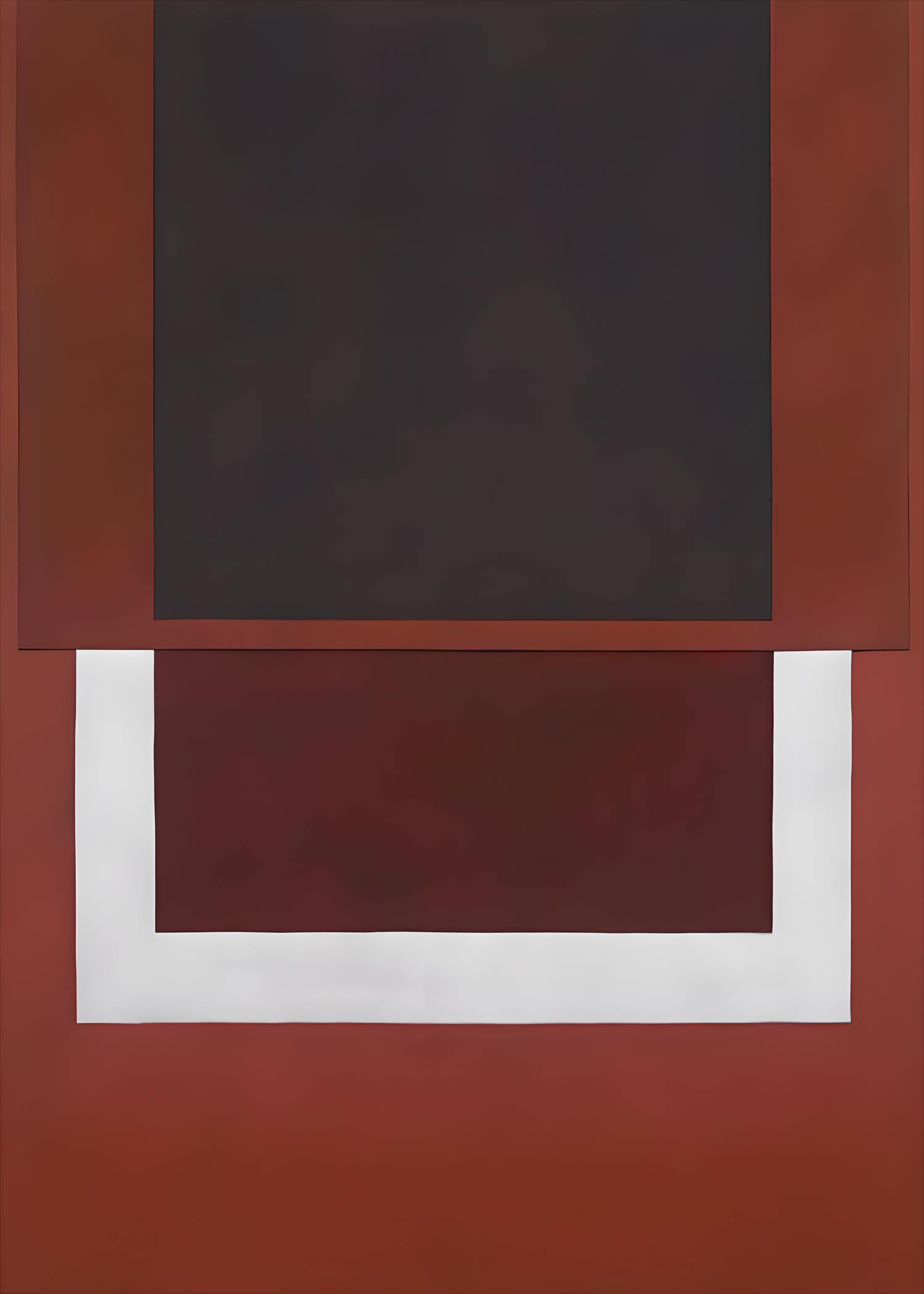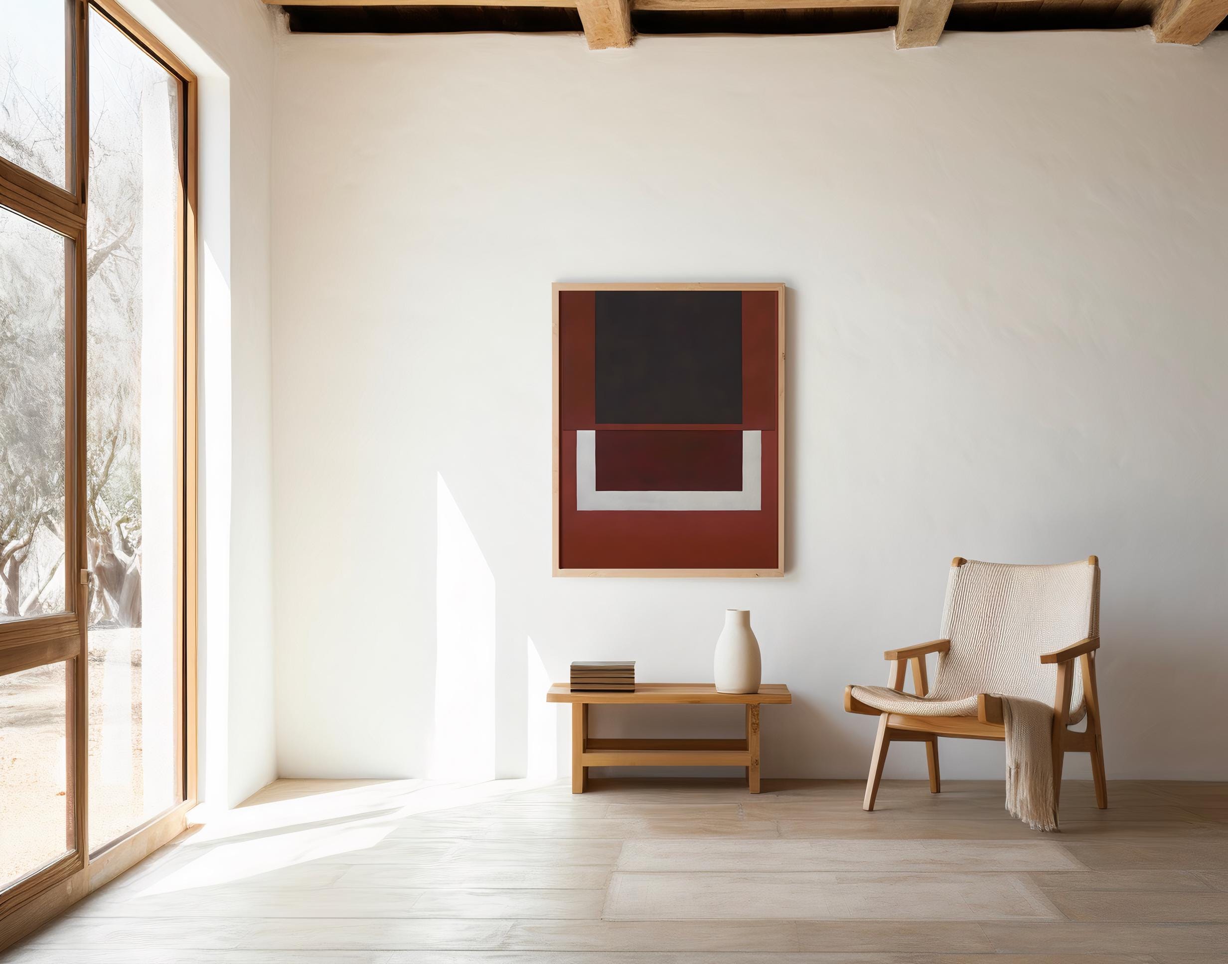 A bold, minimalist abstract composition featuring deep red tones, rich black contrast, and clean geometric balance. Moody, modern, and architectural — designed to anchor a space and create a strong visual statement without feeling busy.