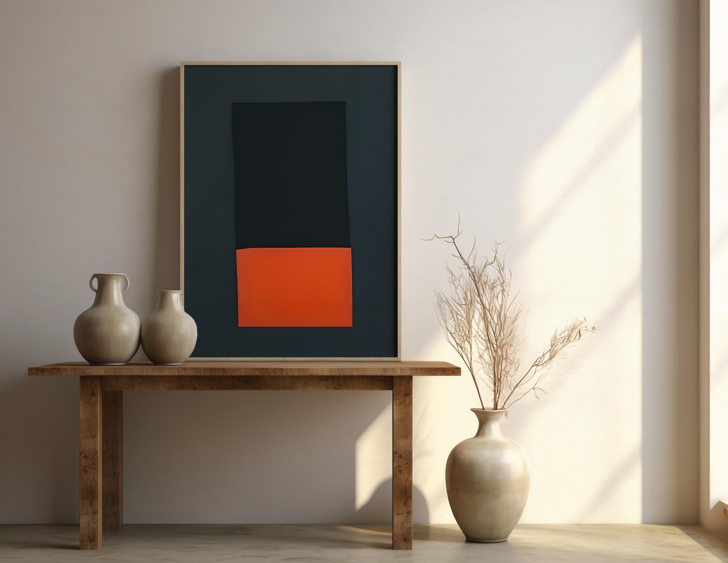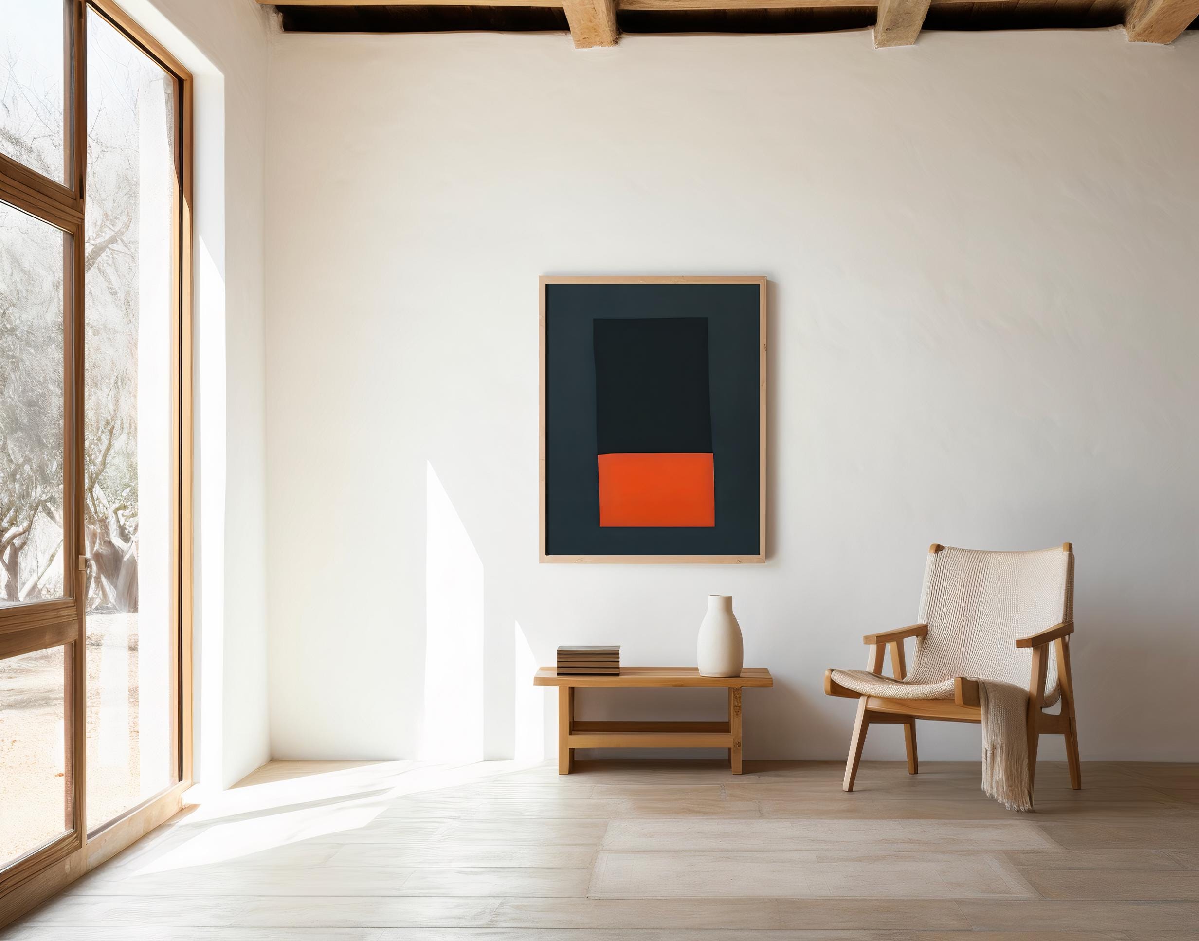 A bold, minimalist abstract composition featuring deep dark blue slate tones contrasted with a vivid orange block. Moody, architectural, and refined, this piece is designed to ground a space and create a strong visual statement without overwhelming the room.