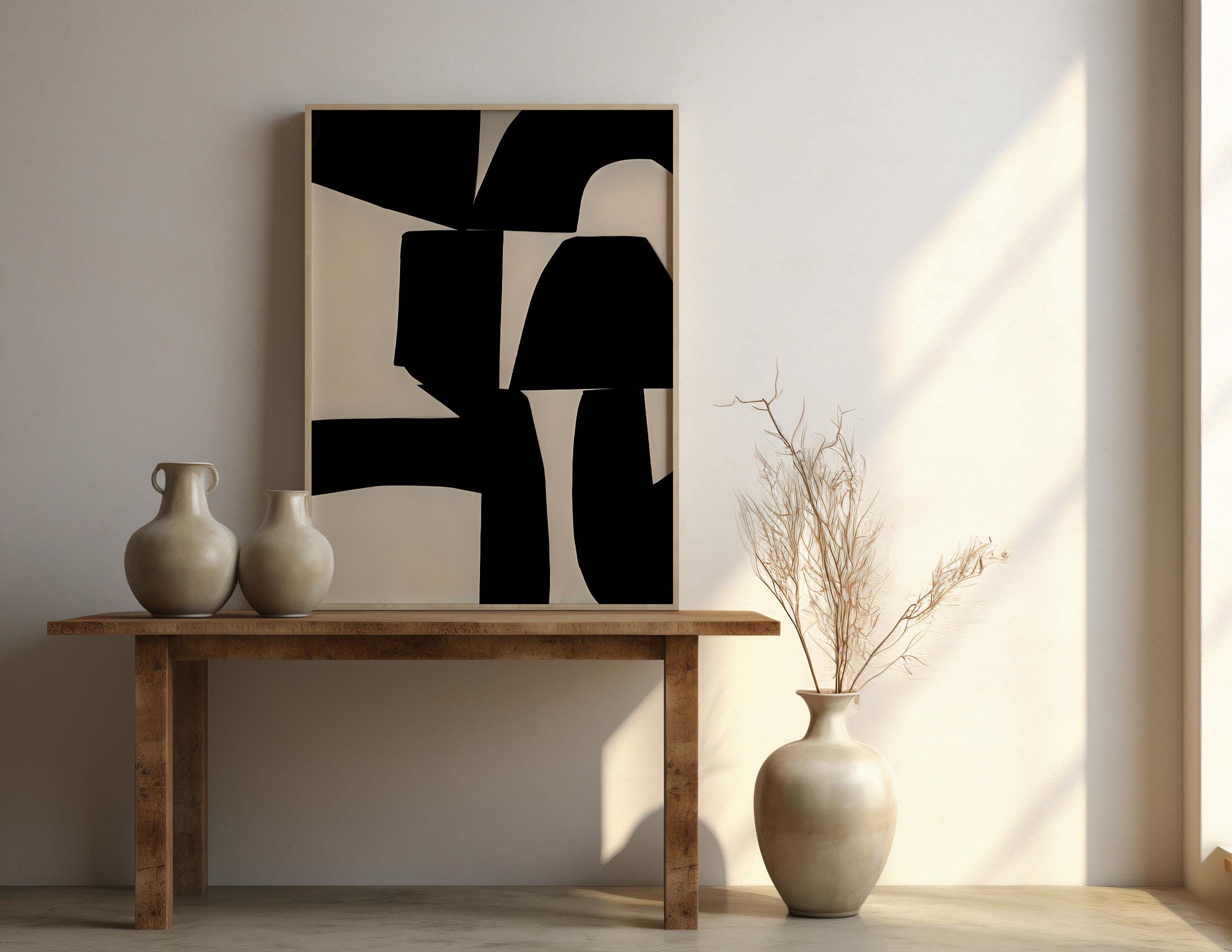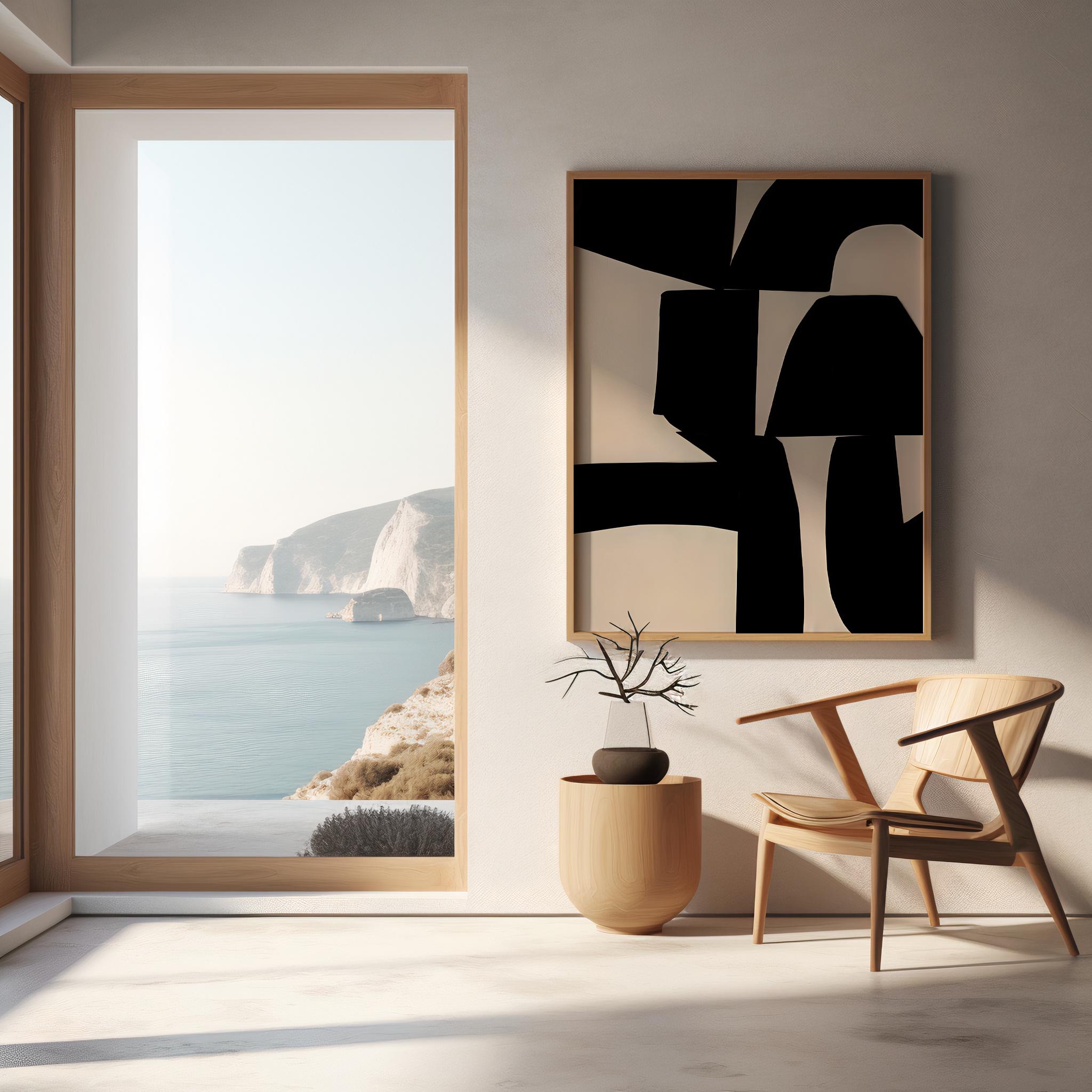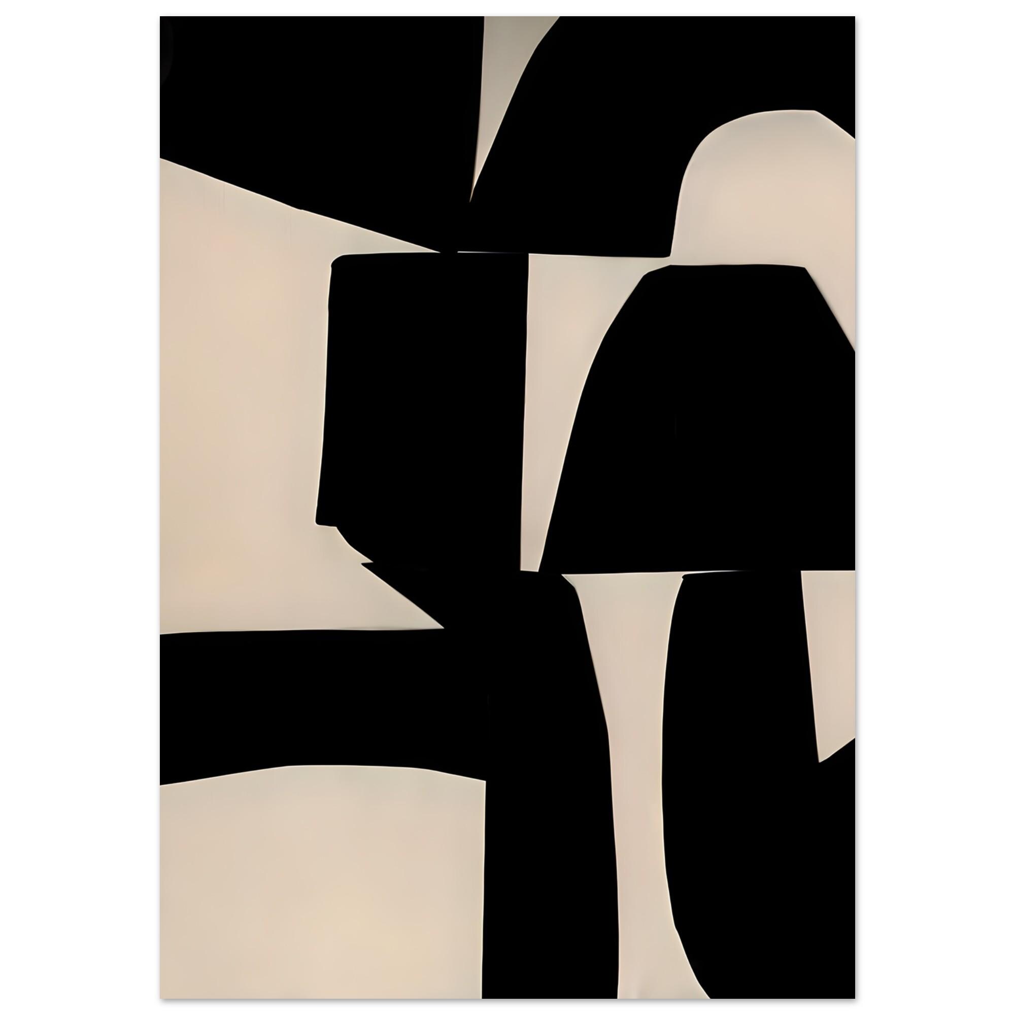 A bold abstract composition defined by deep black forms and warm ivory shapes arranged in a striking, architectural layout. Designed to feel graphic, intentional, and modern, this piece brings contrast and visual structure to contemporary interiors.