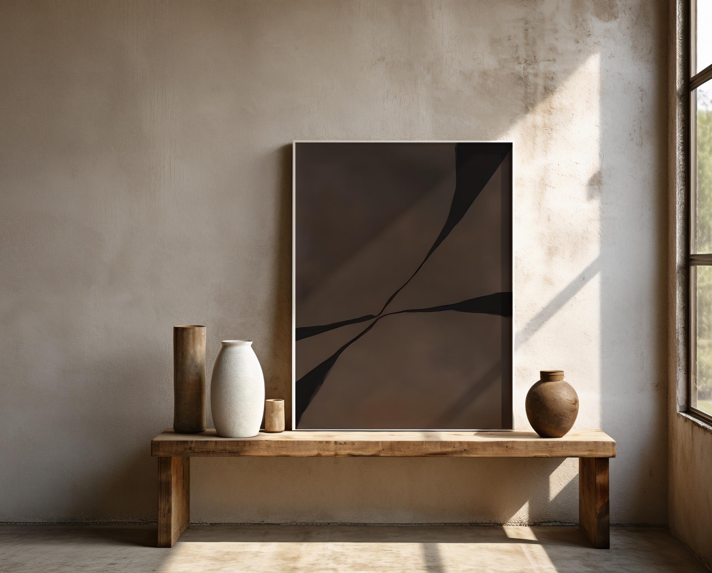 A bold abstract composition defined by deep chocolate brown tones intersected with fluid black forms. The organic yet architectural structure creates tension, movement, and depth, making this piece feel sculptural and intentional rather than ornamental.