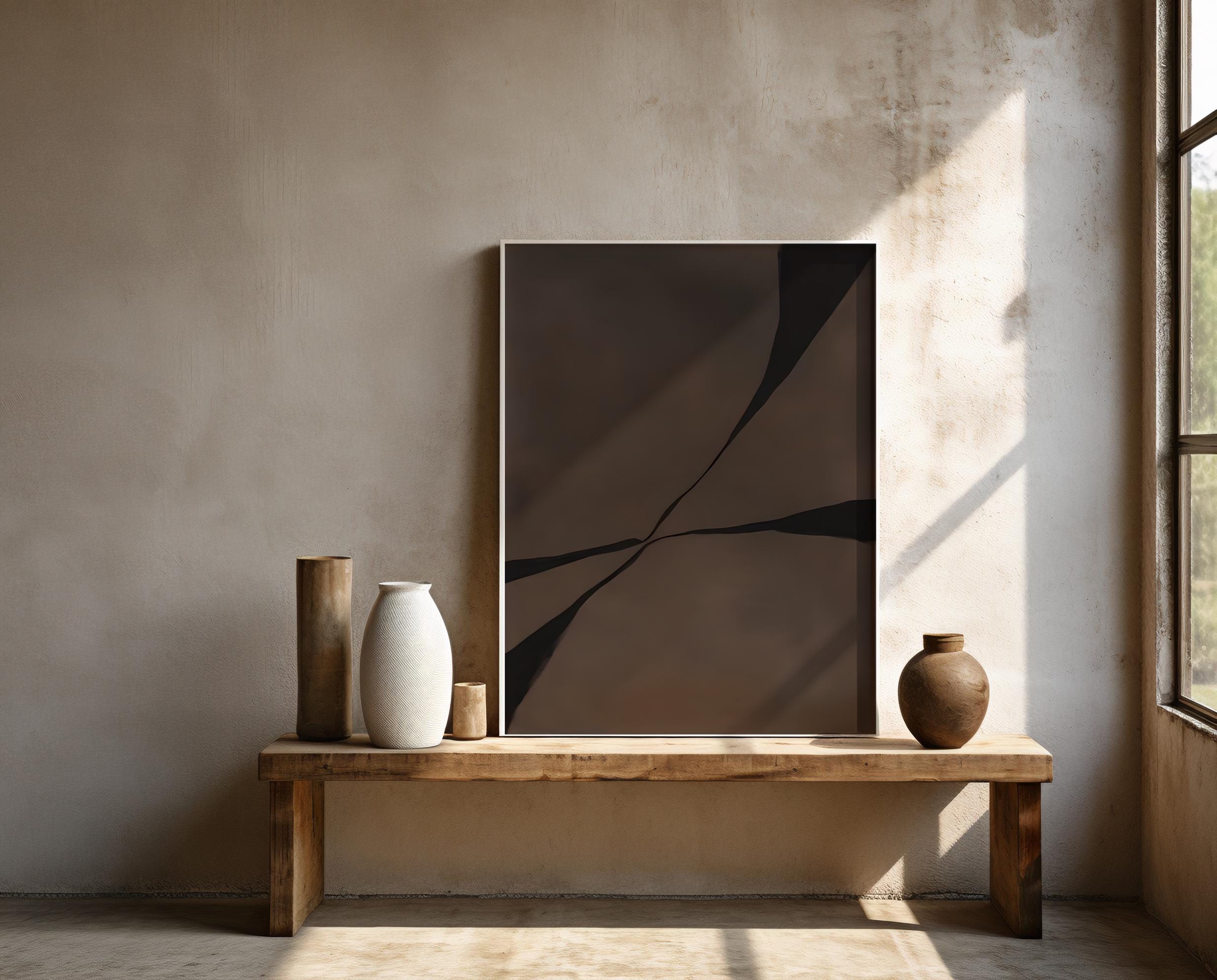 A bold architectural abstract composition defined by deep brown tones and intersecting black forms. The organic yet structured layout creates tension, movement, and depth, giving the piece a sculptural presence that feels intentional and refined.