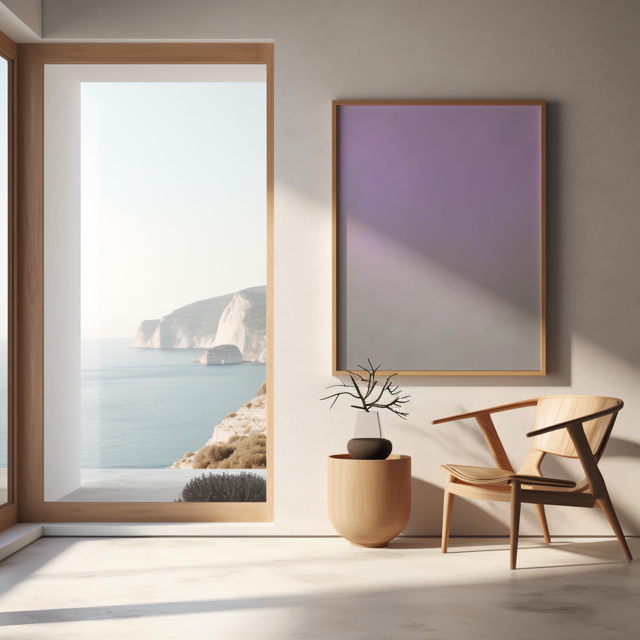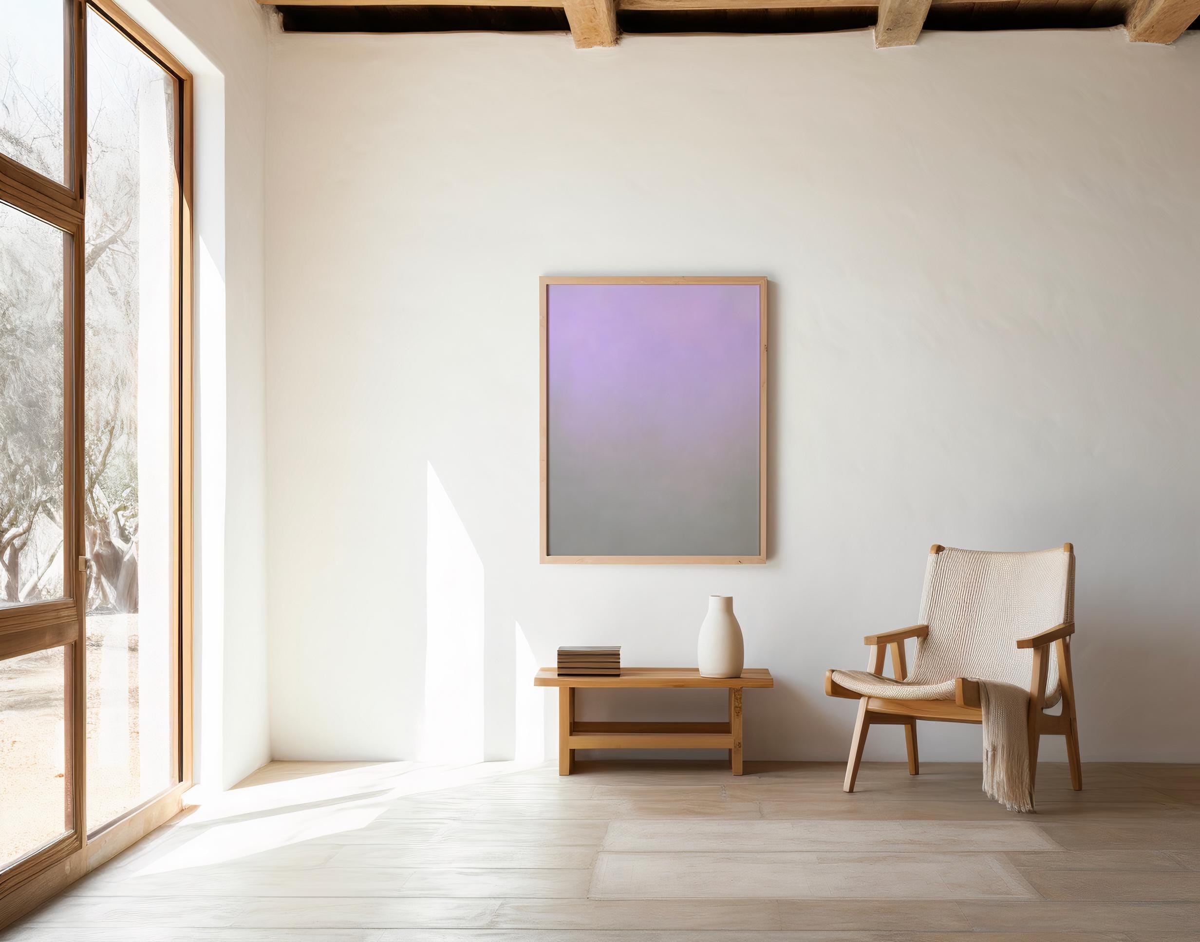 A serene gradient artwork blending soft lilac tones into warm gray neutrals, framed and ready to hang. This minimalist abstract piece brings a calm, airy presence to a space, making it ideal for modern, organic modern, and spa-inspired interiors.