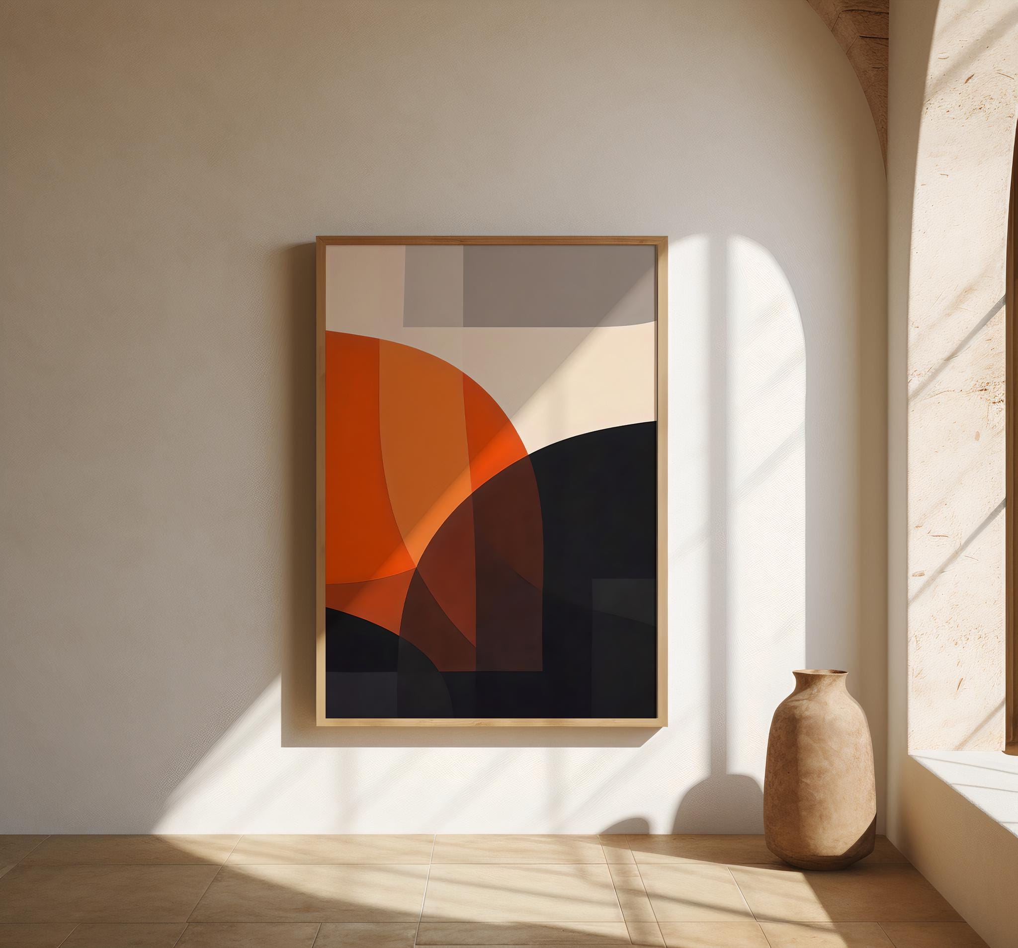 A bold geometric abstract artwork featuring layered arcs and architectural forms in burnt orange, charcoal black, warm beige, and soft taupe. This composition balances warmth and contrast, creating a striking yet refined statement that feels modern, intentional, and design-forward.