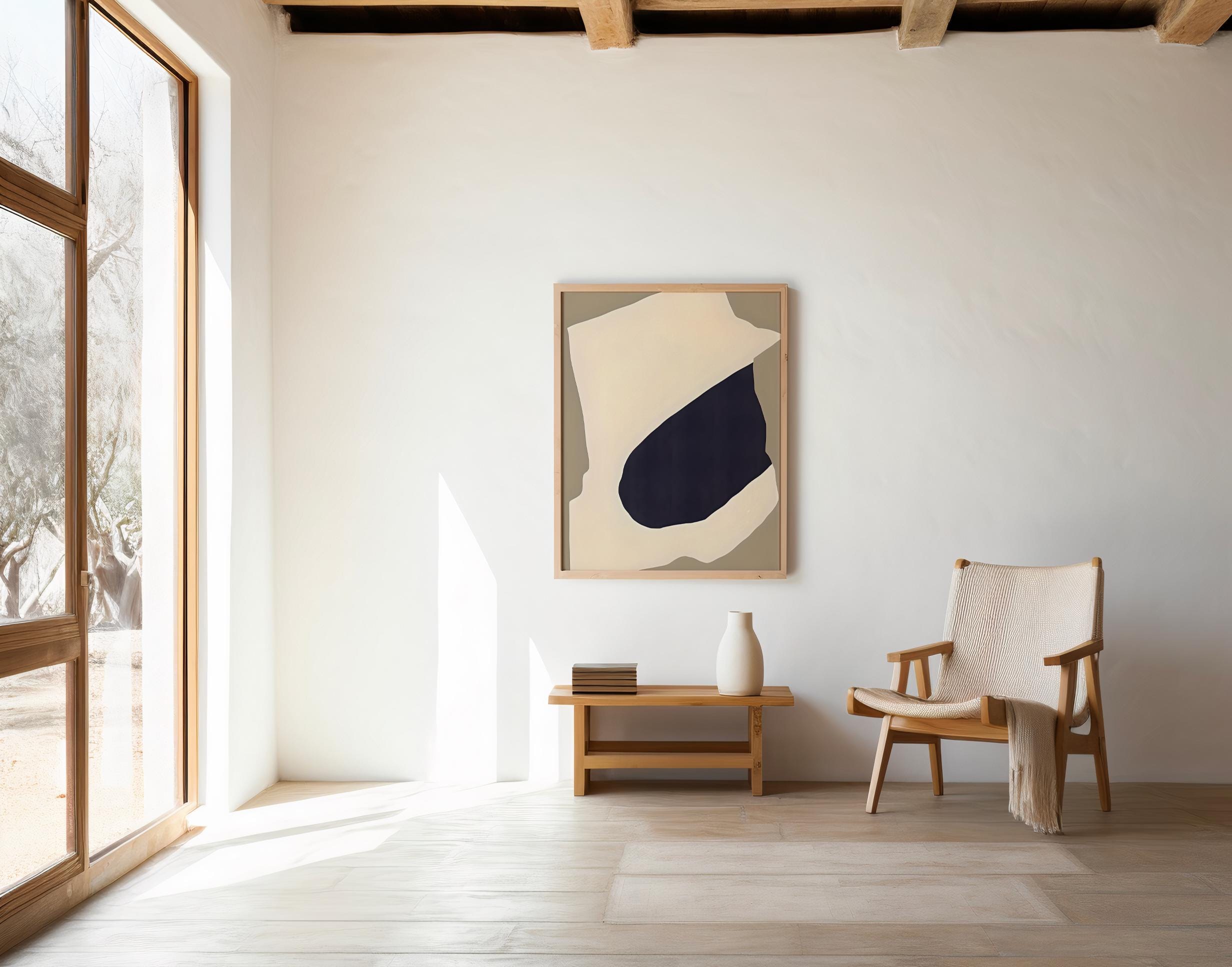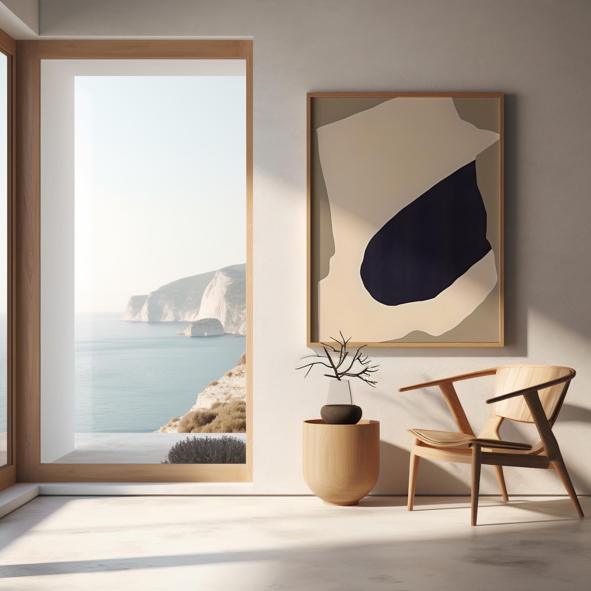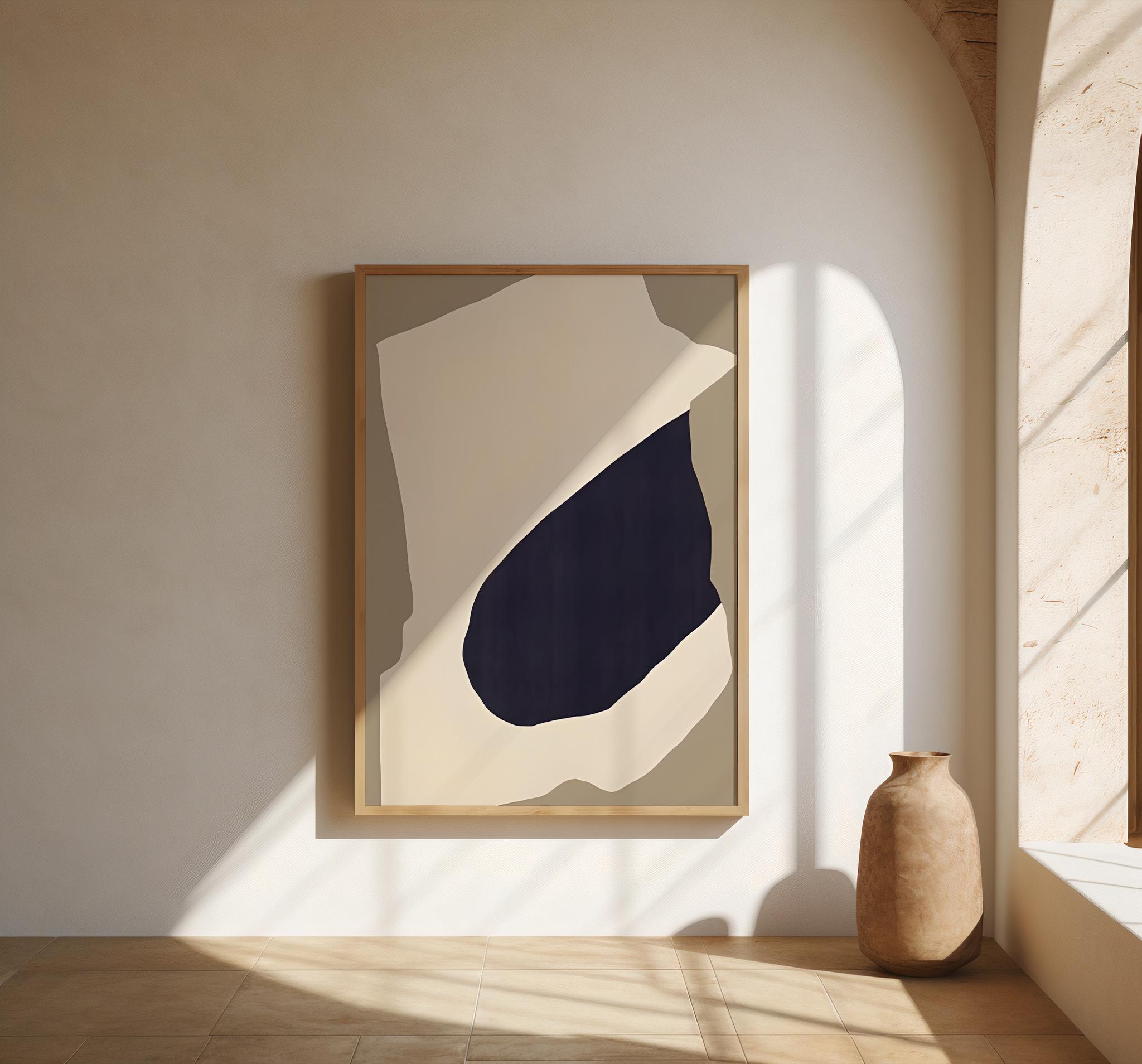 This modern abstract composition features soft neutral tones layered with an organic deep navy form, creating a balanced yet striking visual statement. Designed to complement organic modern, Japandi, and minimalist interiors, this piece adds depth and calm without overpowering a space.