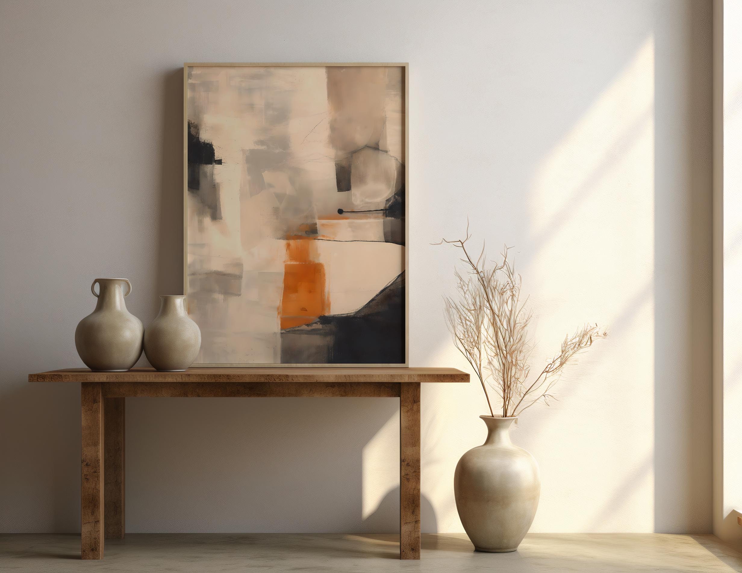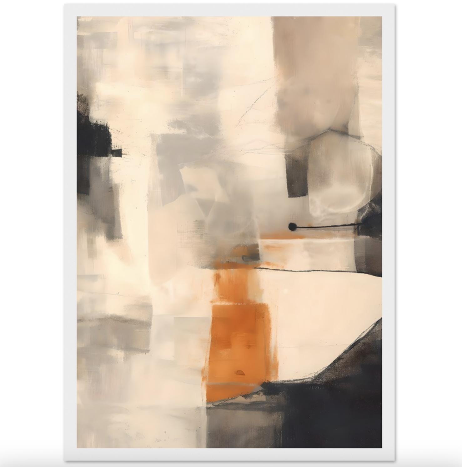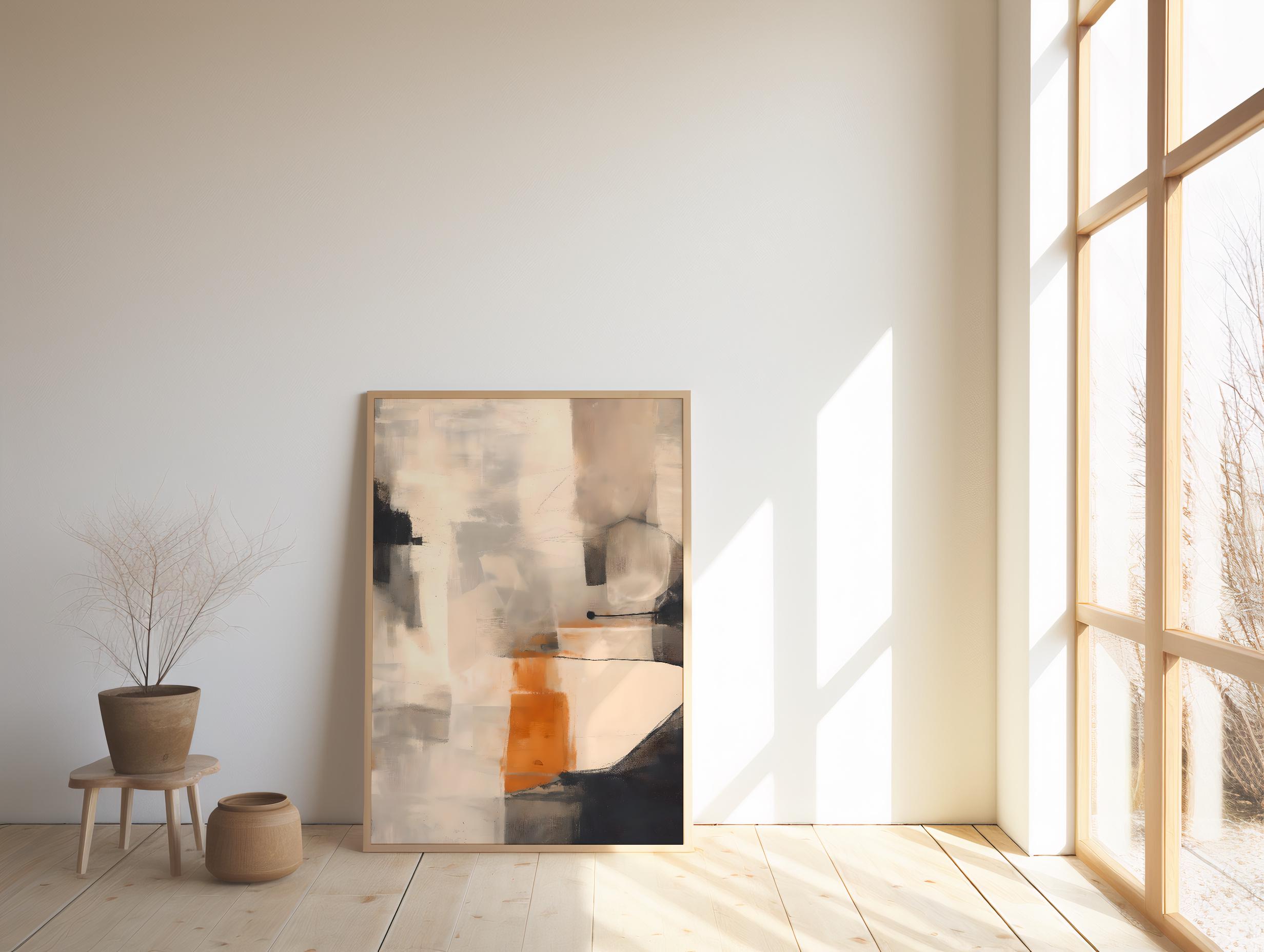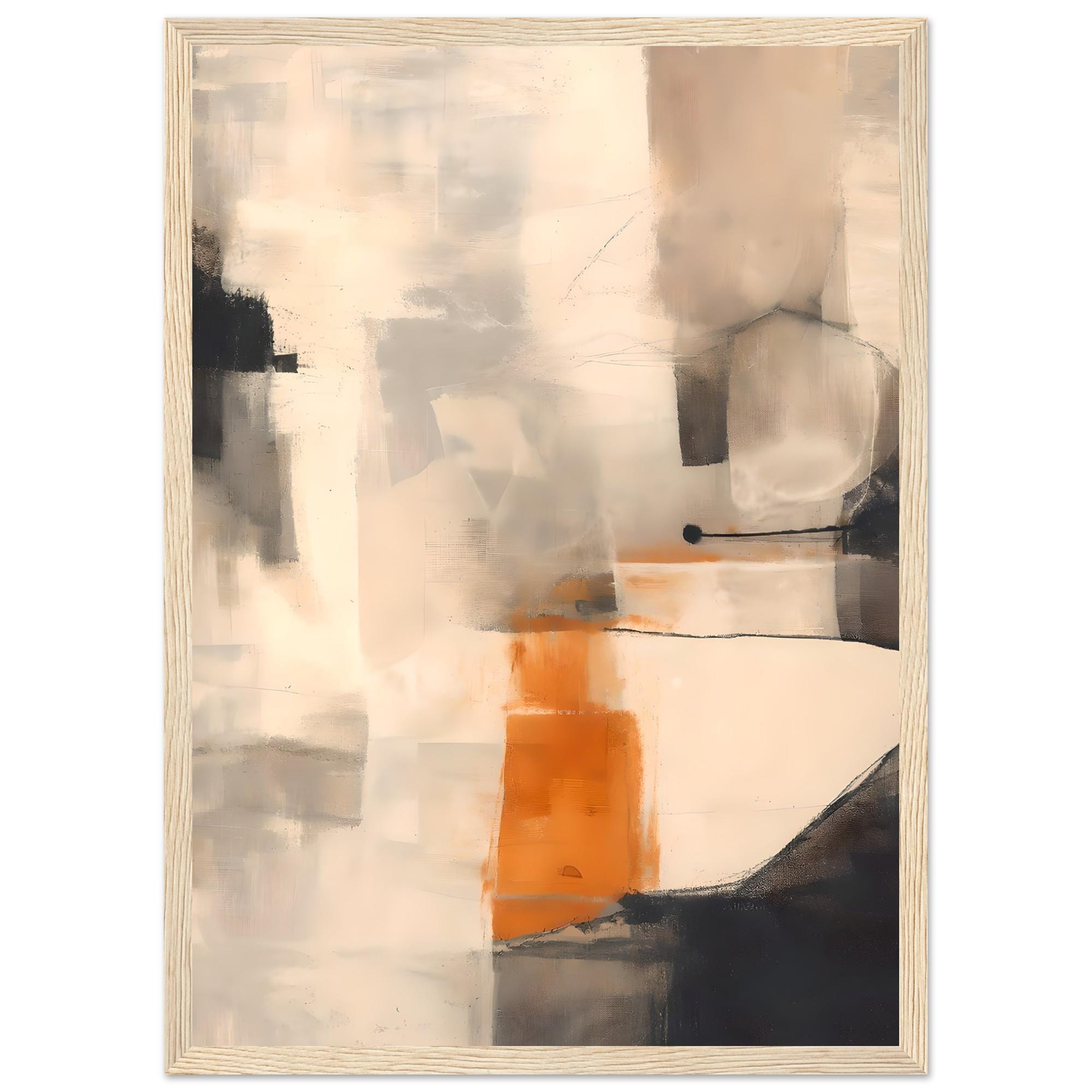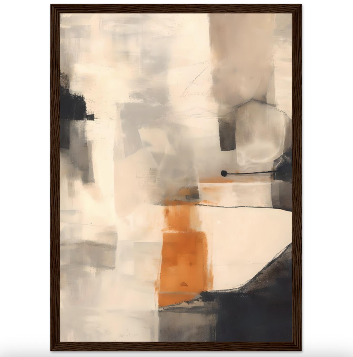 A refined abstract artwork featuring layered warm neutrals, soft creams, taupe, charcoal tones, and a subtle orange accent—professionally framed and ready to hang. This piece feels painterly yet architectural, bringing depth, warmth, and quiet sophistication into a space.