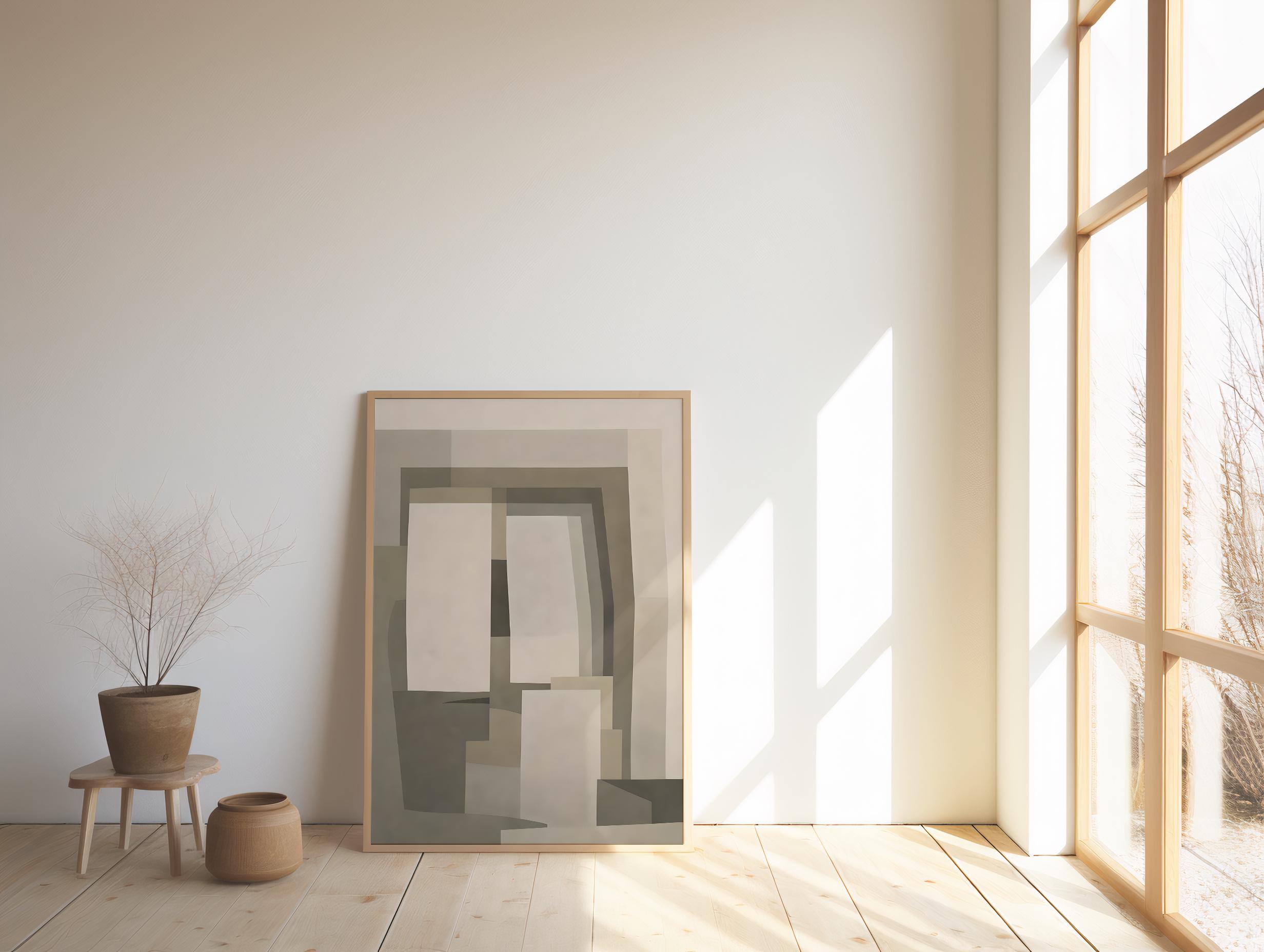 A refined geometric abstract artwork composed of layered architectural forms in warm beige, taupe, sand, and soft stone tones. Designed to feel calm, elevated, and intentional, this piece brings quiet structure and visual depth to modern interiors without overpowering the space.