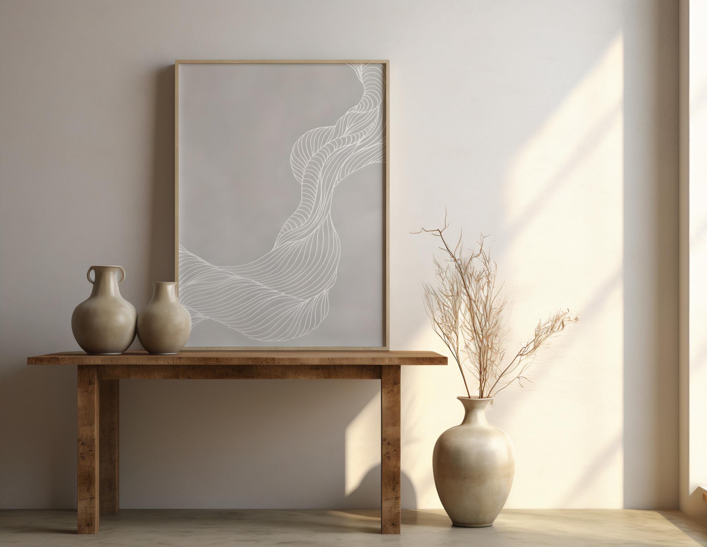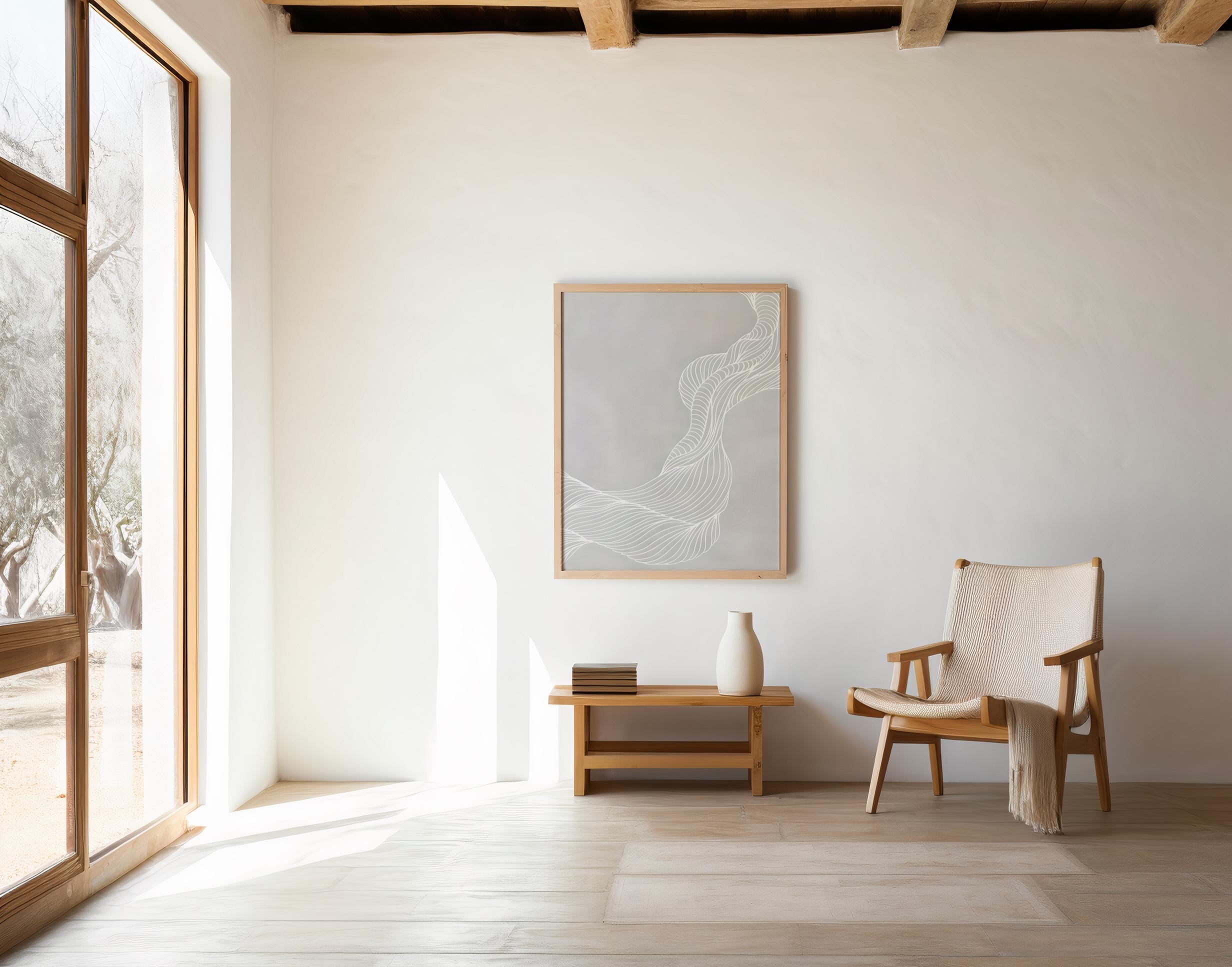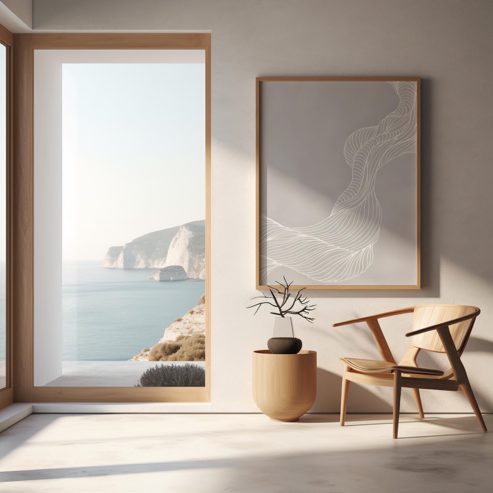 This minimalist abstract framed poster features soft neutral tones and flowing organic linework, designed to bring calm movement and quiet sophistication into refined interiors. Subtle yet architectural, this piece elevates a space instantly—perfect for collectors and designers seeking timeless, gallery-ready wall art.