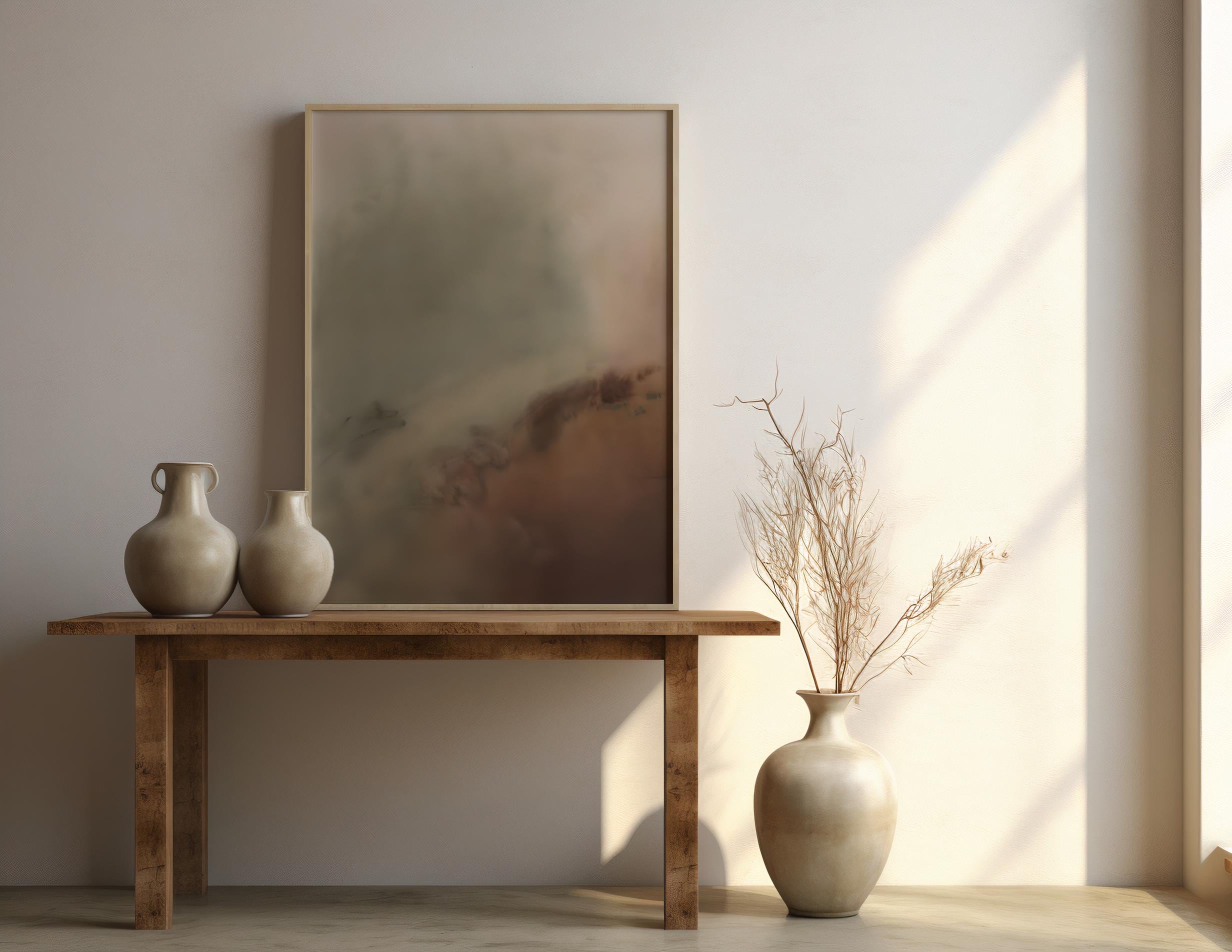 This fine art poster features a soft abstract landscape with warm earth tones and muted neutrals, designed to elevate modern interiors with a calm, curated feel. The composition blends organic movement with a minimal aesthetic—perfect for today’s most searched interior styles.