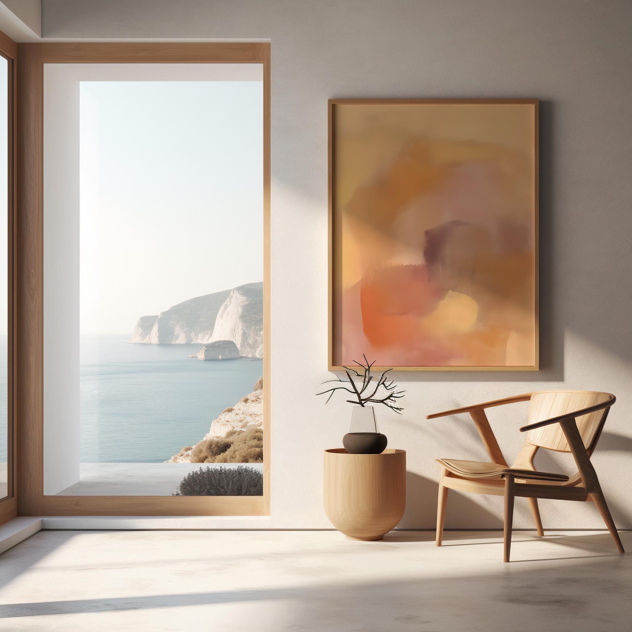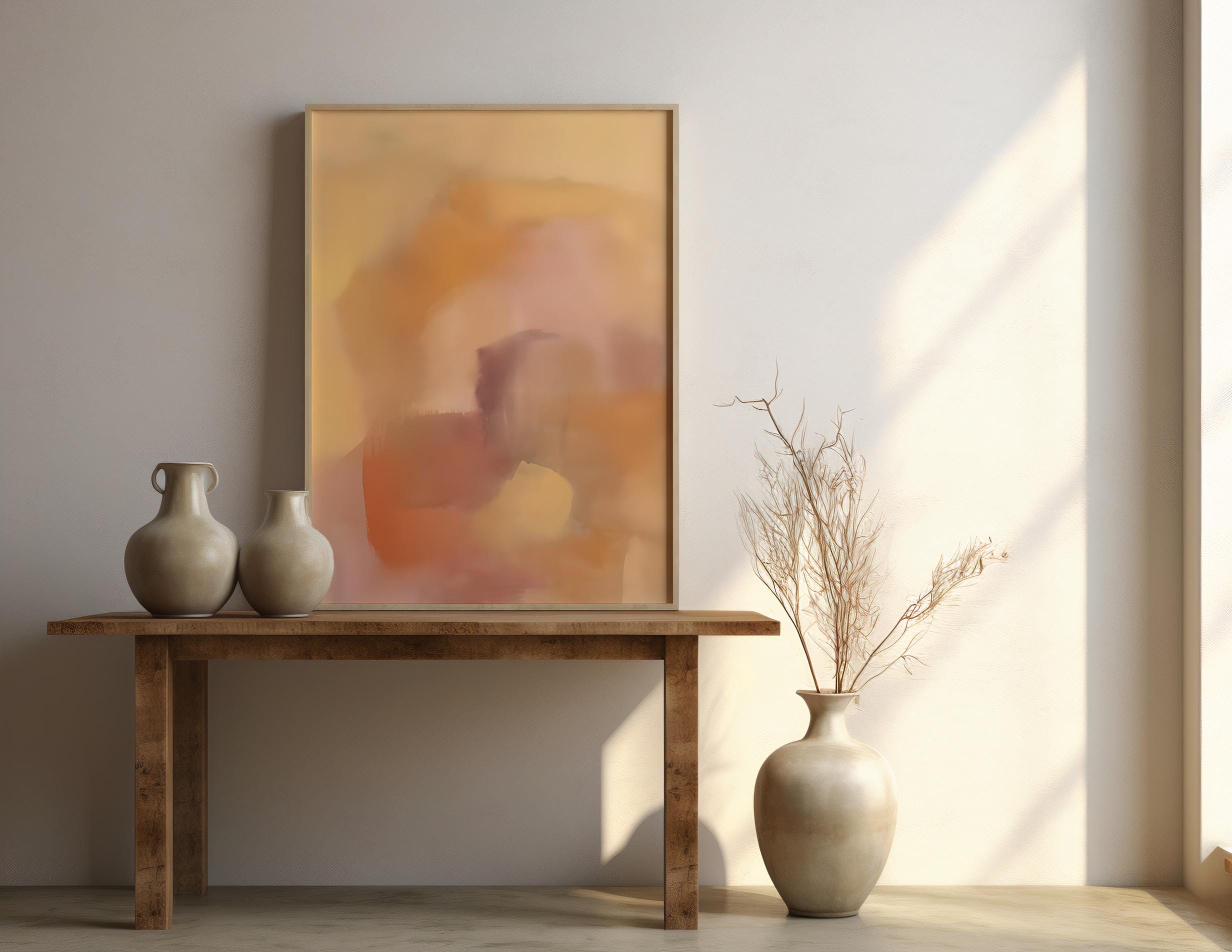 This framed abstract wall art features warm peach, apricot, blush, and golden sunset tones layered in a soft, atmospheric composition. Designed to feel airy yet elevated, this piece aligns perfectly with today’s most in-demand decor styles—organic modern, Japandi, warm minimalism, and curated designer interiors.