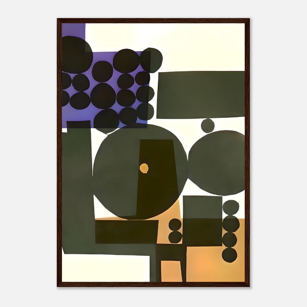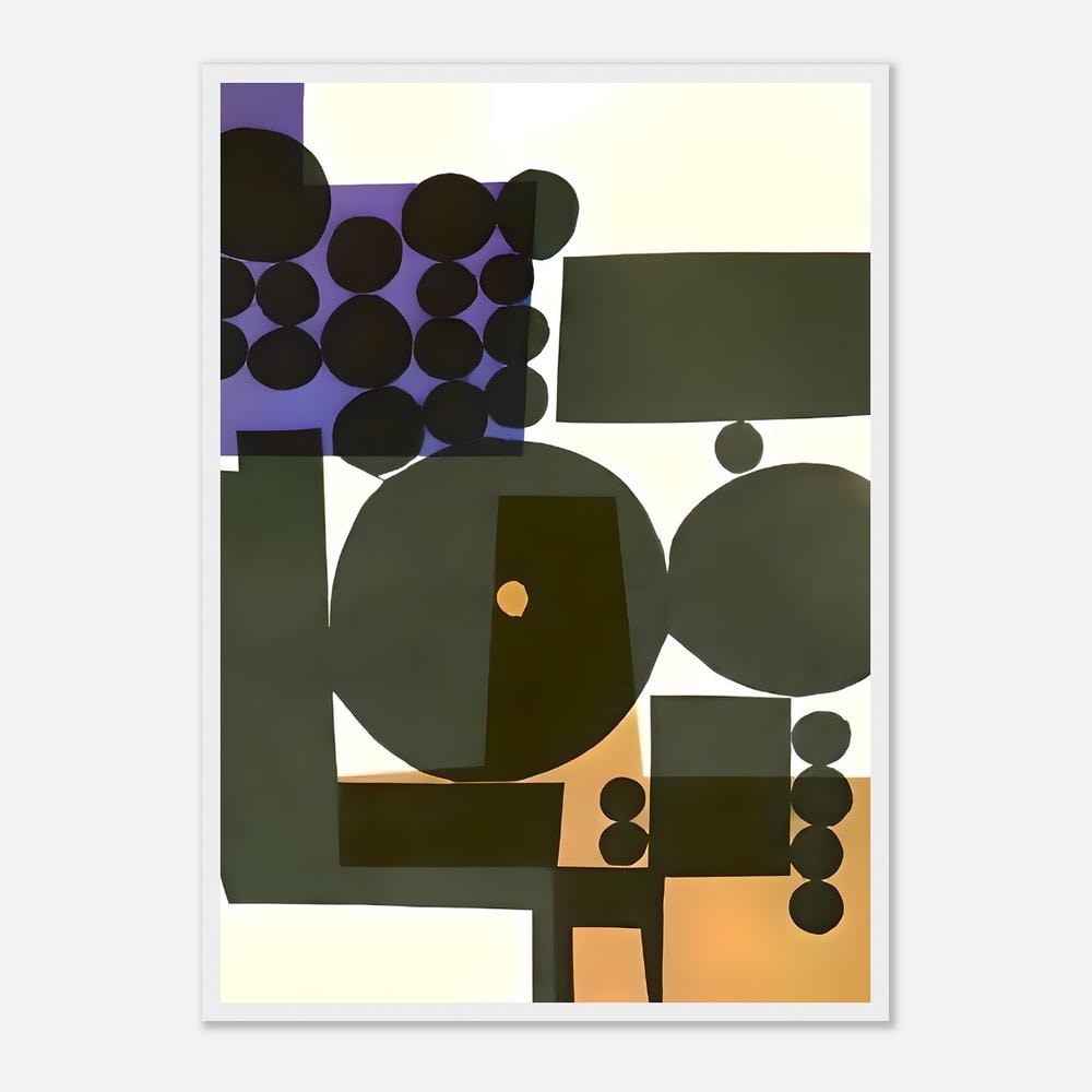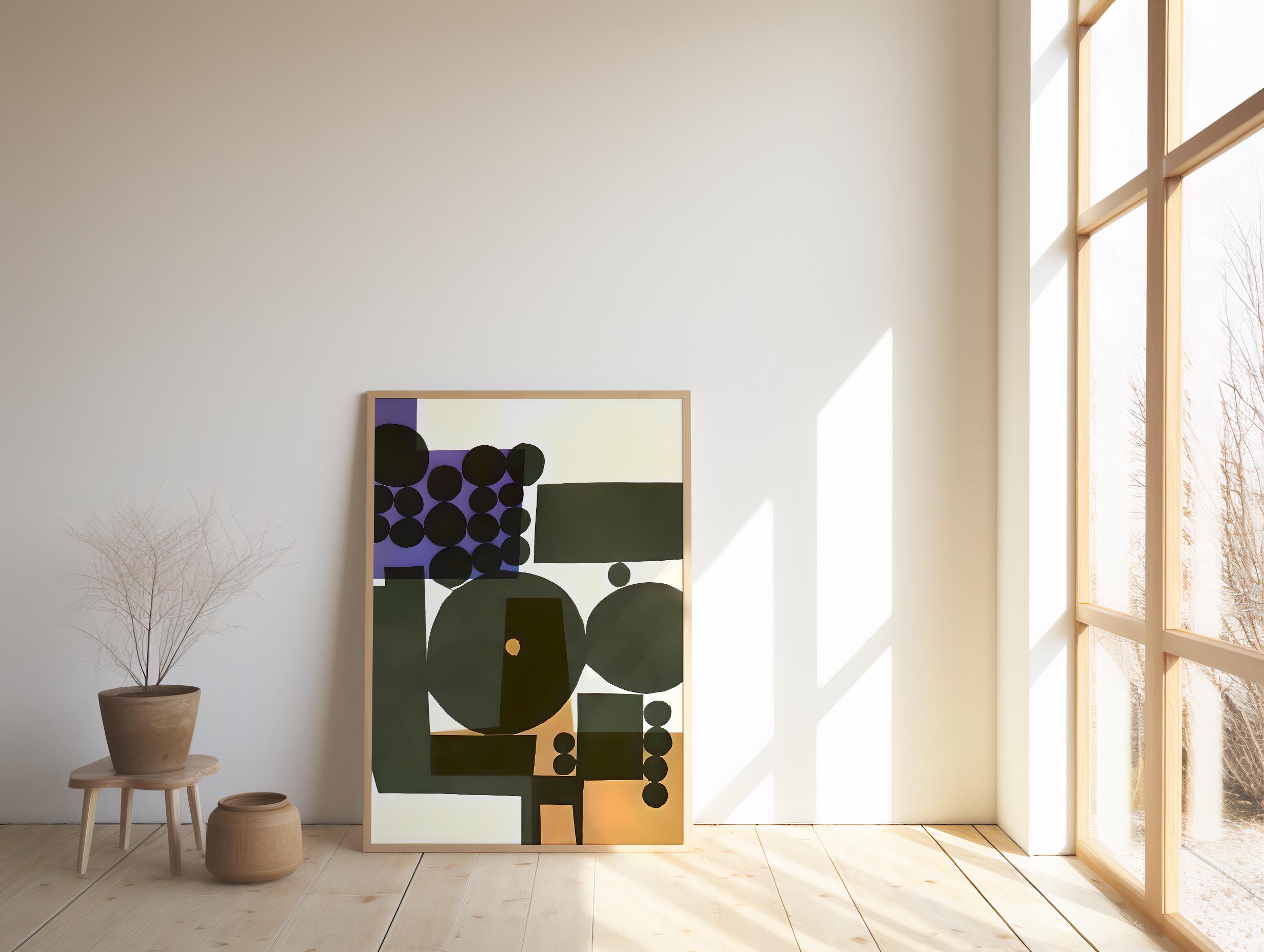 This modern abstract artwork is professionally printed and framed, ready to hang. Bold geometric forms in deep charcoal, olive green, muted lavender, and warm ochre create a sculptural, architectural composition with strong contrast and layered depth.