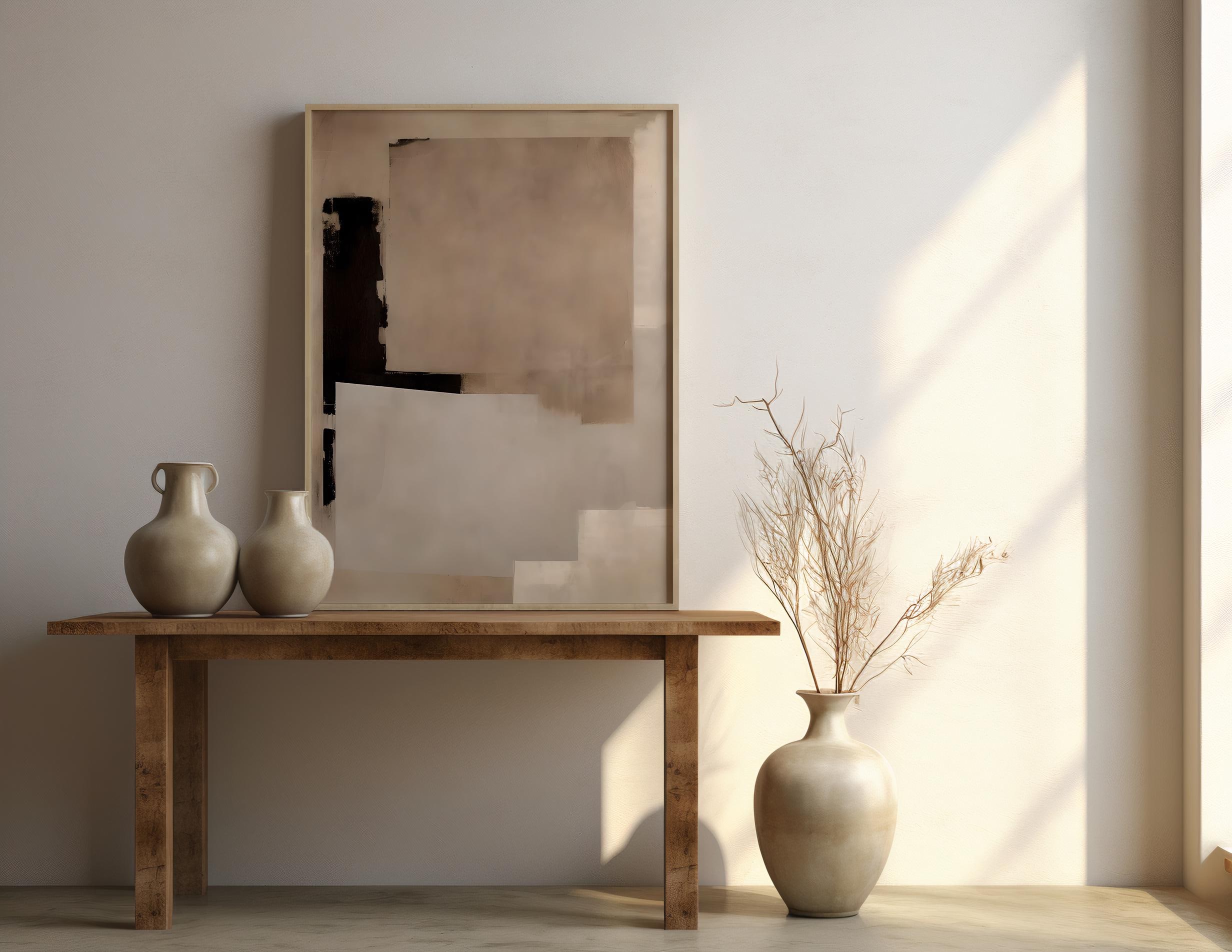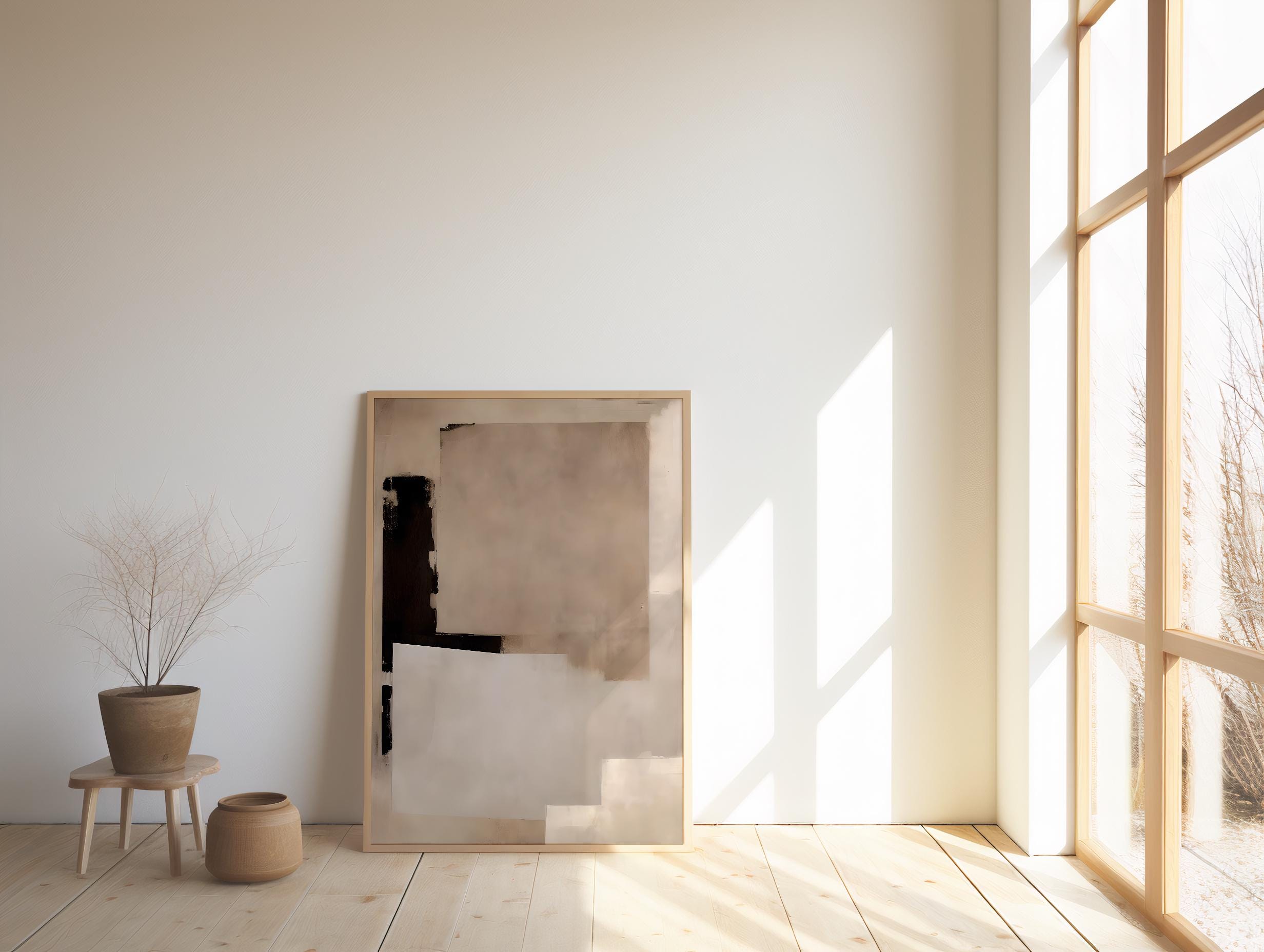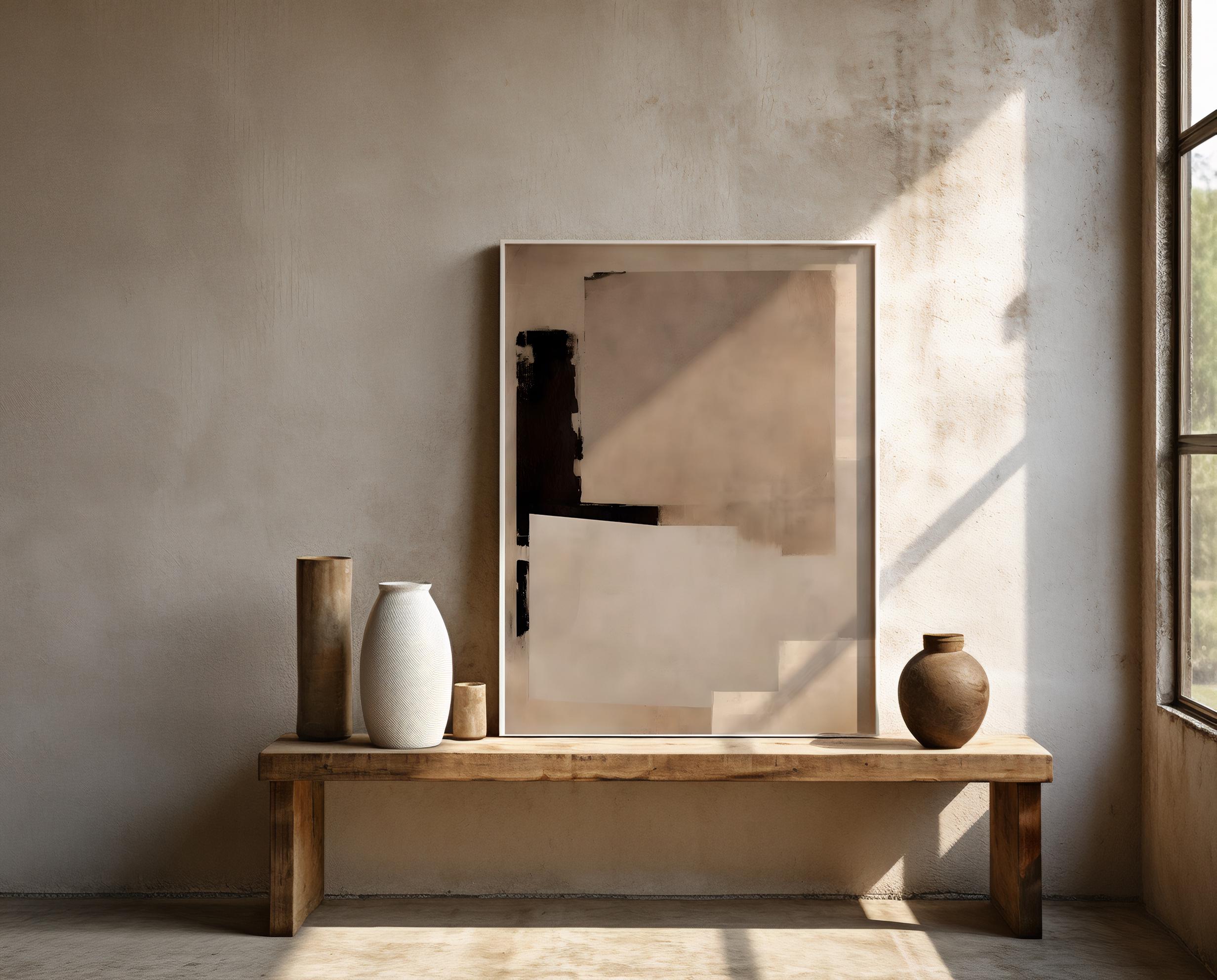 A refined neutral abstract composition featuring layered beige, warm taupe, and deep espresso accents. The architectural blocking and soft tonal gradients create a grounded, organic statement piece inspired by wabi sabi and Japandi design principles.