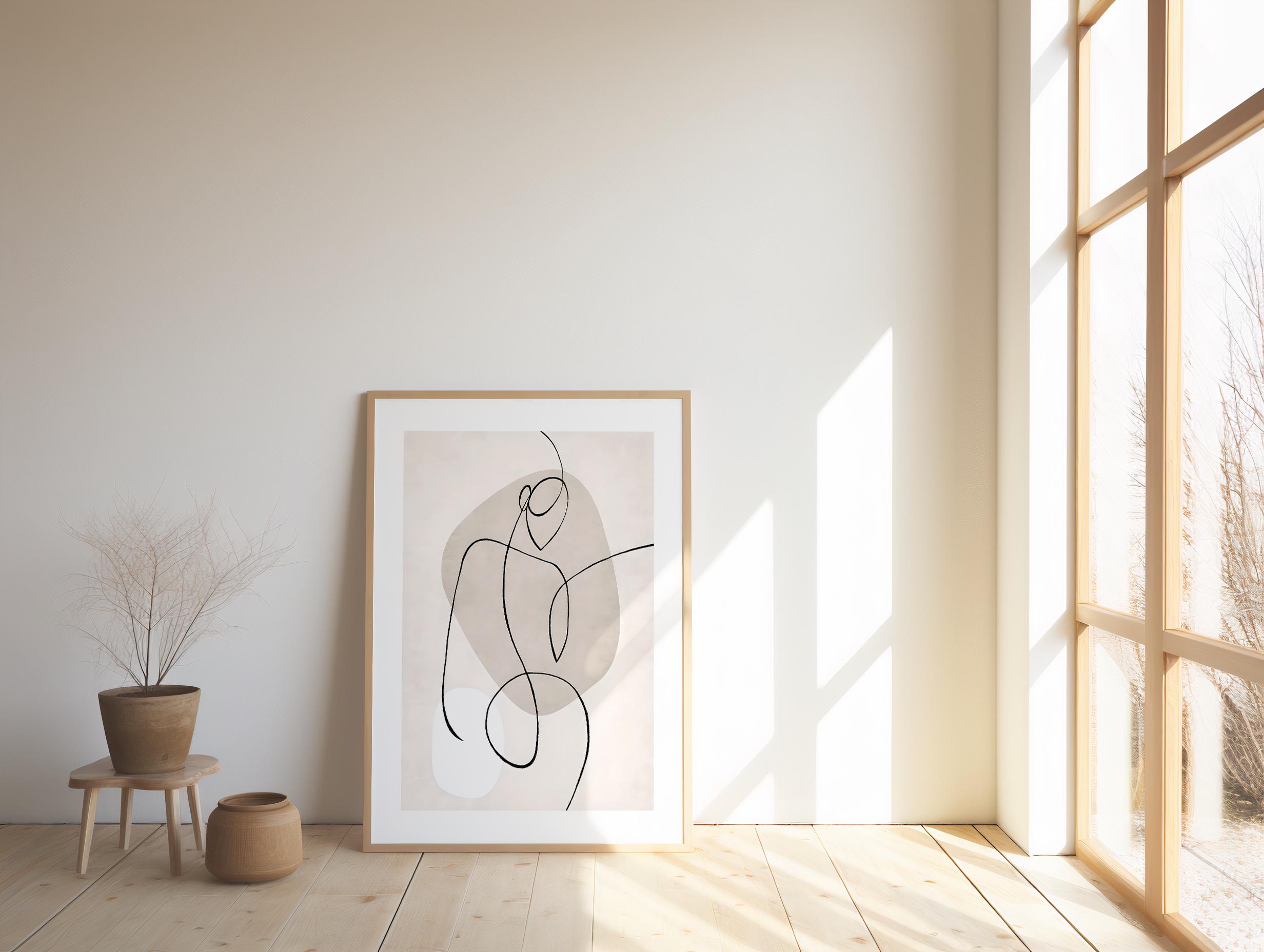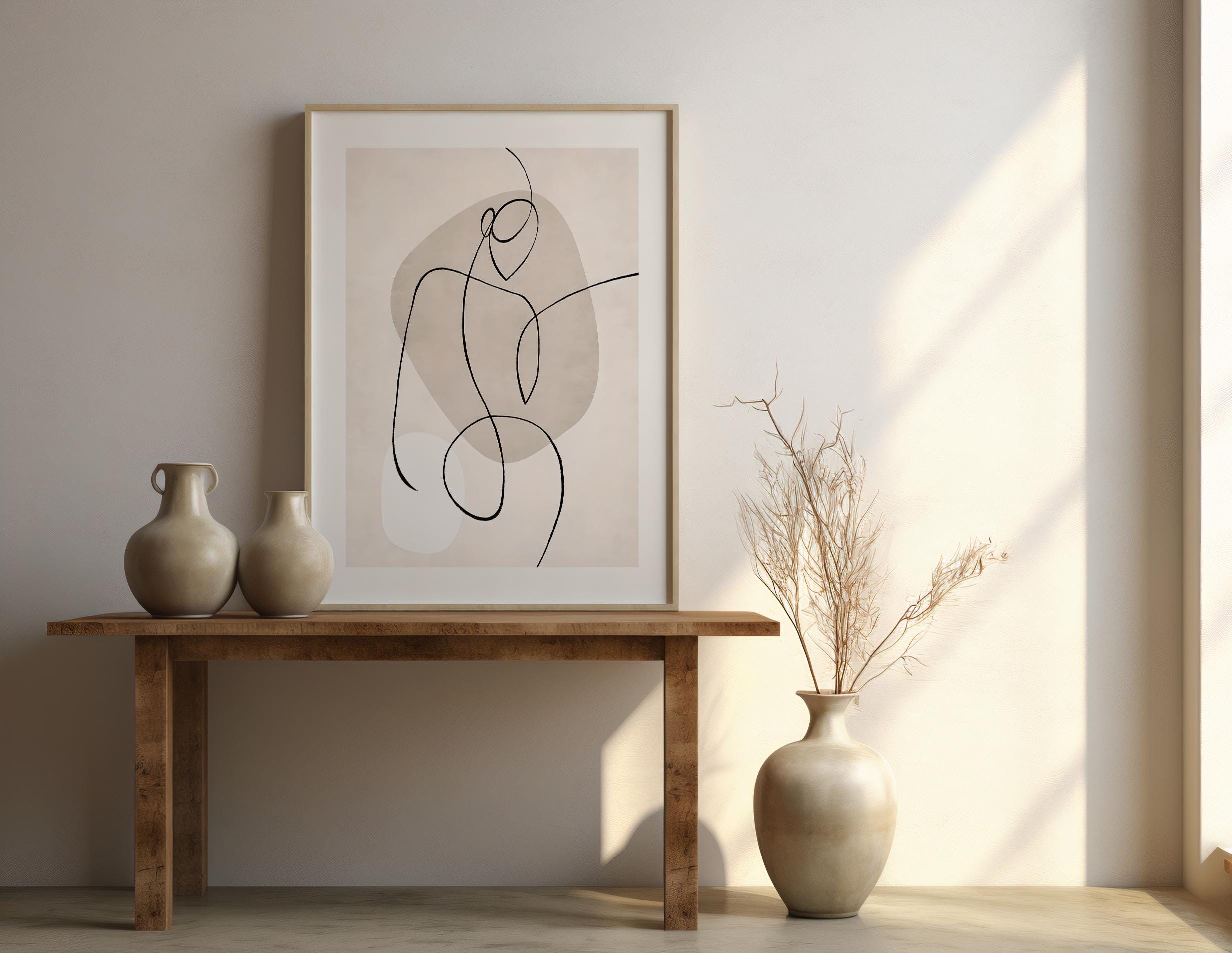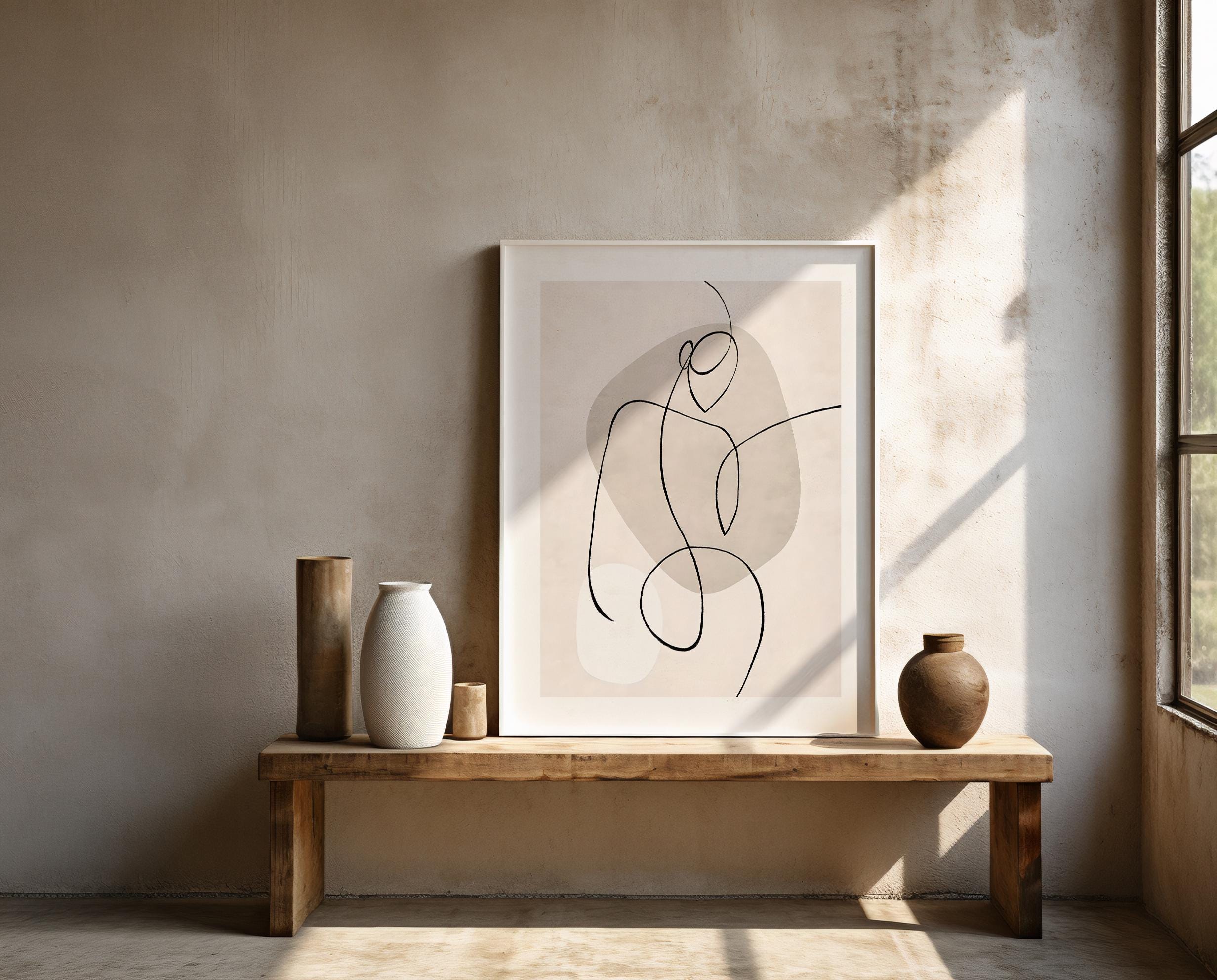 A refined minimalist composition featuring a continuous black line figure layered over soft beige organic shapes. Clean, balanced, and timeless — this piece brings quiet sophistication to Japandi, Scandinavian, and organic modern interiors.