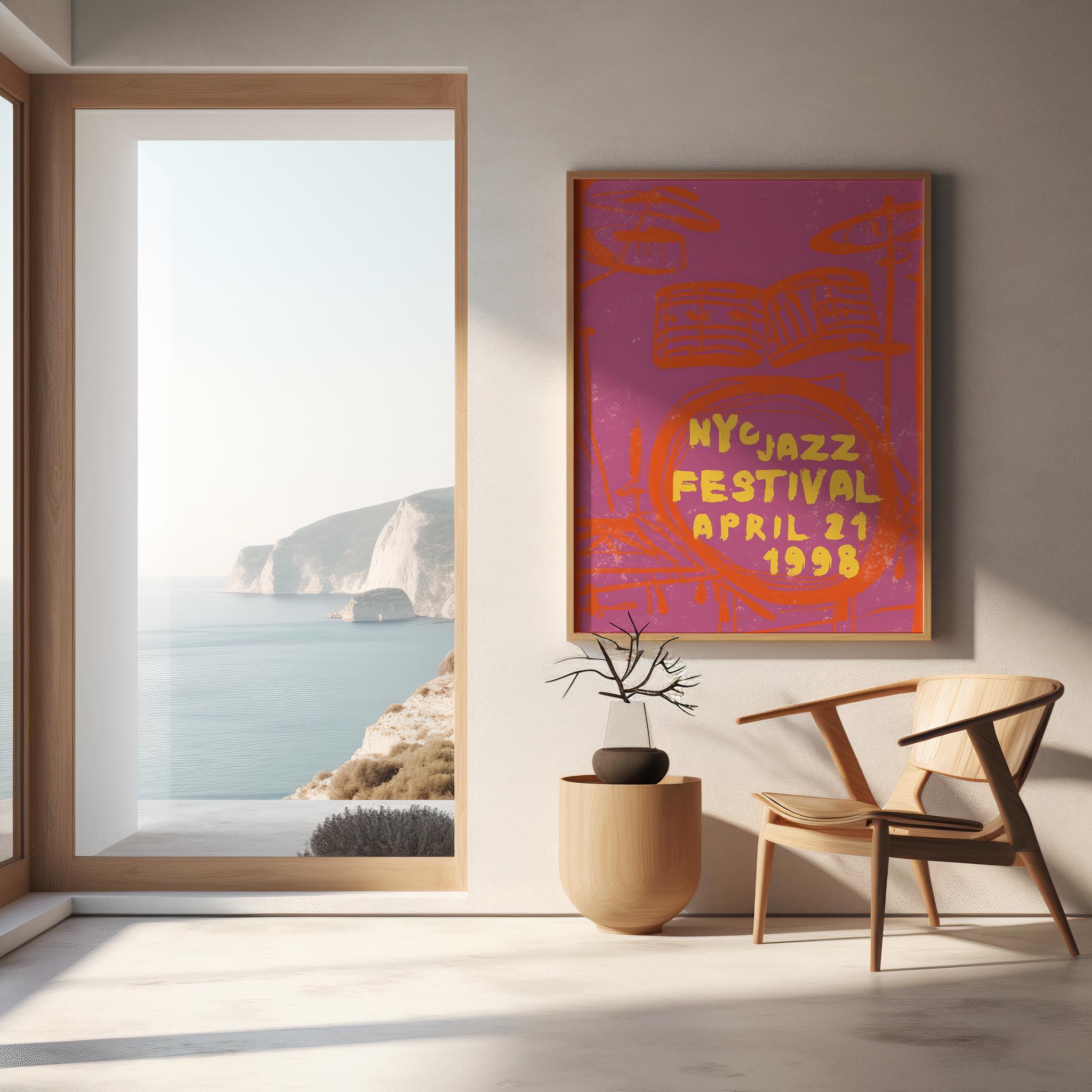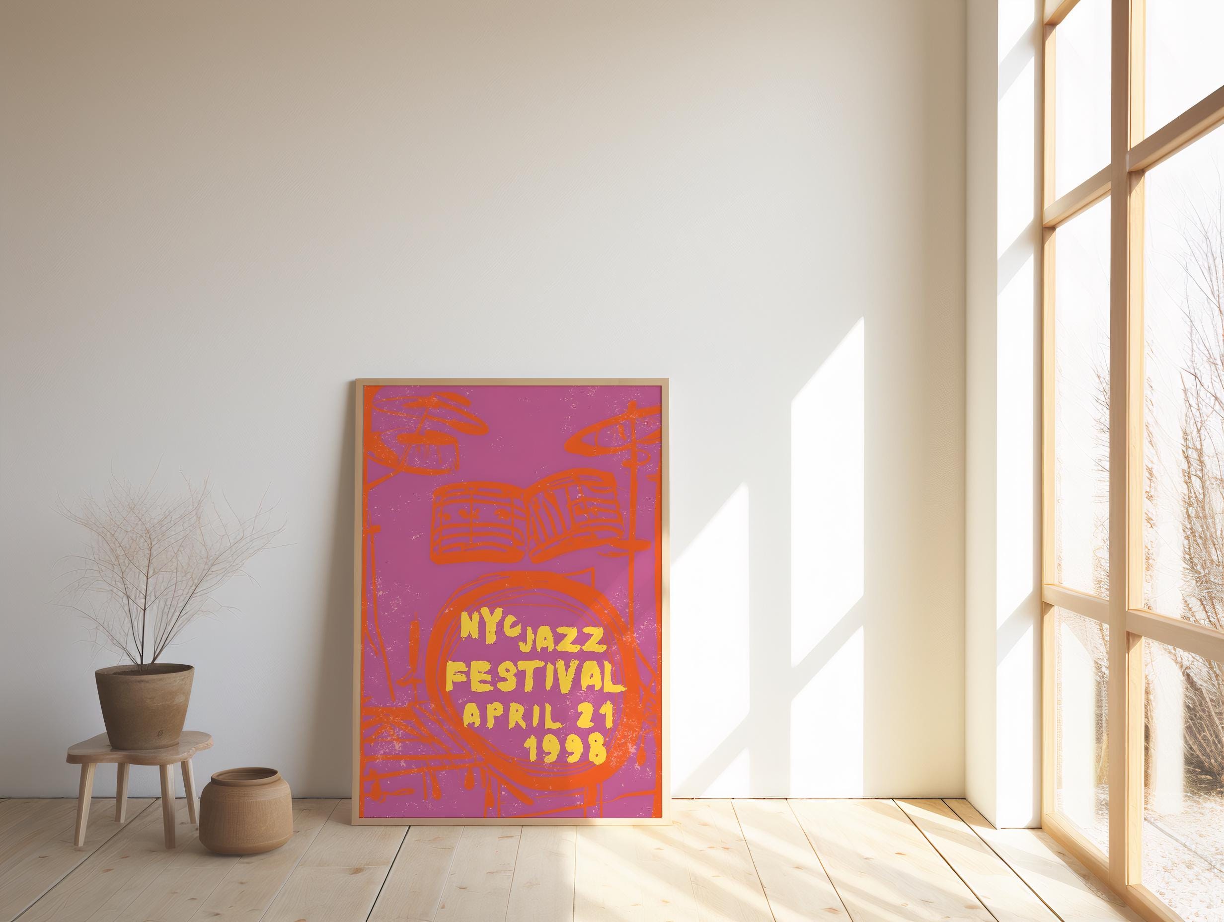 A vibrant, high-energy music poster inspired by classic jazz festival graphics. Featuring bold orange drum illustrations over a saturated pink background with distressed texture and vintage typography, this piece brings retro concert energy to any space.