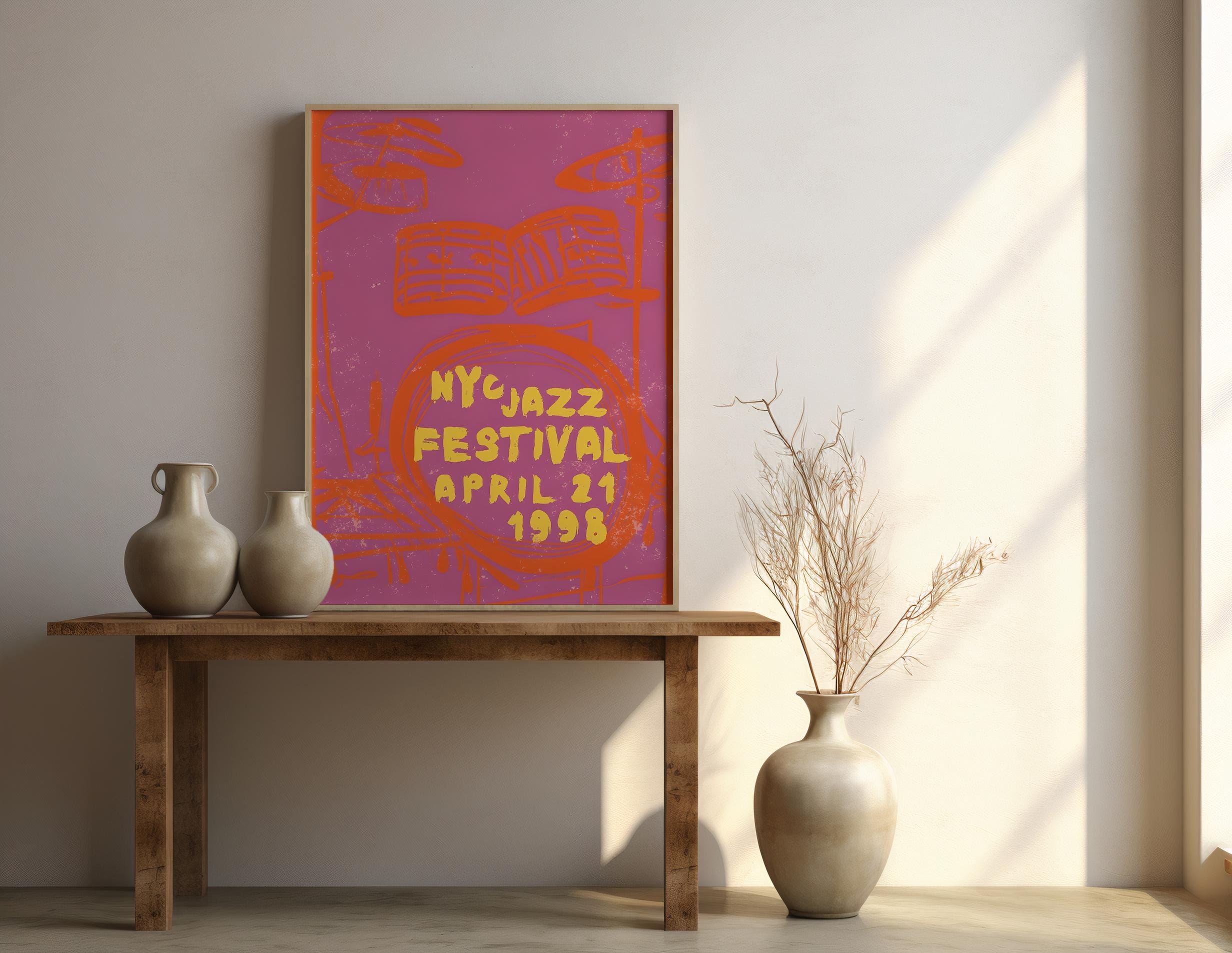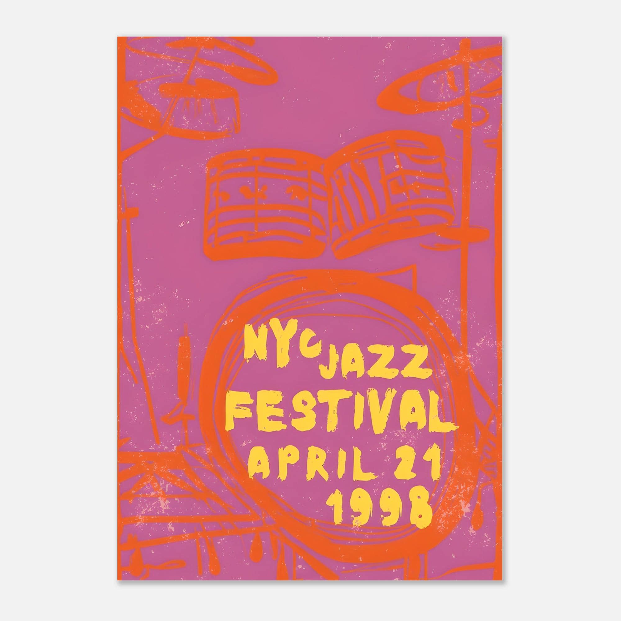 Bold, electric, and unapologetically vibrant — this NYC Jazz Festival 1998 poster brings raw rhythm and vintage energy into your space. Featuring expressive hand-drawn drum sketches in striking orange over a saturated pink backdrop, this piece feels like live music captured mid-beat.