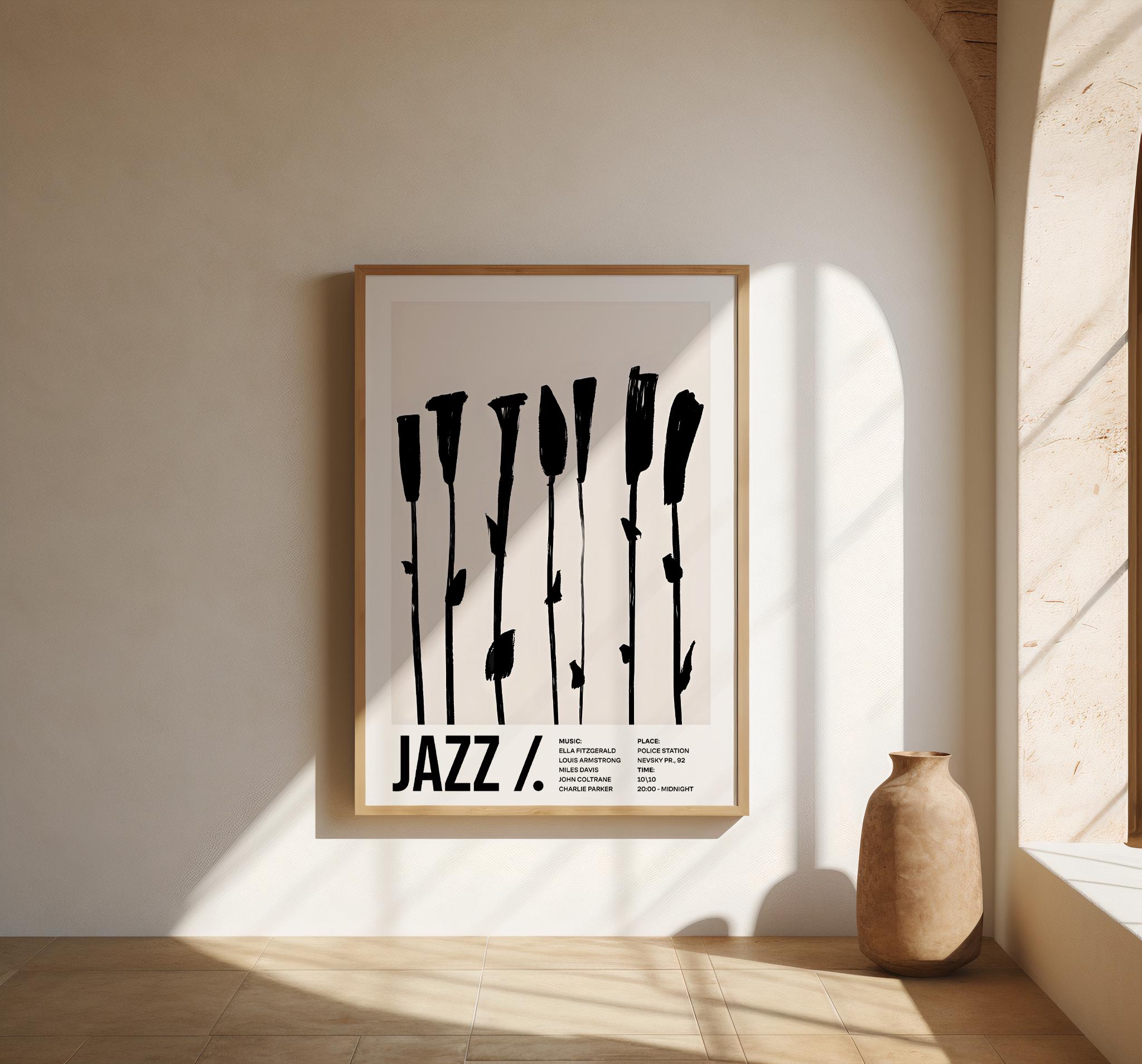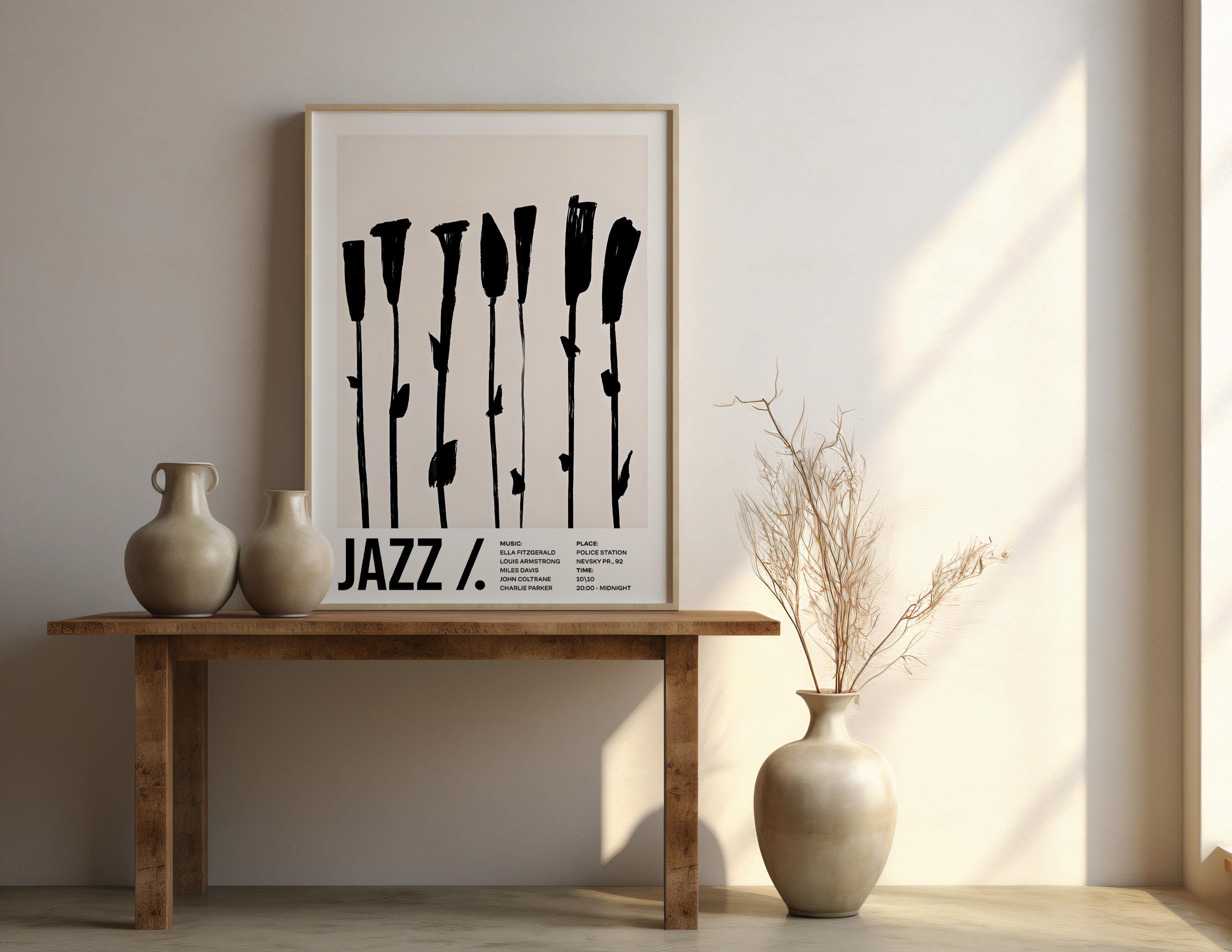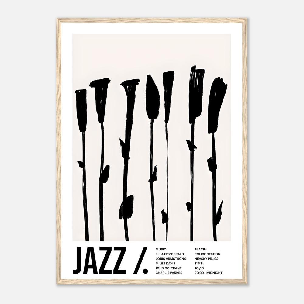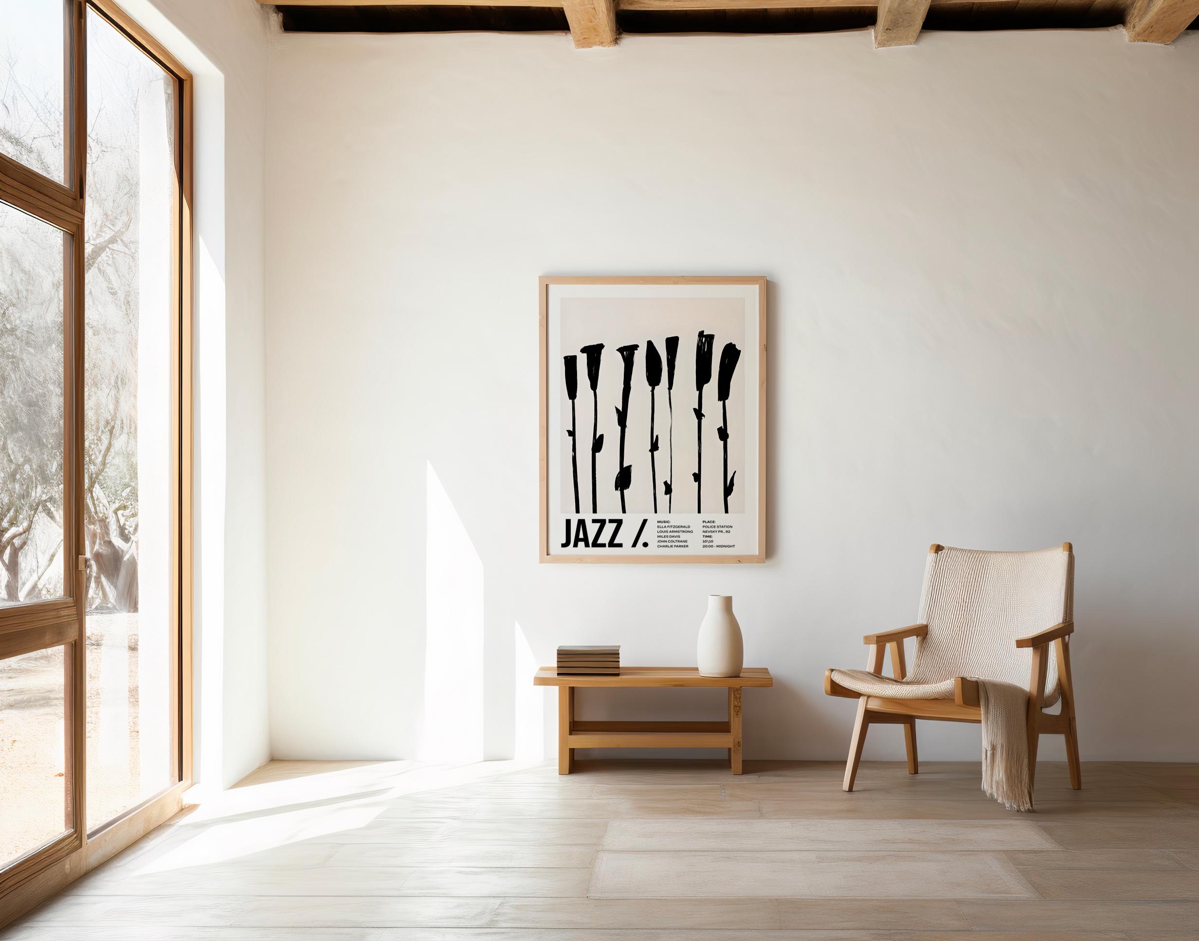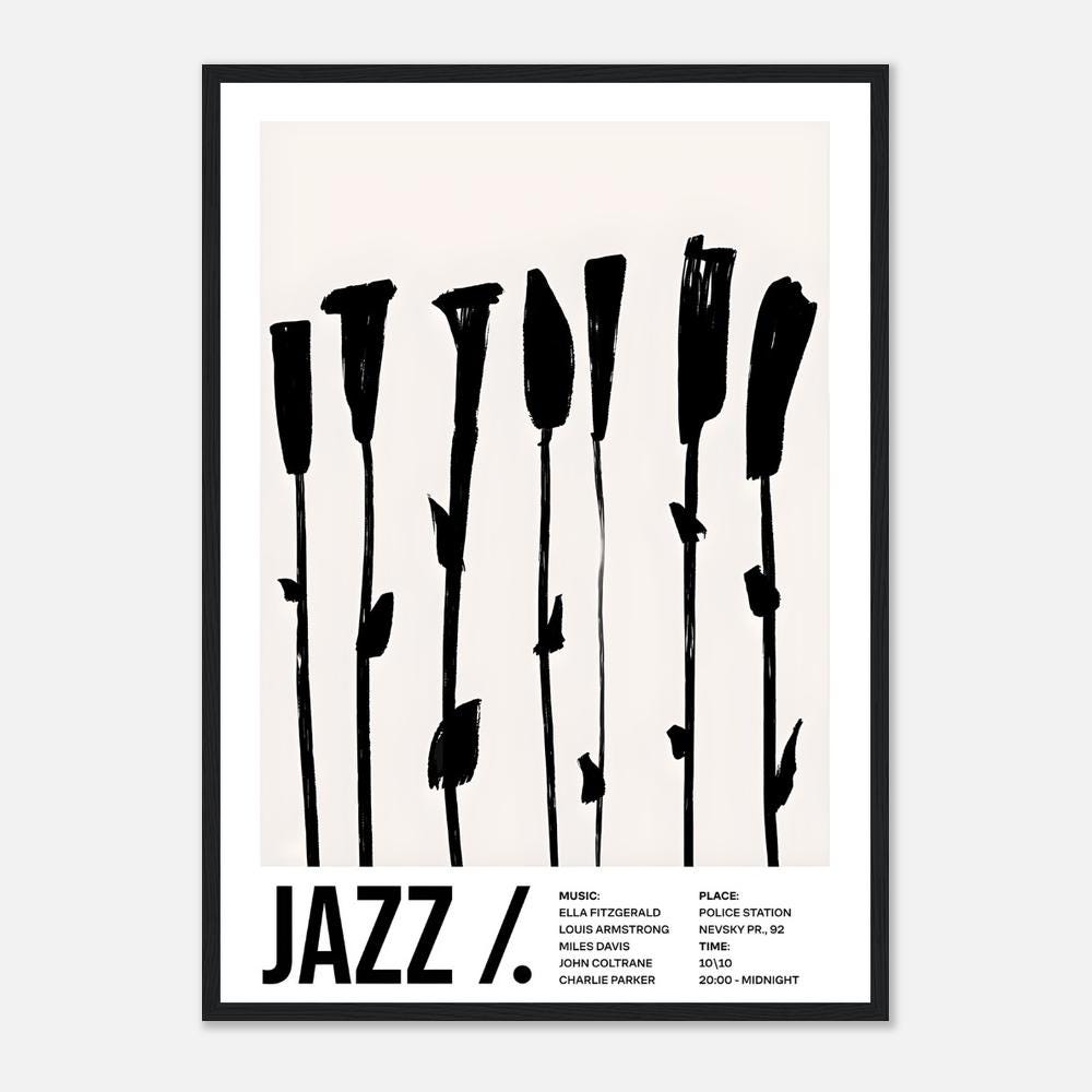 Bold, graphic, and modern — this minimalist jazz framed poster features expressive black brushstroke florals on a soft neutral background. A striking piece that blends music culture with contemporary design, perfect for elevated interiors and statement walls.