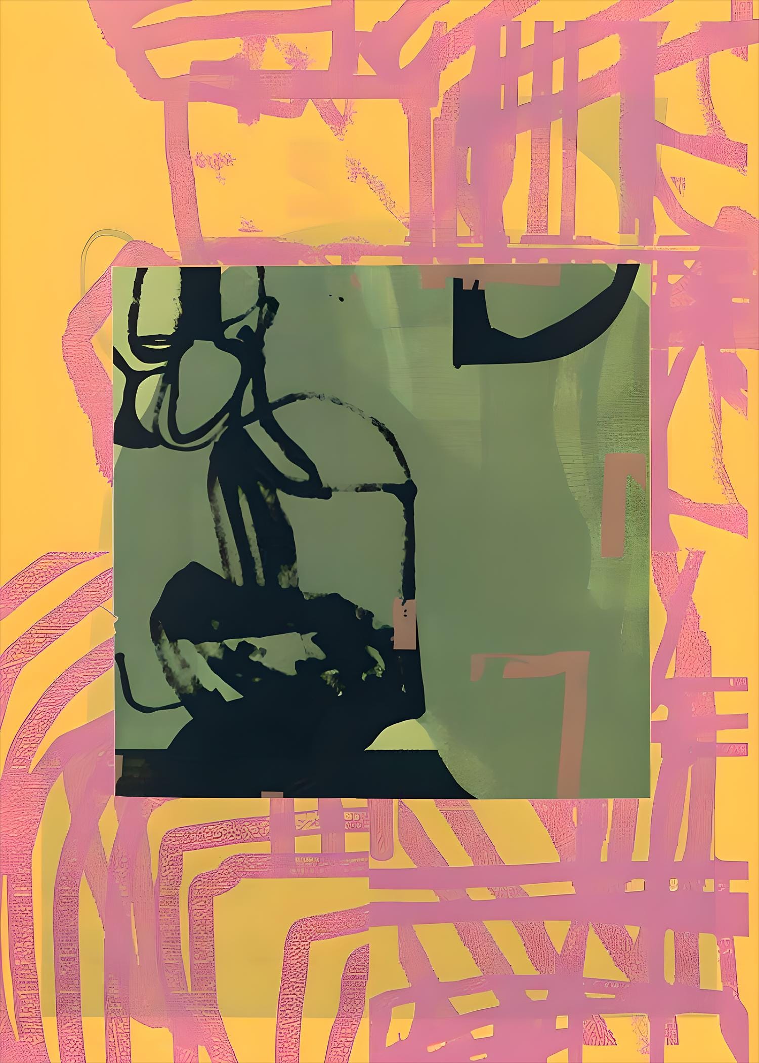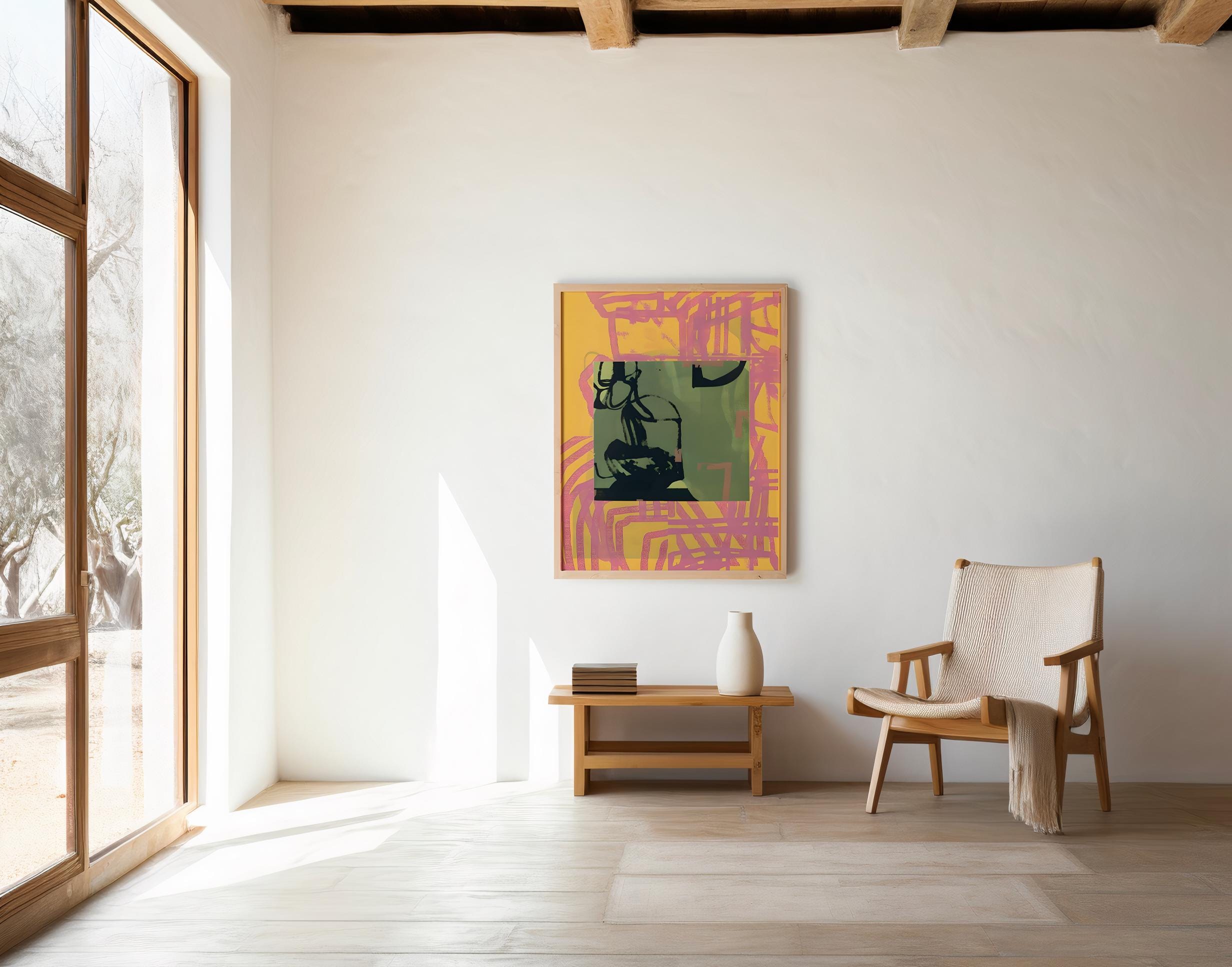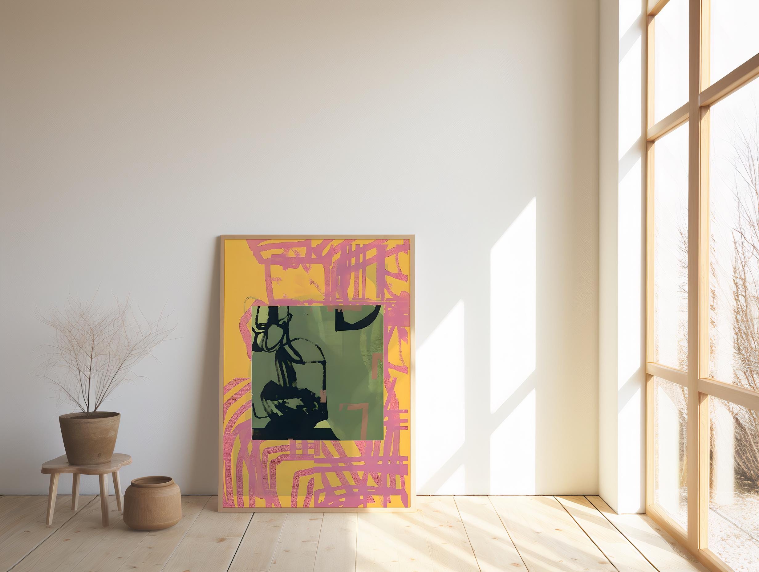 Elevate your space with this bold abstract digital artwork featuring layered color blocks, expressive black brushwork, and vibrant pink-yellow contrast. A modern statement piece designed for creative interiors and gallery-style walls.