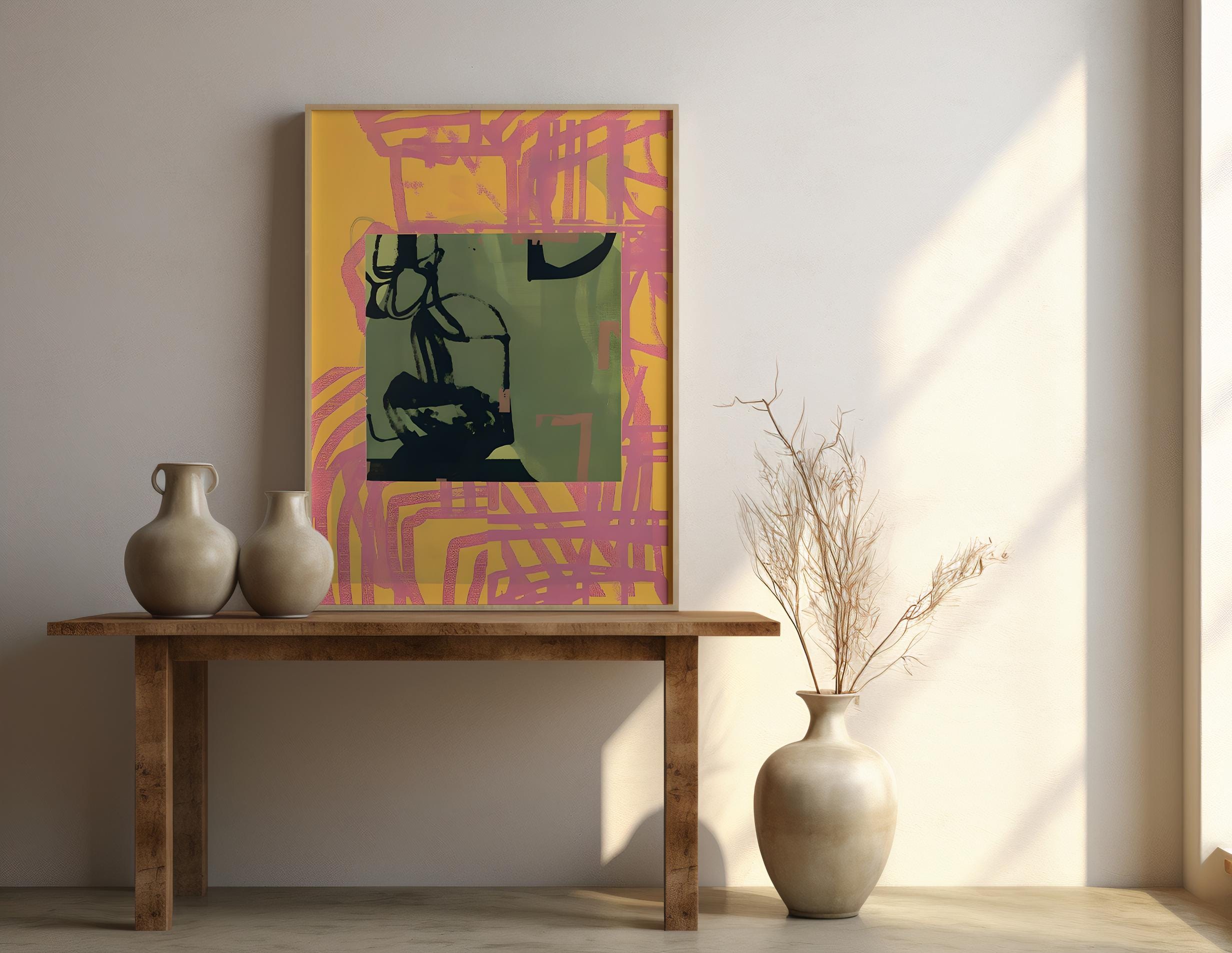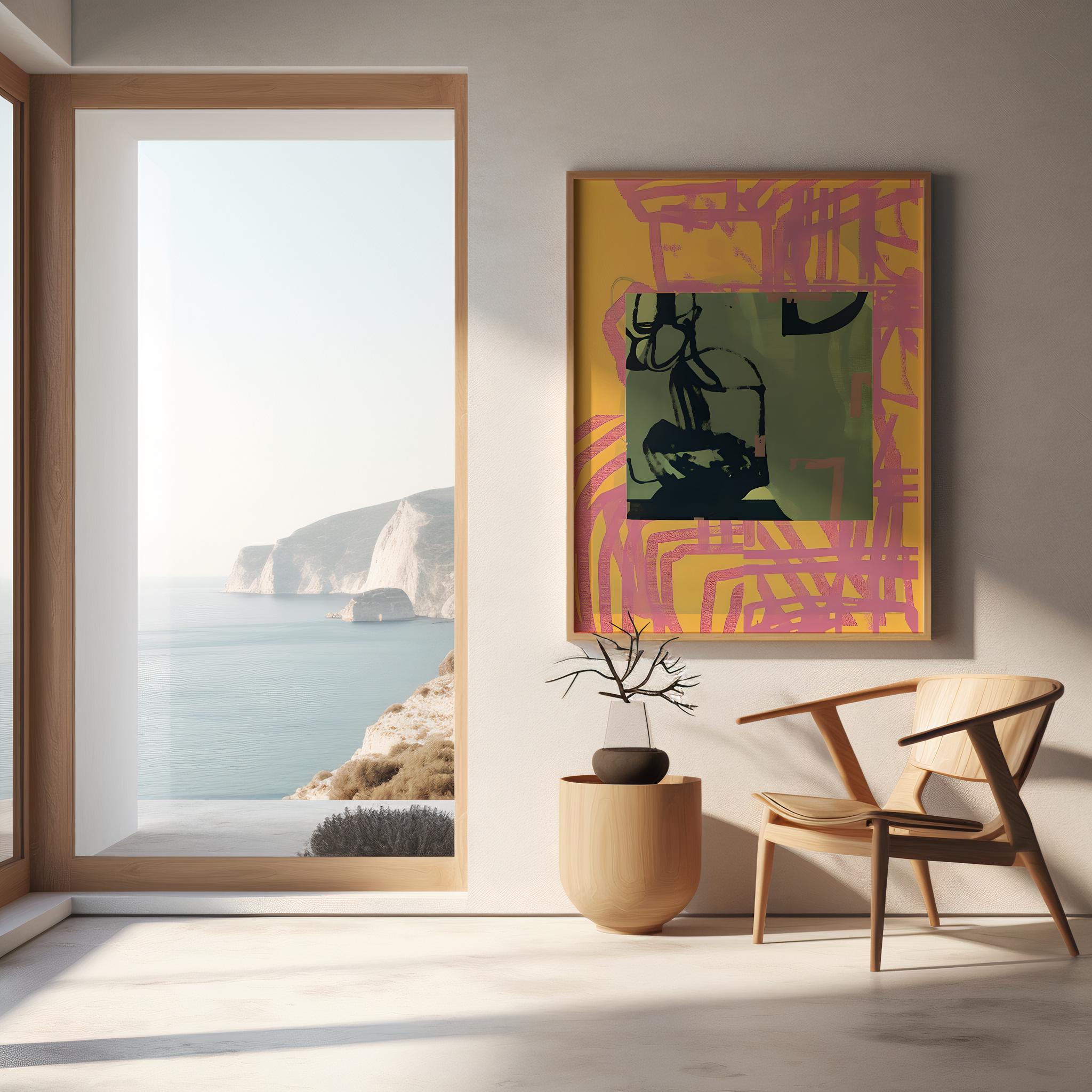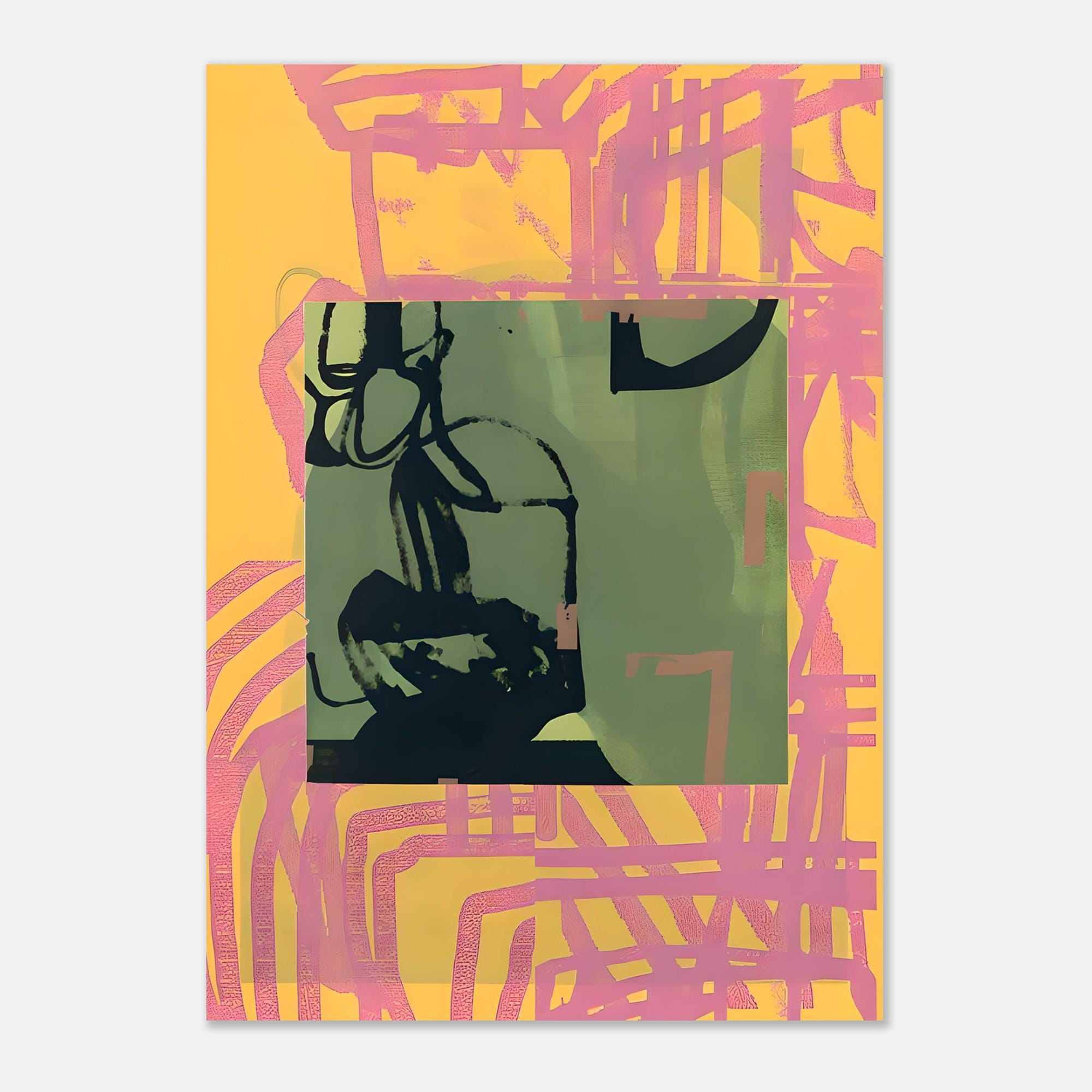 A bold contemporary abstract featuring warm pink and yellow tones layered with olive green accents and expressive black brushwork. Designed to bring energy, movement, and modern character into curated interiors.