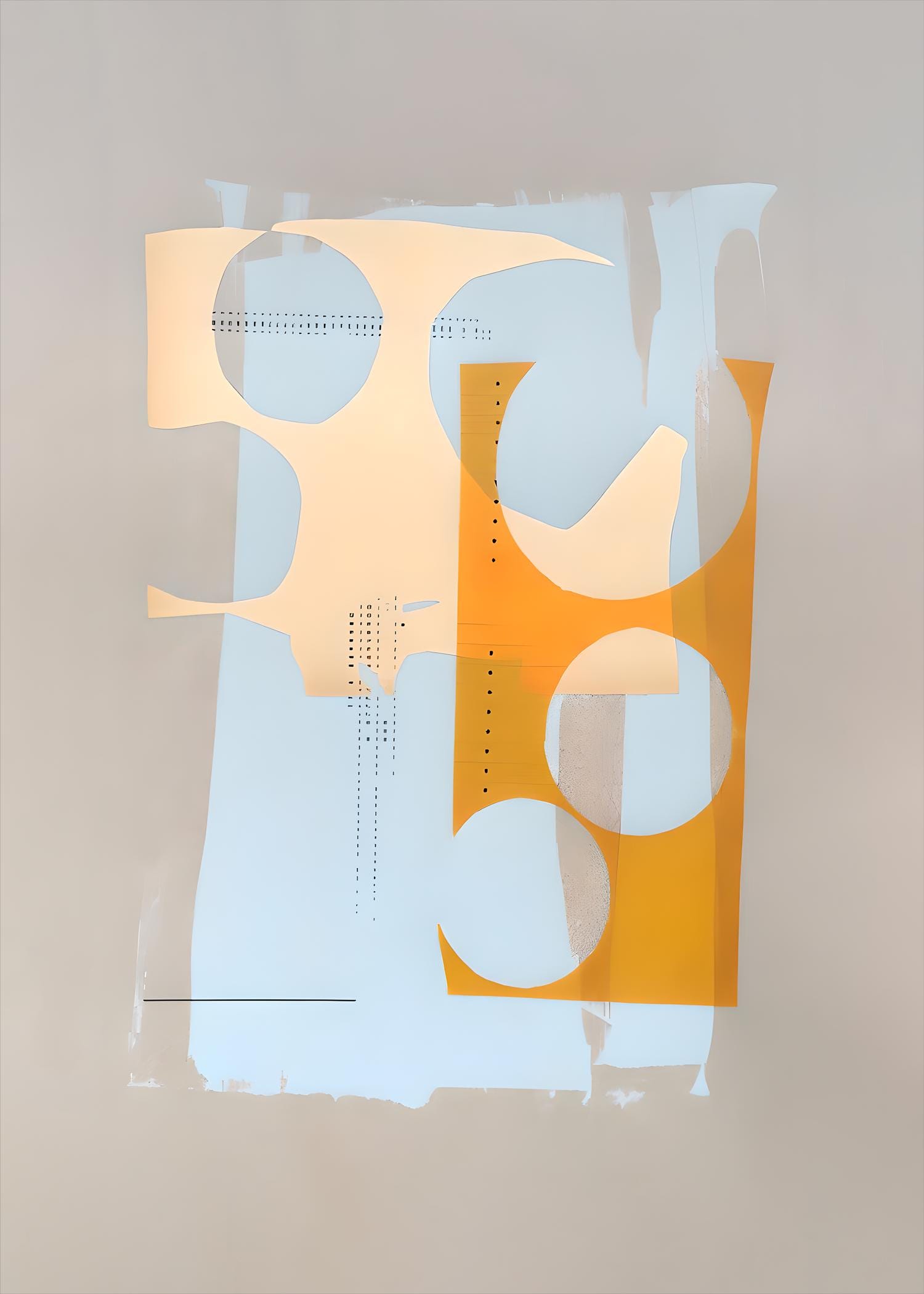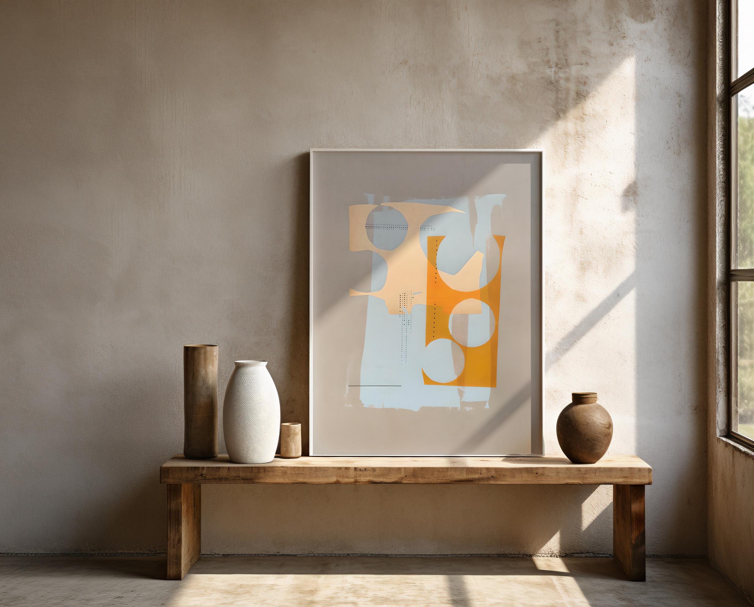 Elevate your space with this modern abstract artwork featuring layered soft blue tones balanced with warm orange and cream shapes. Clean, architectural forms meet subtle texture for a calm yet graphic statement piece designed for contemporary interiors.