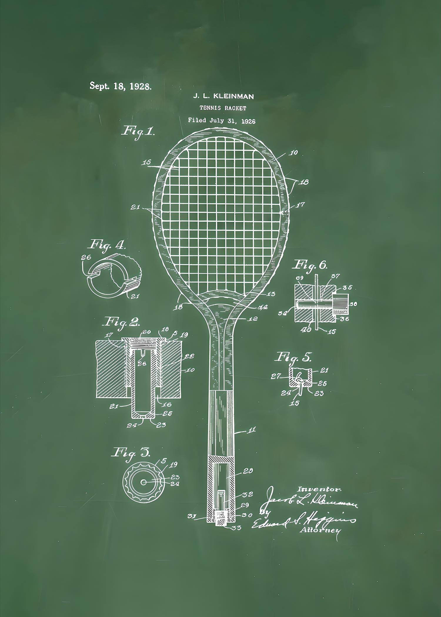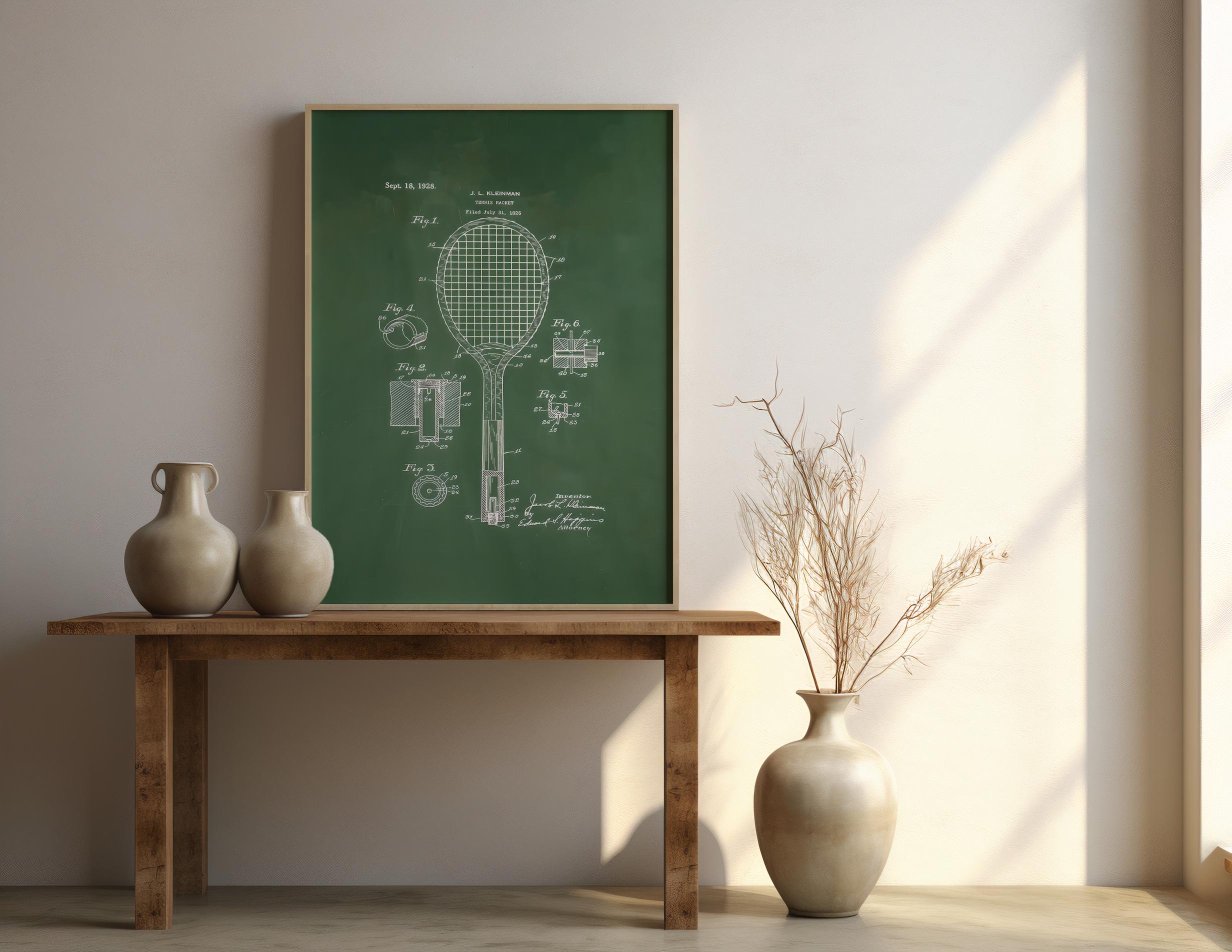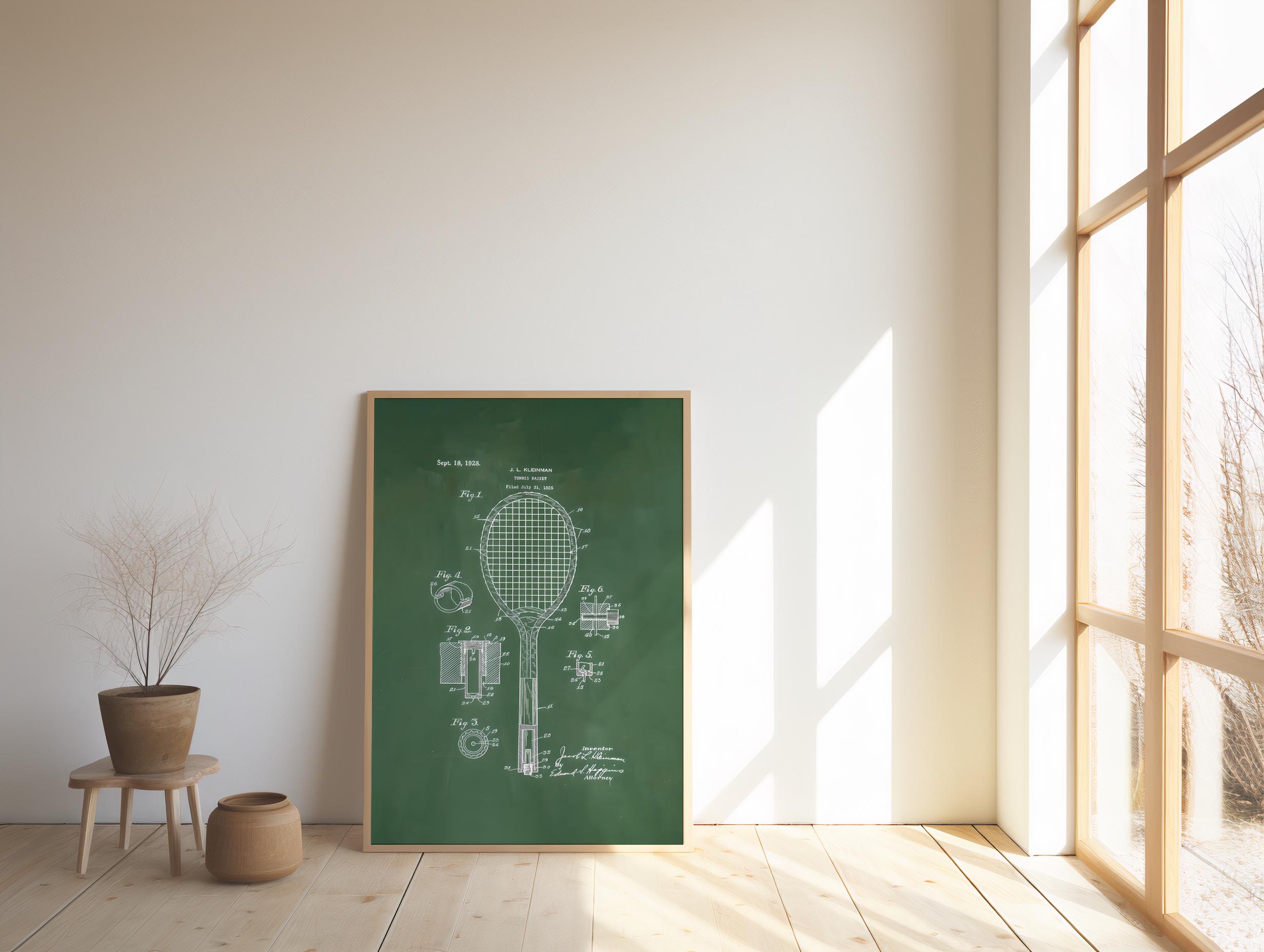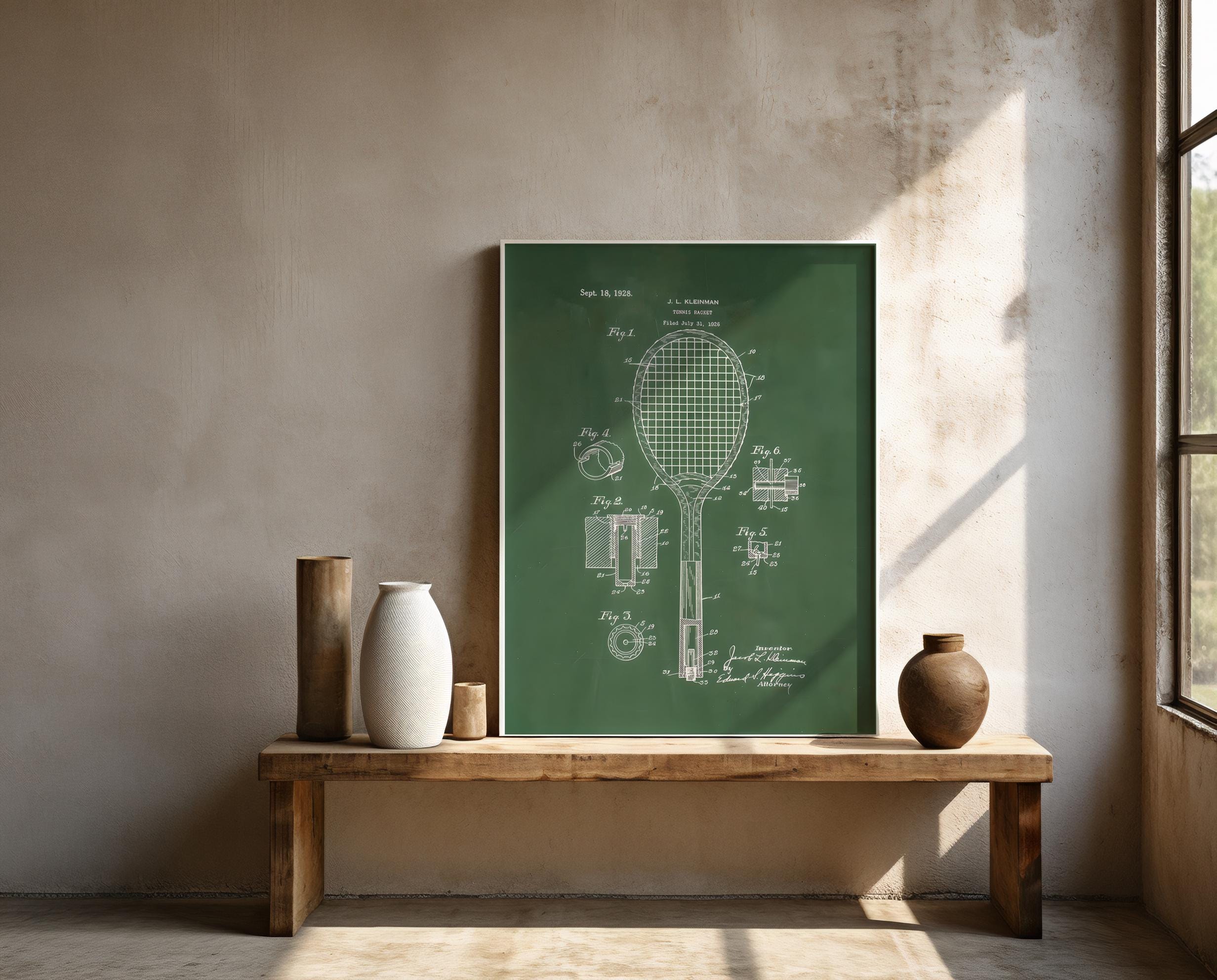 Instantly elevate your space with this vintage tennis racket patent illustration, featuring a classic technical drawing on a rich green background. A perfect blend of sport history and minimalist design — ideal for offices, game rooms, gyms, or modern interiors.