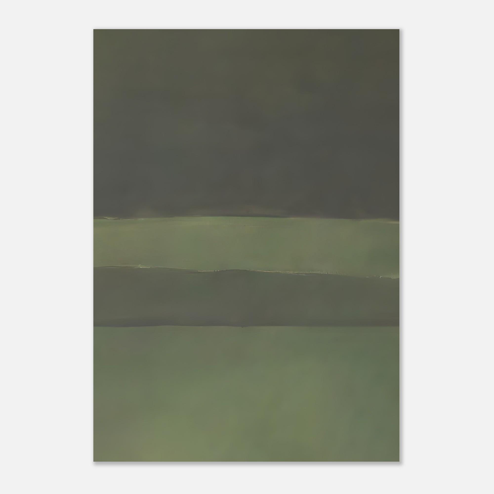A moody abstract composition featuring layered deep olive and muted sage tones with soft horizontal movement. The subtle tonal shifts create depth and calm, making this piece ideal for refined, organic interiors that favor earthy palettes and understated impact.