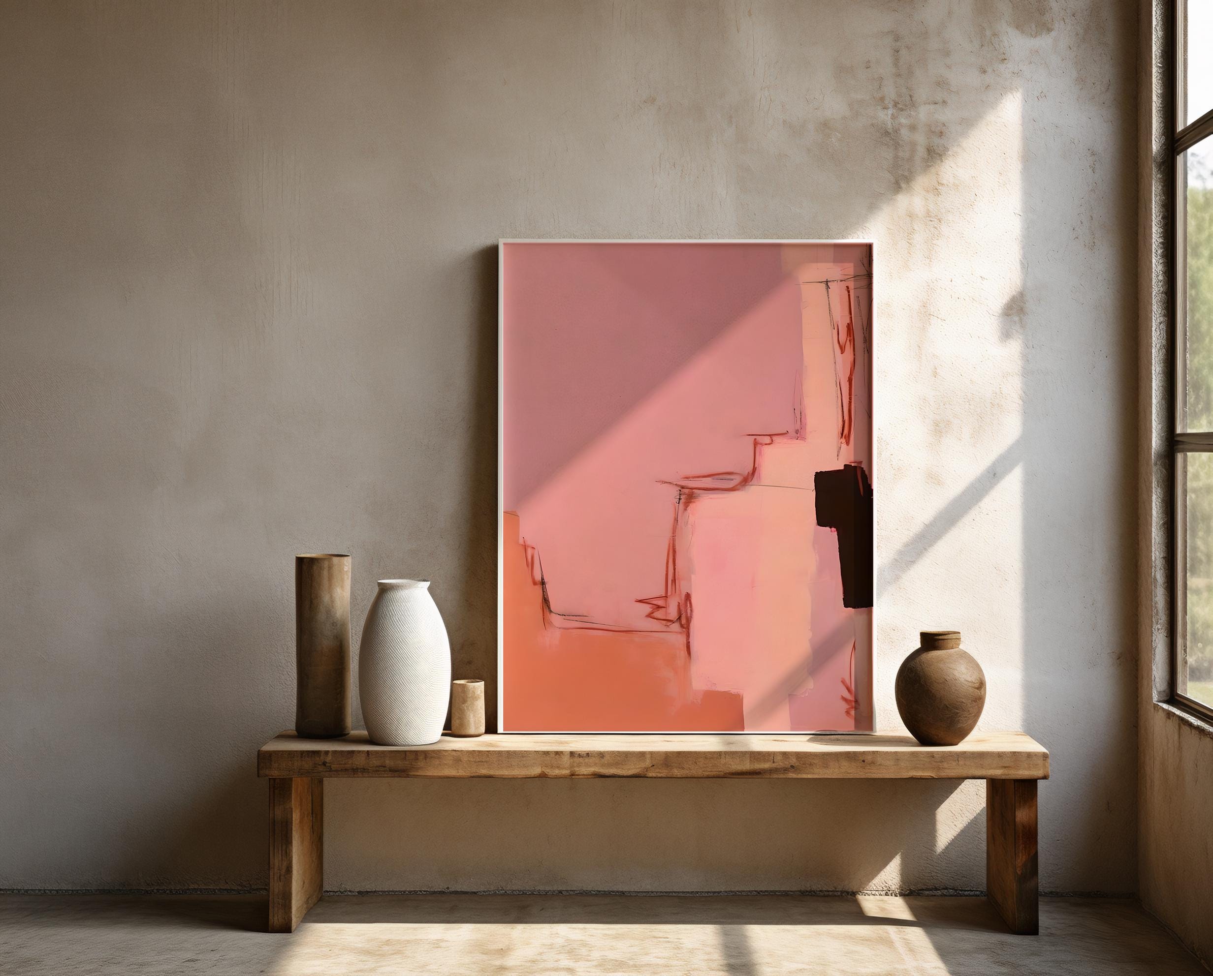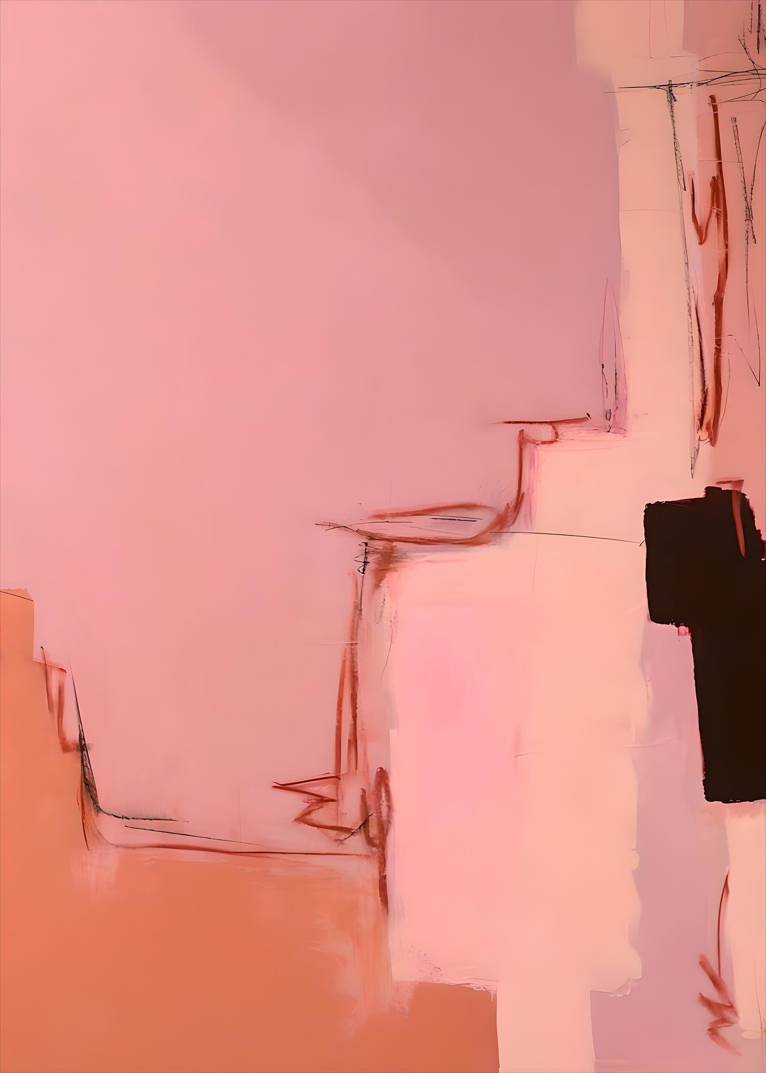 A soft yet expressive abstract composition featuring layered blush pink, peach, and warm terracotta tones with subtle gestural lines and modern color blocking. The muted warmth creates a calm, elevated feel while the darker accent adds contrast and depth.