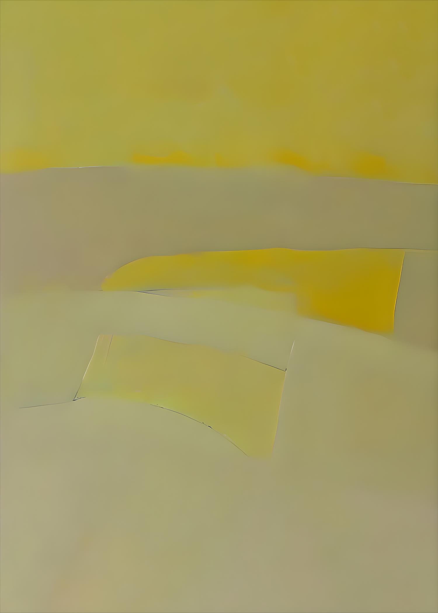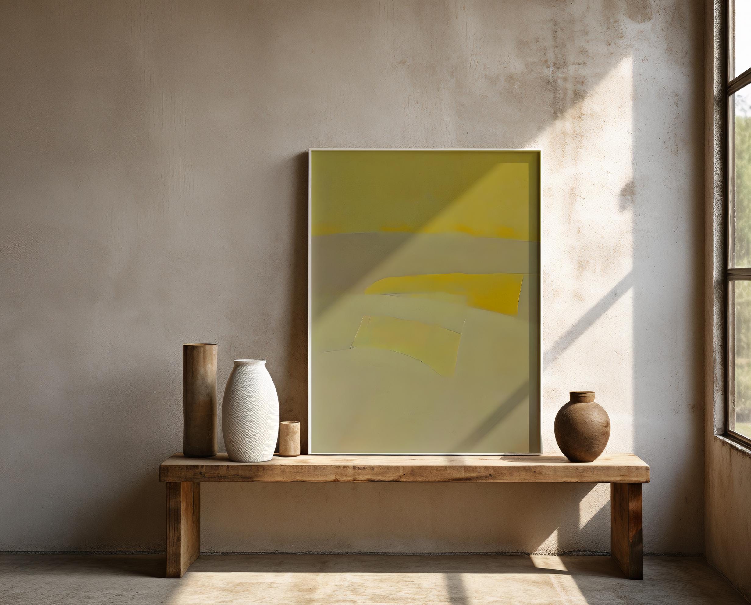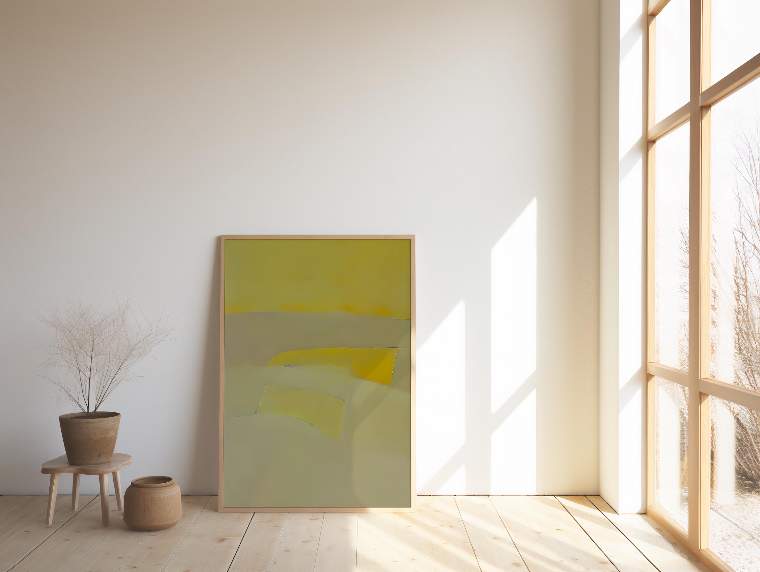 A layered abstract composition featuring muted olive green blended with soft yellow undertones and diffused tonal transitions. The organic color fields create warmth and depth without sharp contrast, making this piece ideal for earthy, design-forward interiors.