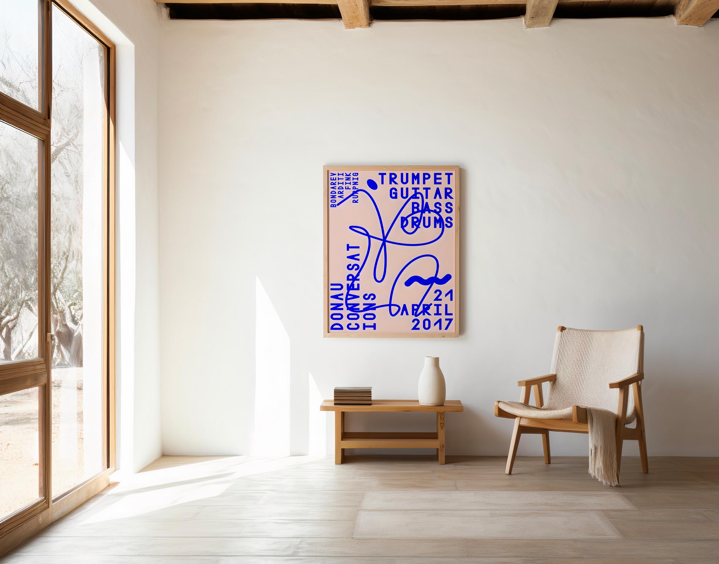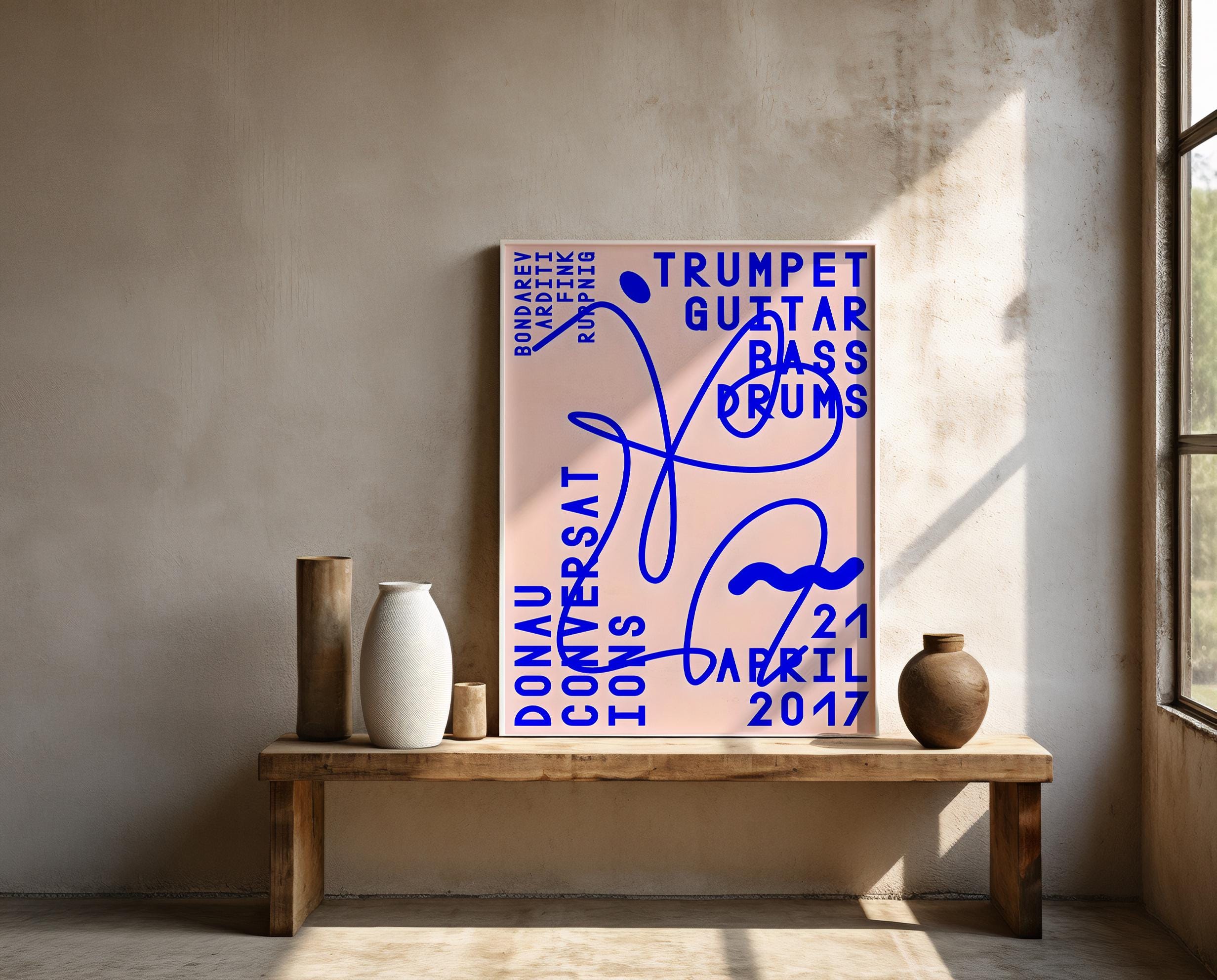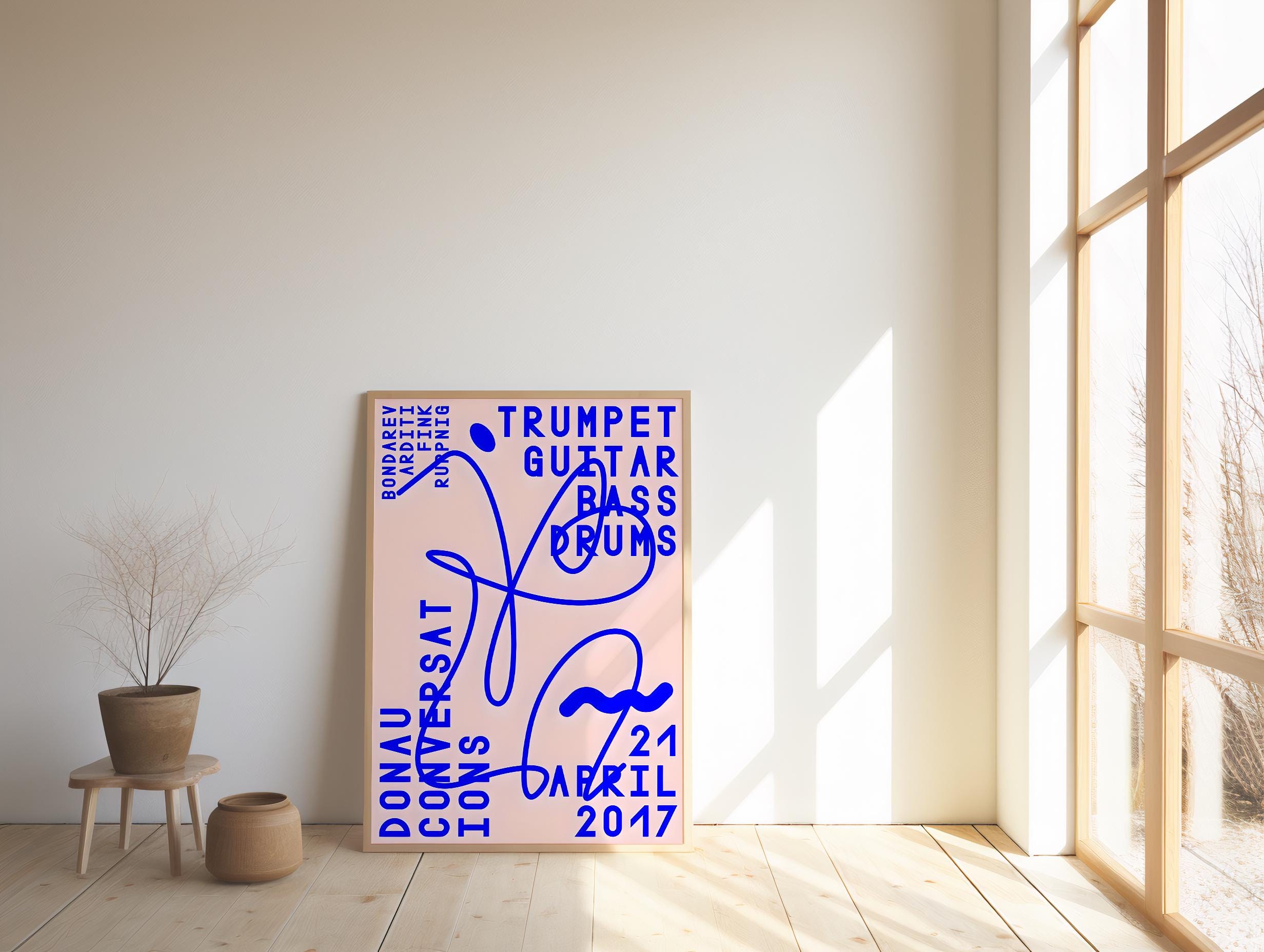 A bold, modern concert-inspired composition featuring electric blue typography layered over a soft blush background with expressive abstract linework. Referencing classic jazz instrumentation — trumpet, guitar, bass, and drums — this piece blends music culture with contemporary graphic design.