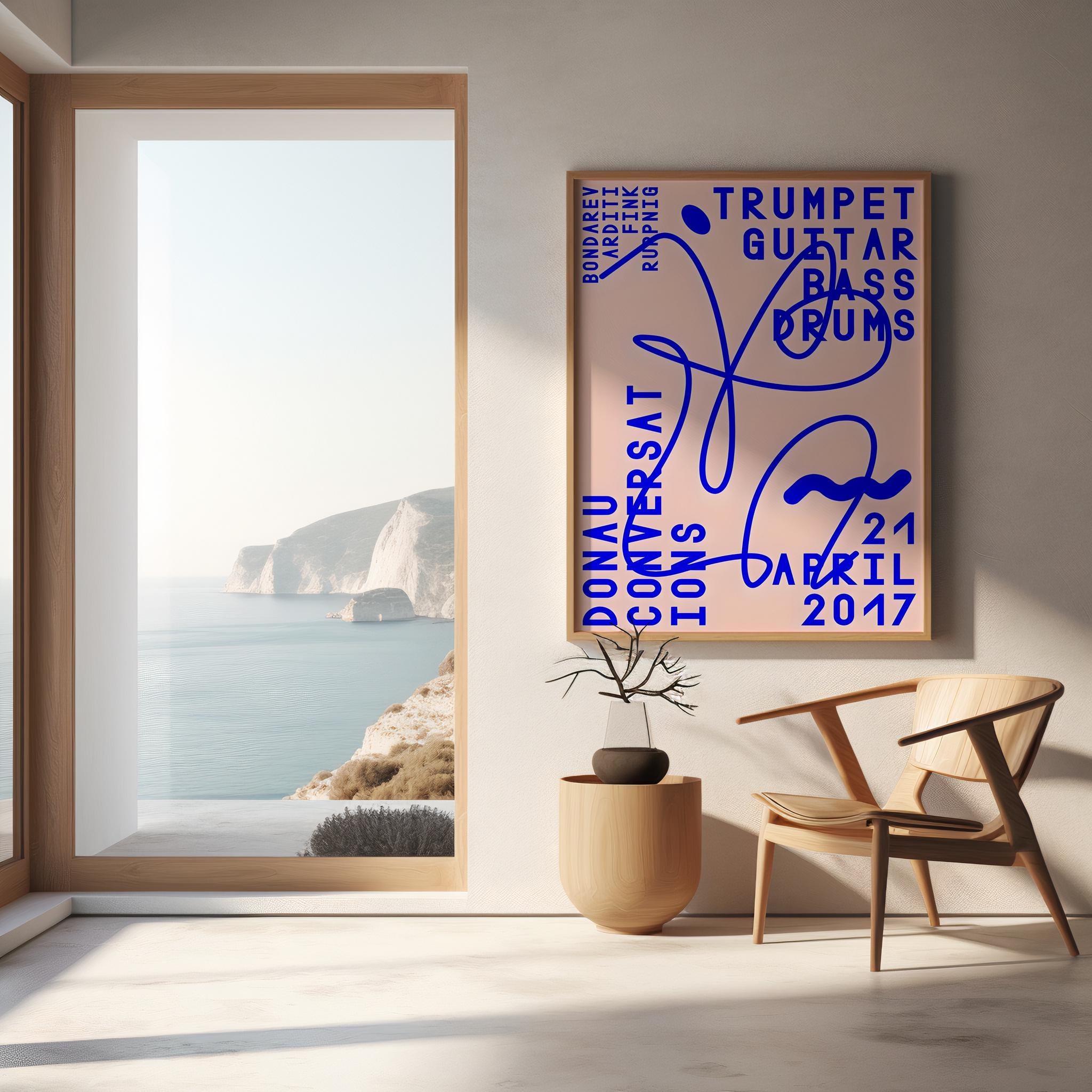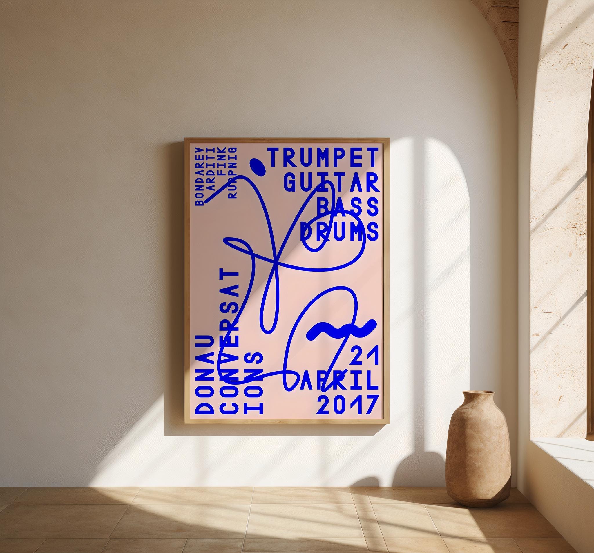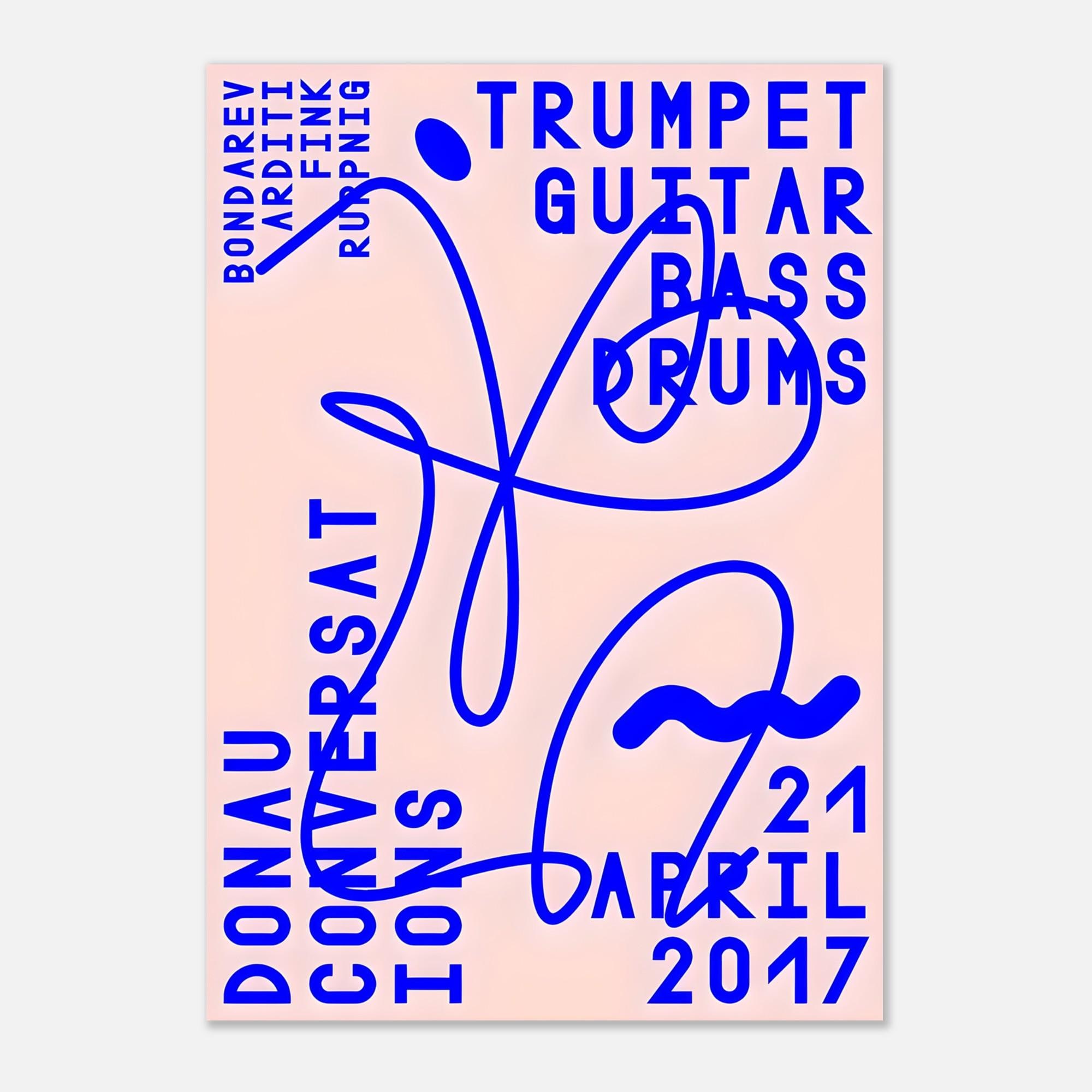 A bold, modern concert-inspired composition featuring electric blue typography layered over a soft blush background with expressive abstract linework. Referencing classic jazz instrumentation — trumpet, guitar, bass, and drums — this piece blends music culture with contemporary graphic design.