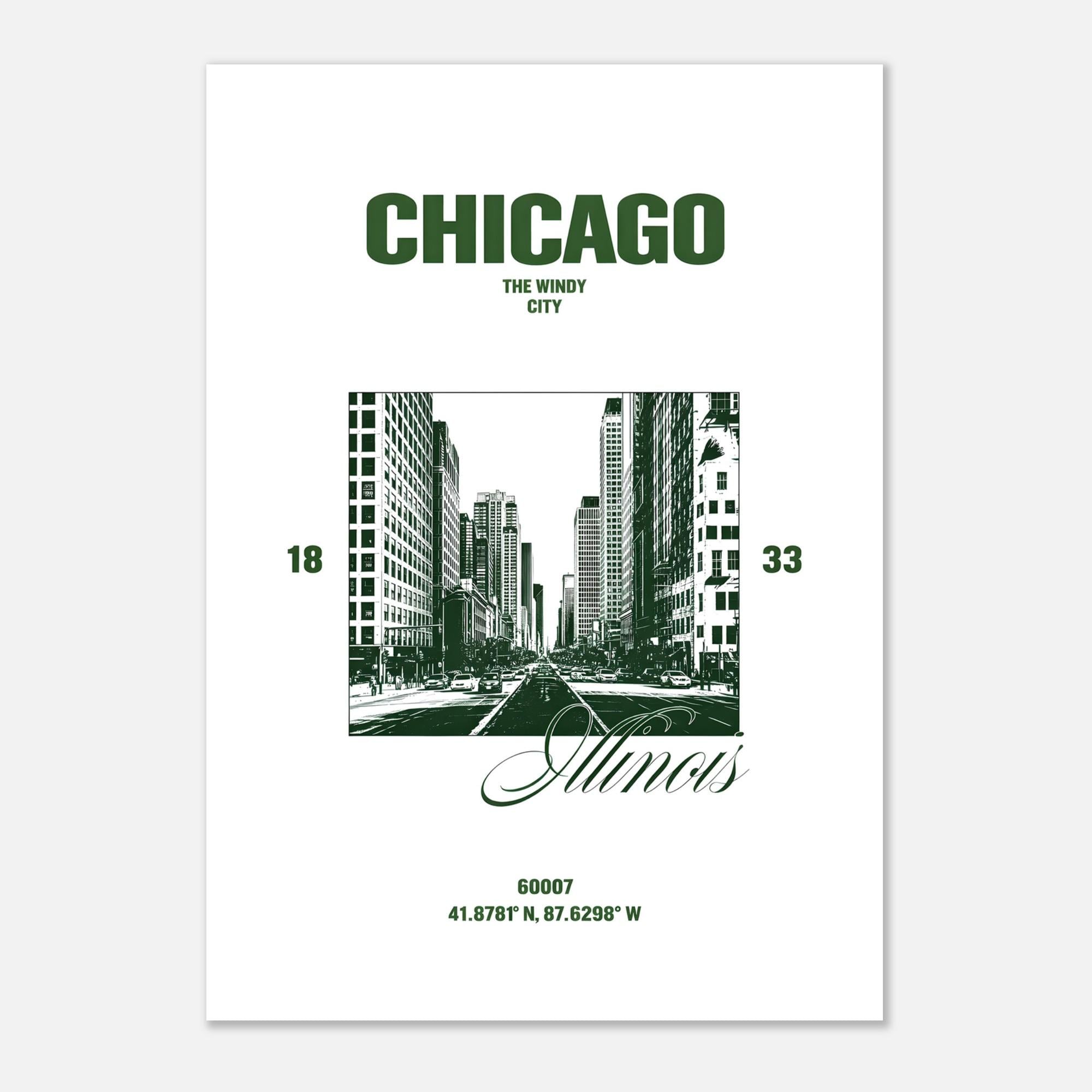 A bold, high-contrast Chicago cityscape featuring deep forest green architecture set against a clean neutral background. This modern travel-style design captures the iconic downtown skyline with crisp structural detail and timeless typography.