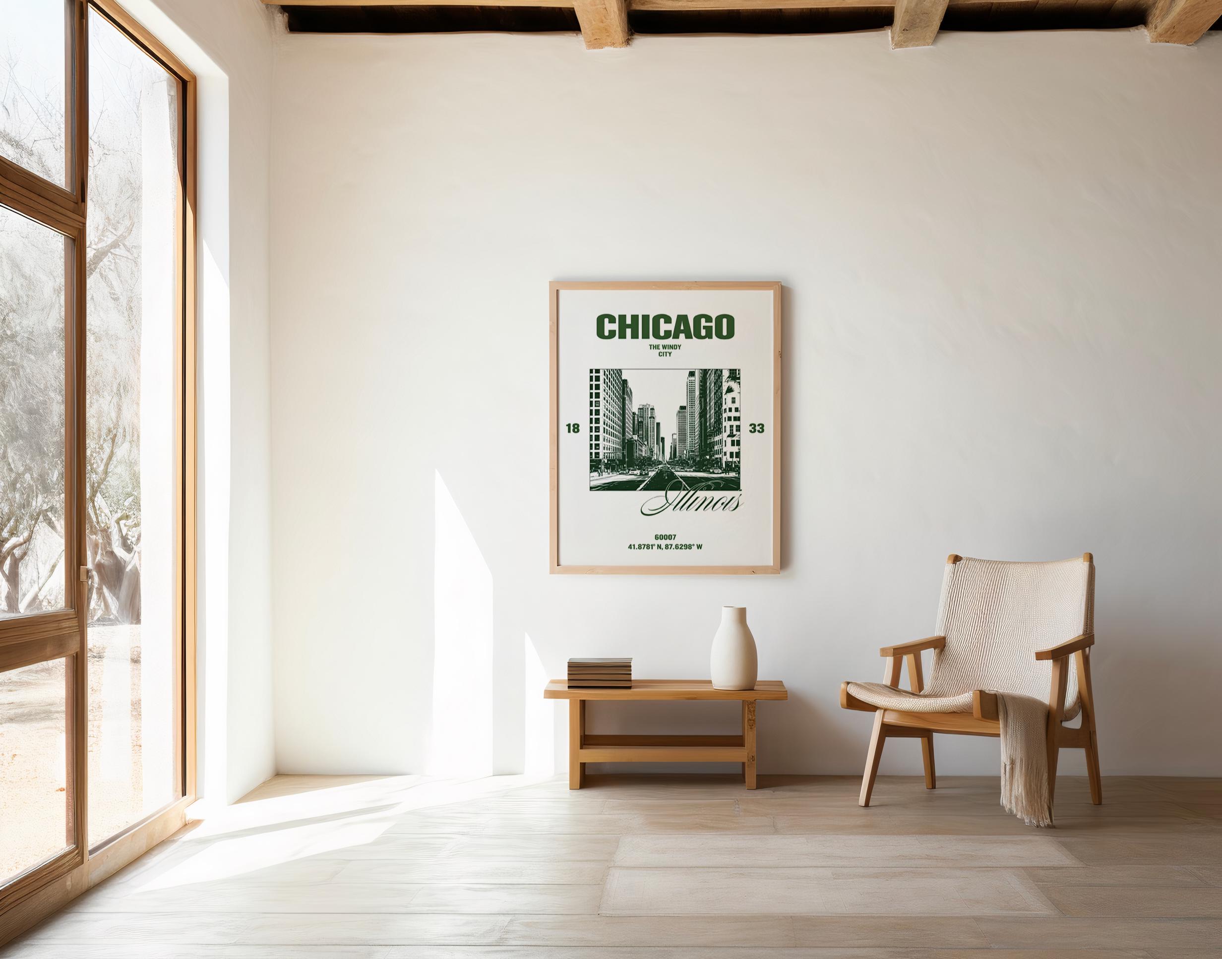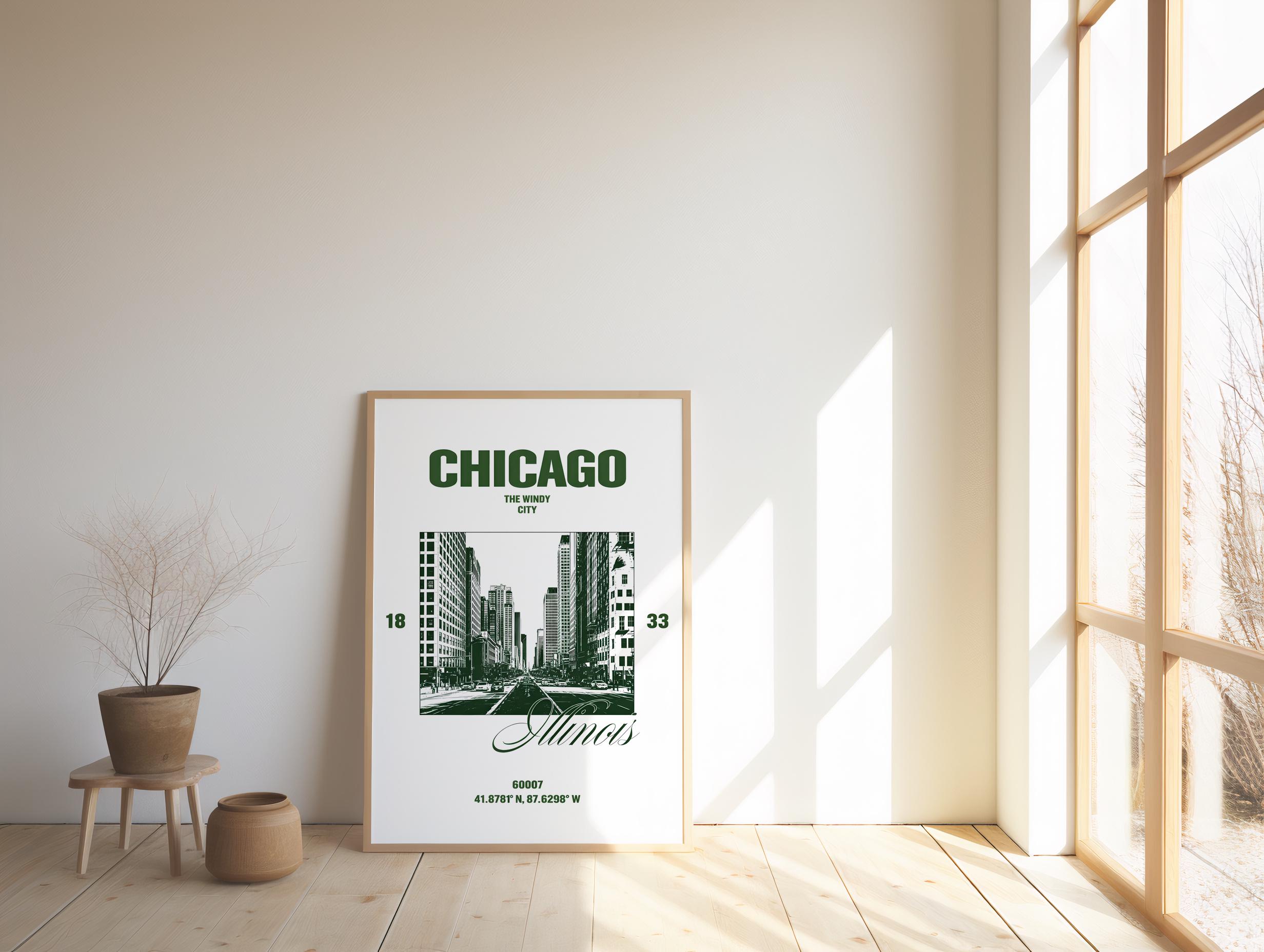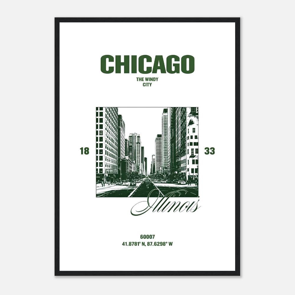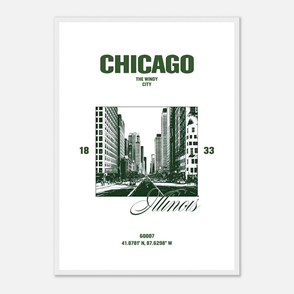 A bold, high-contrast Chicago cityscape featuring deep forest green architecture against a clean neutral backdrop. This modern travel-inspired design highlights the iconic downtown skyline with crisp structural detail and strong graphic presence.