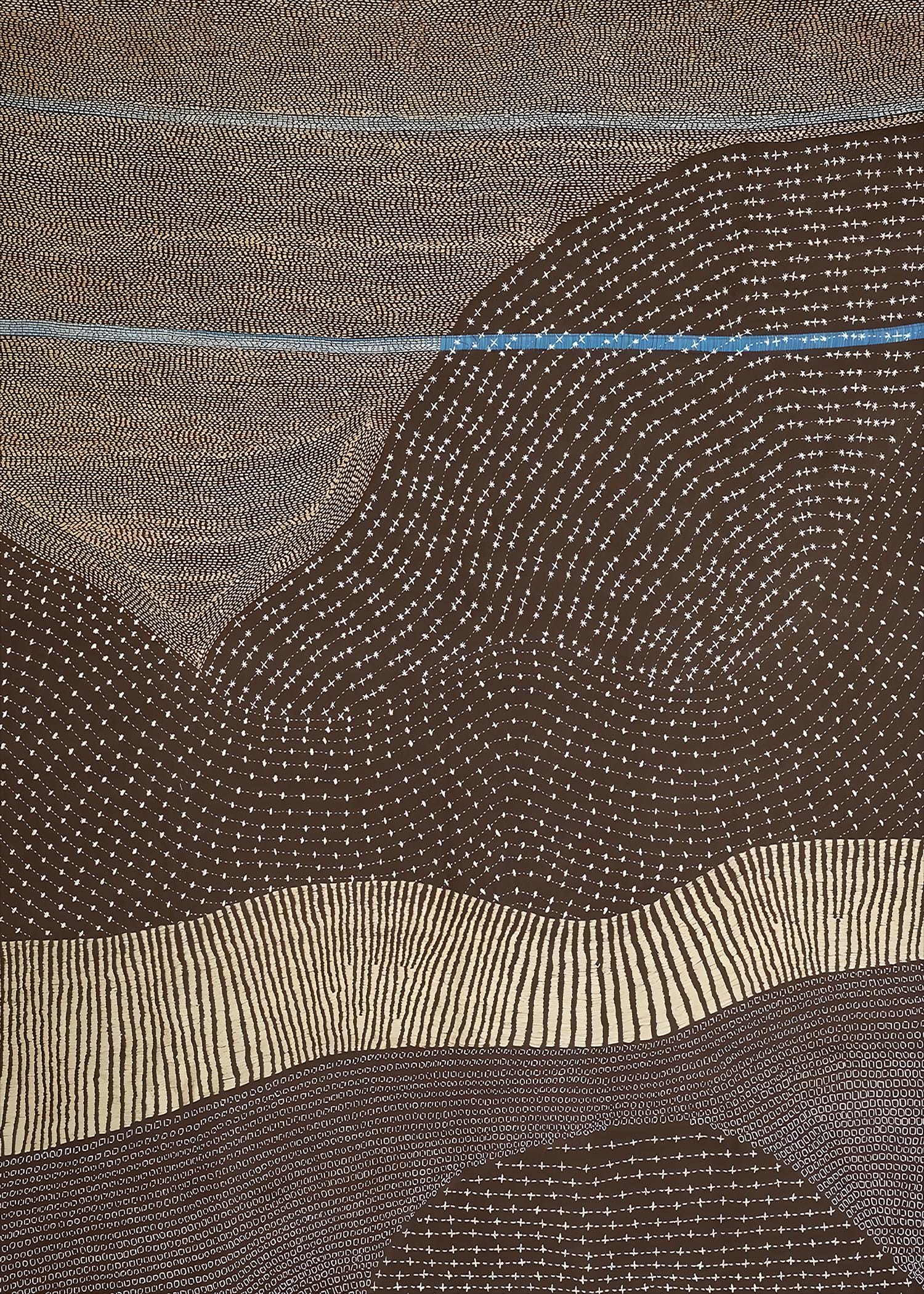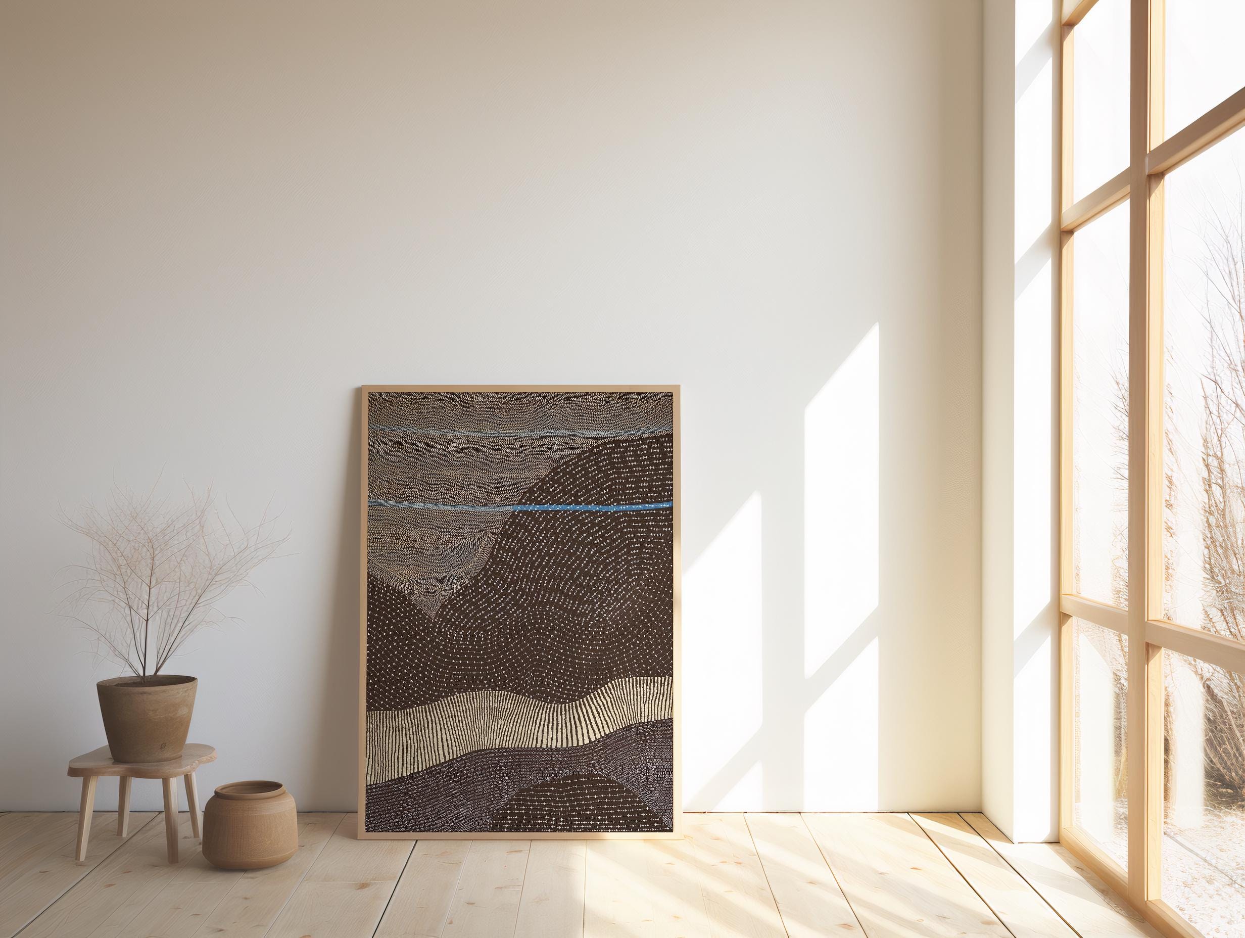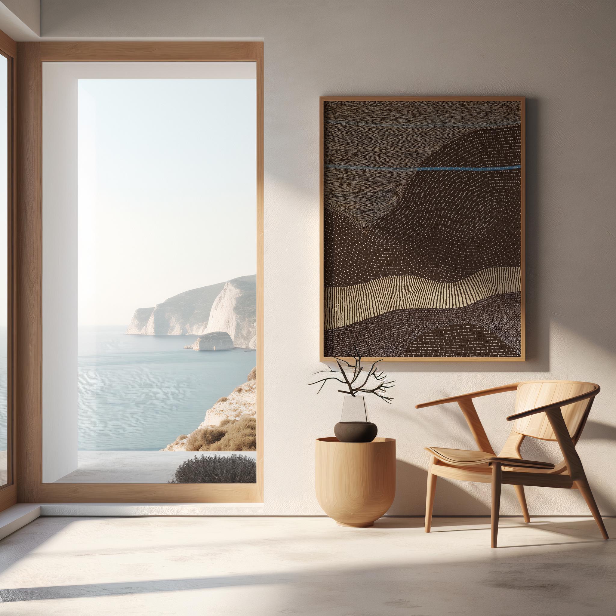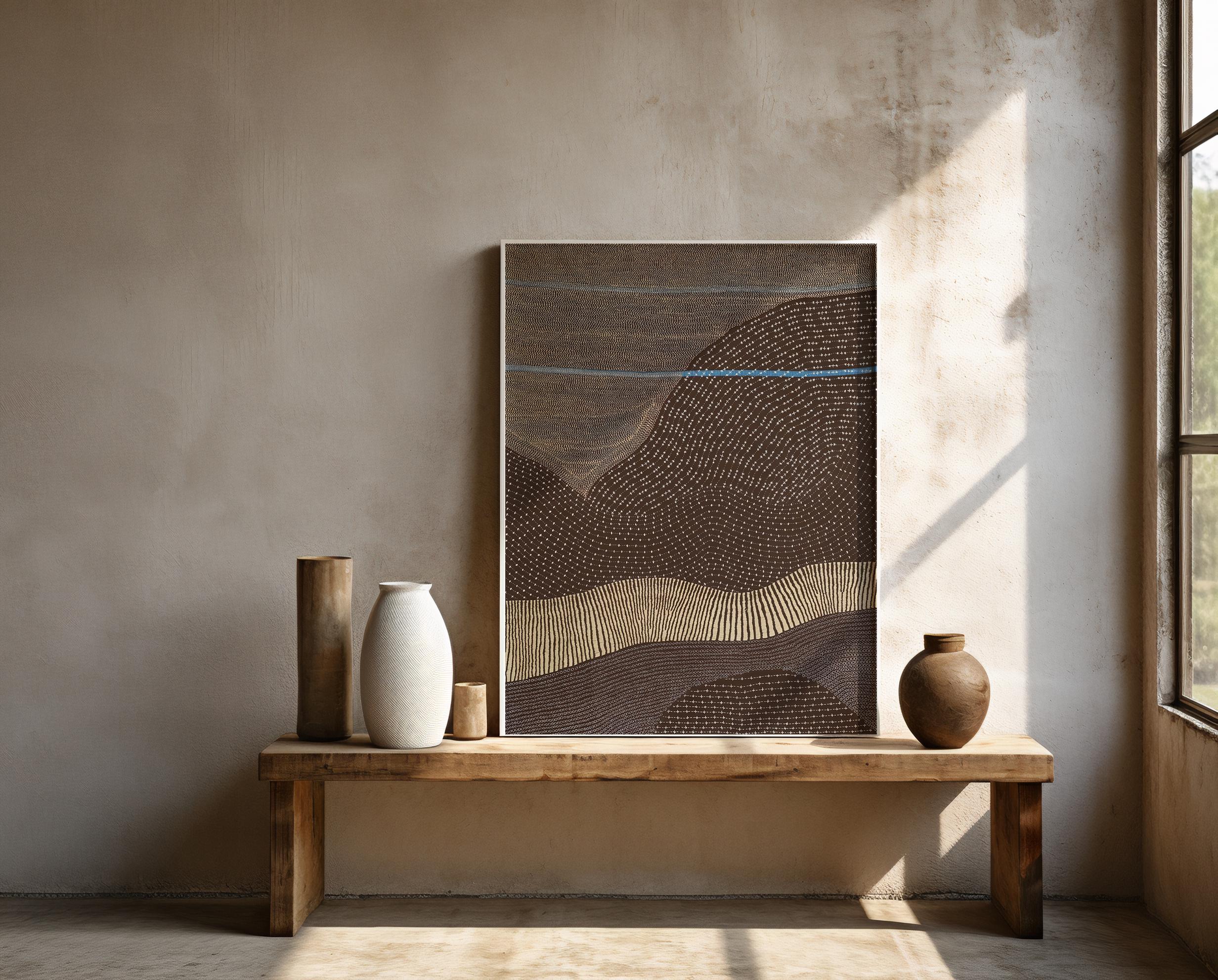 Bring calm, organic movement into your space with this earthy abstract landscape artwork featuring flowing terrain lines, soft blue horizon accents, and warm desert tones. A modern, minimalist statement piece designed for organic modern, Japandi, and neutral interiors.