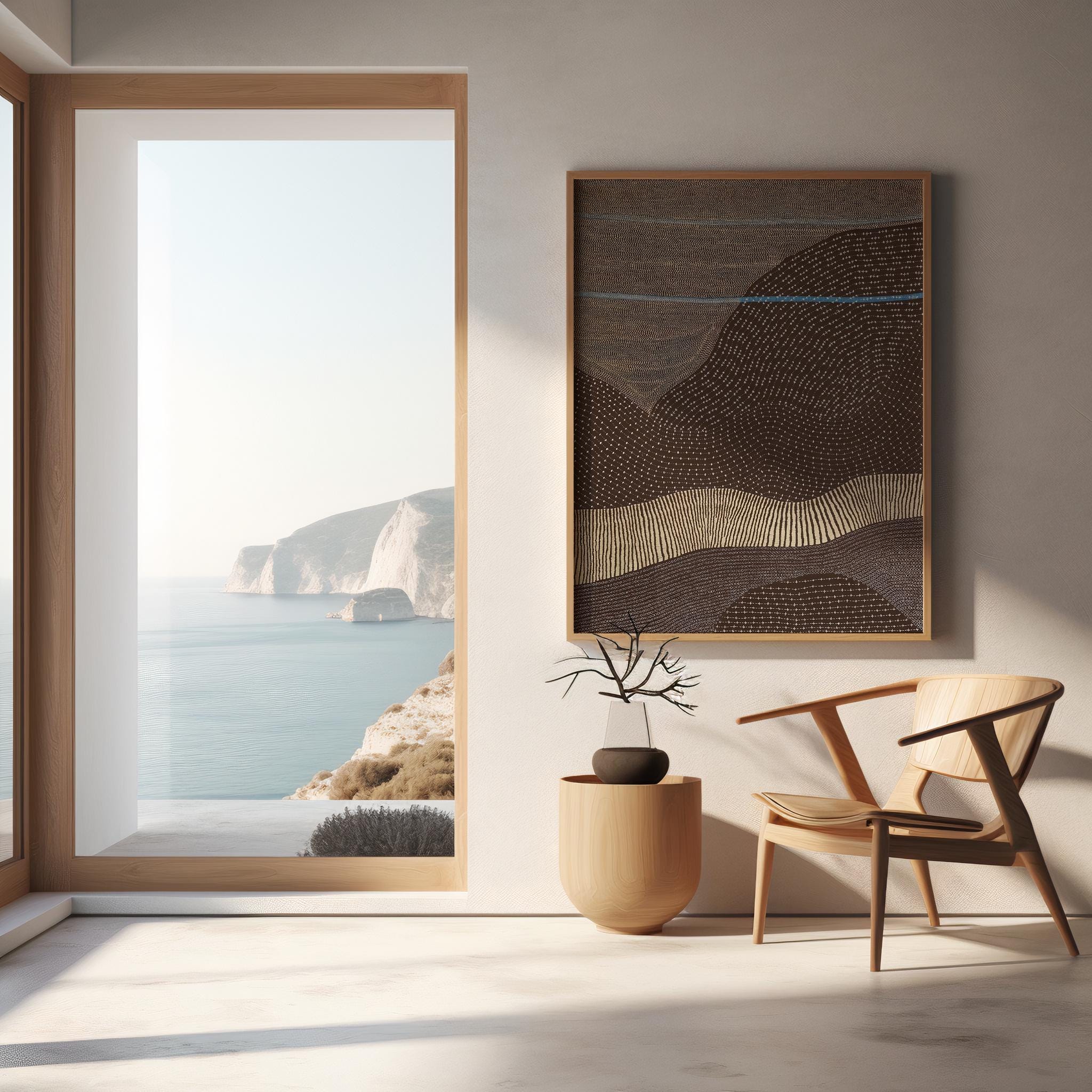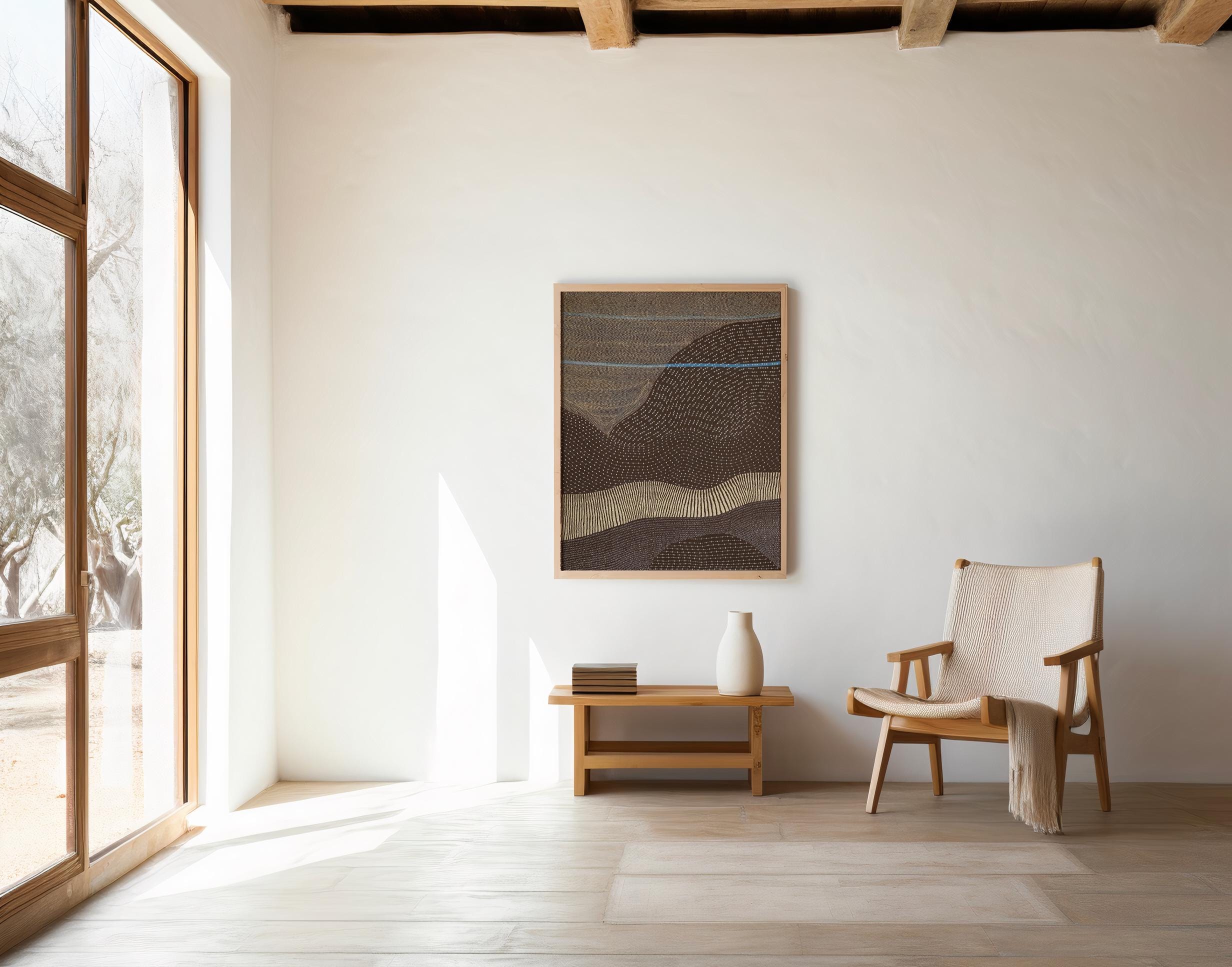 Bring grounded movement and warm desert-inspired tones into your space with this earthy abstract landscape artwork. Featuring layered terrain lines and soft horizon accents, this piece adds depth and calm energy to organic modern, Japandi, and neutral interiors.