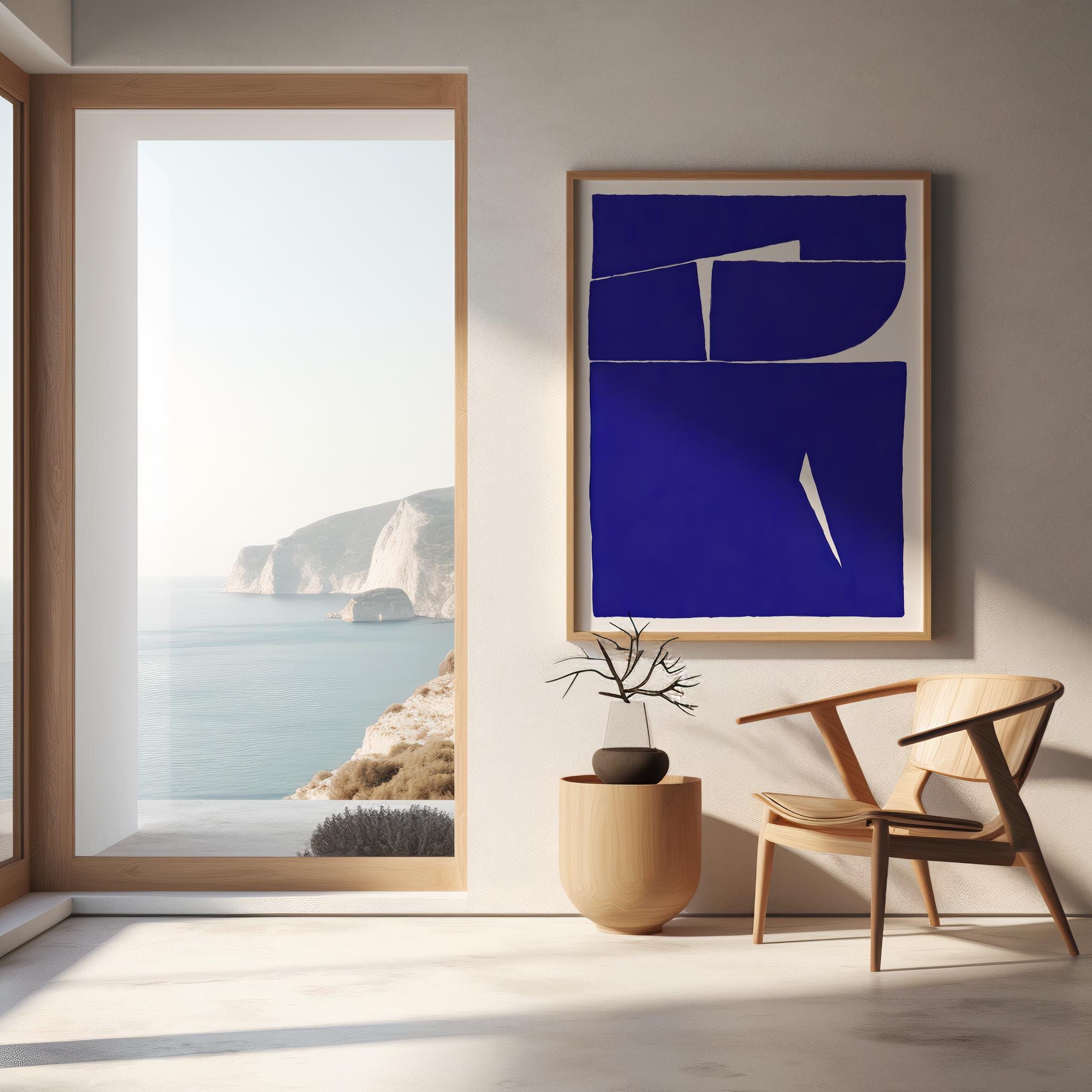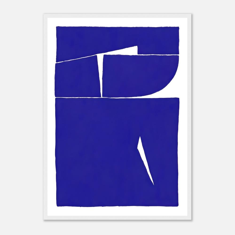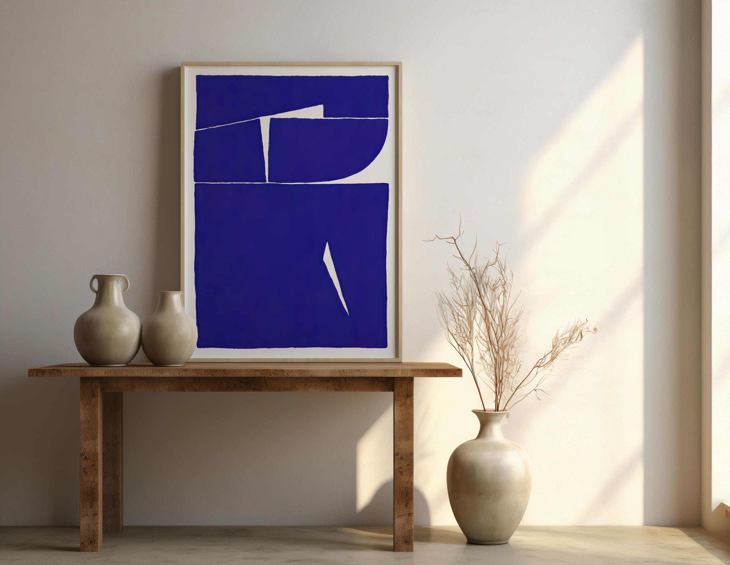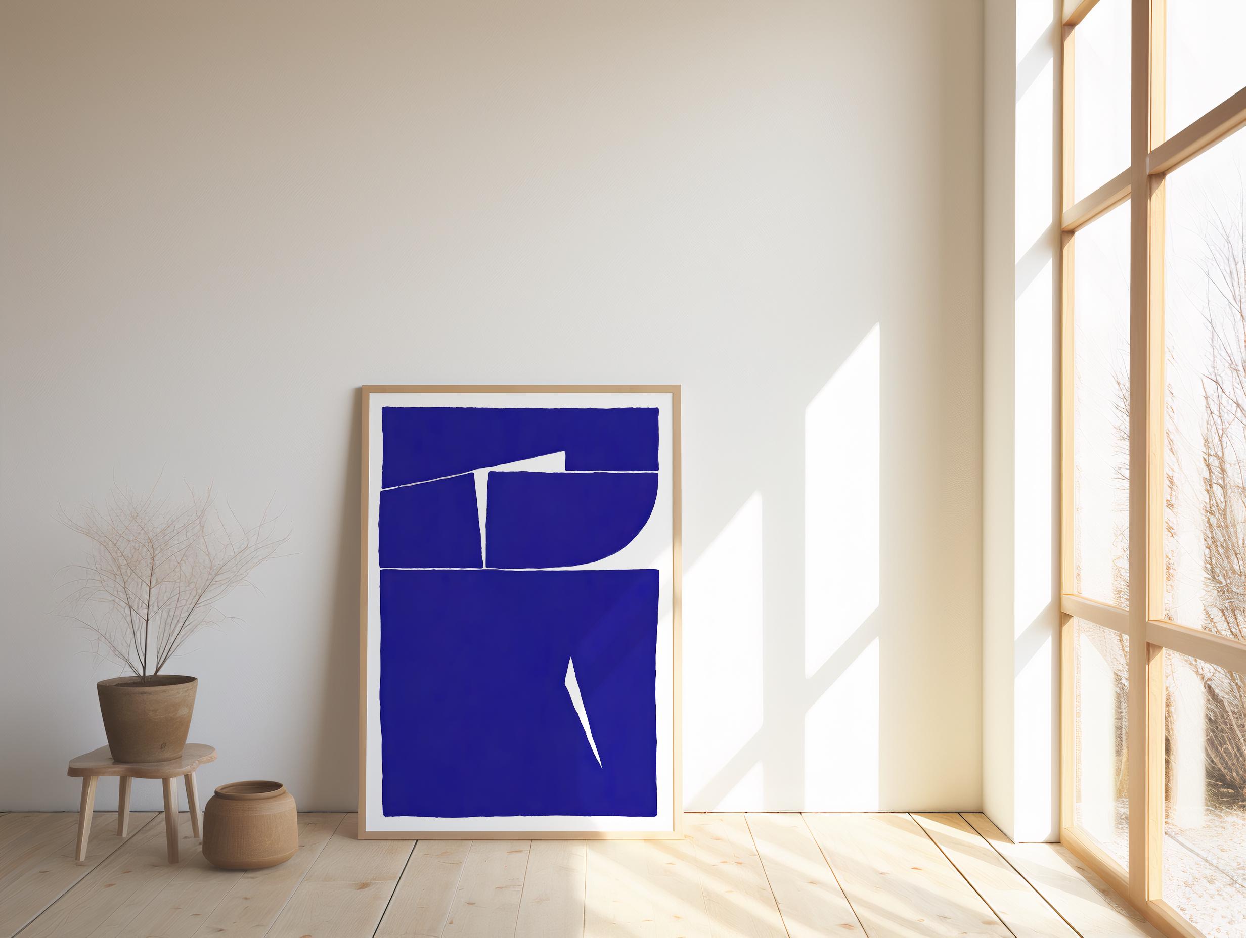 Make a bold architectural statement with this cobalt blue abstract artwork, featuring strong geometric forms and clean organic cutout lines. A striking focal piece designed for modern, minimalist, and contemporary interiors — perfect for living rooms, bedrooms, offices, or gallery walls that need confident color.