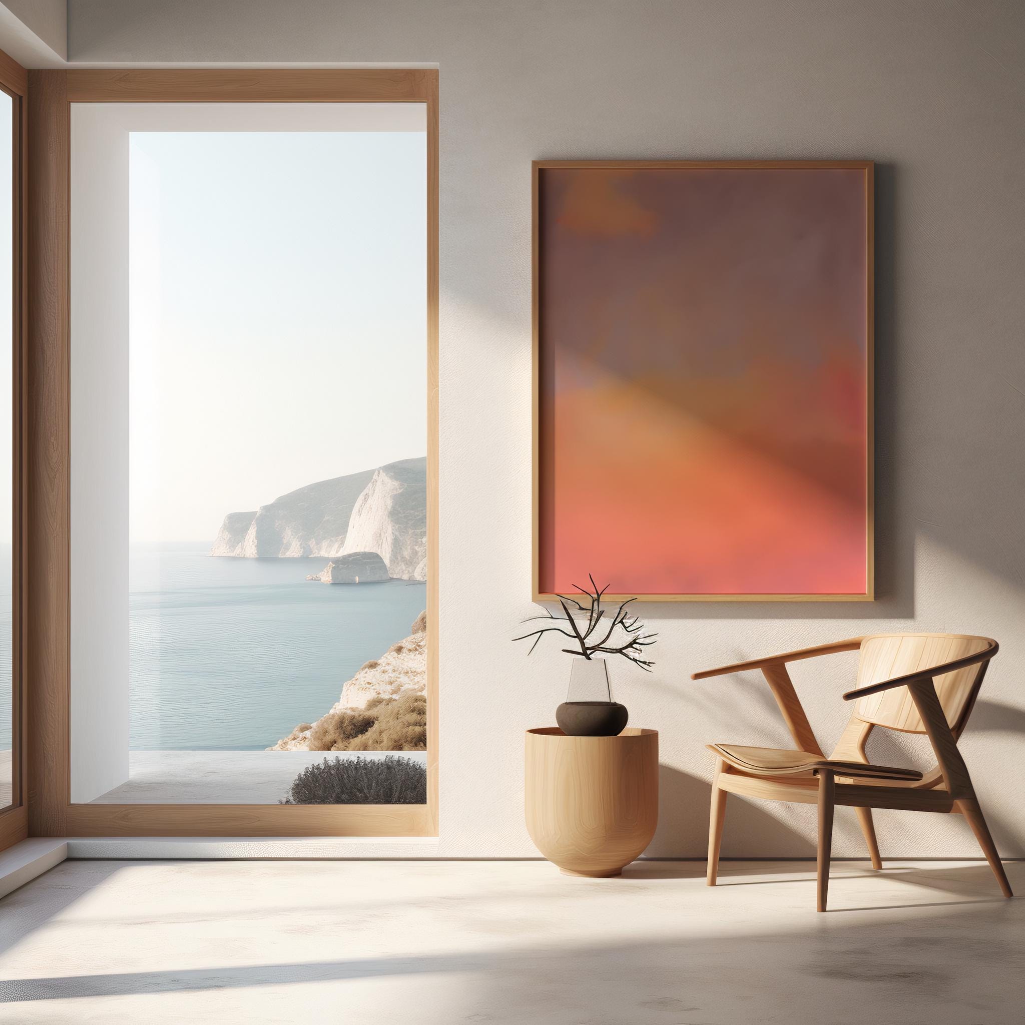 Instant printable abstract artwork featuring soft lavender haze blended into warm peach, coral, and sunset-toned gradients. This minimal atmospheric composition brings gentle warmth and calm into modern, Japandi, and organic interiors.