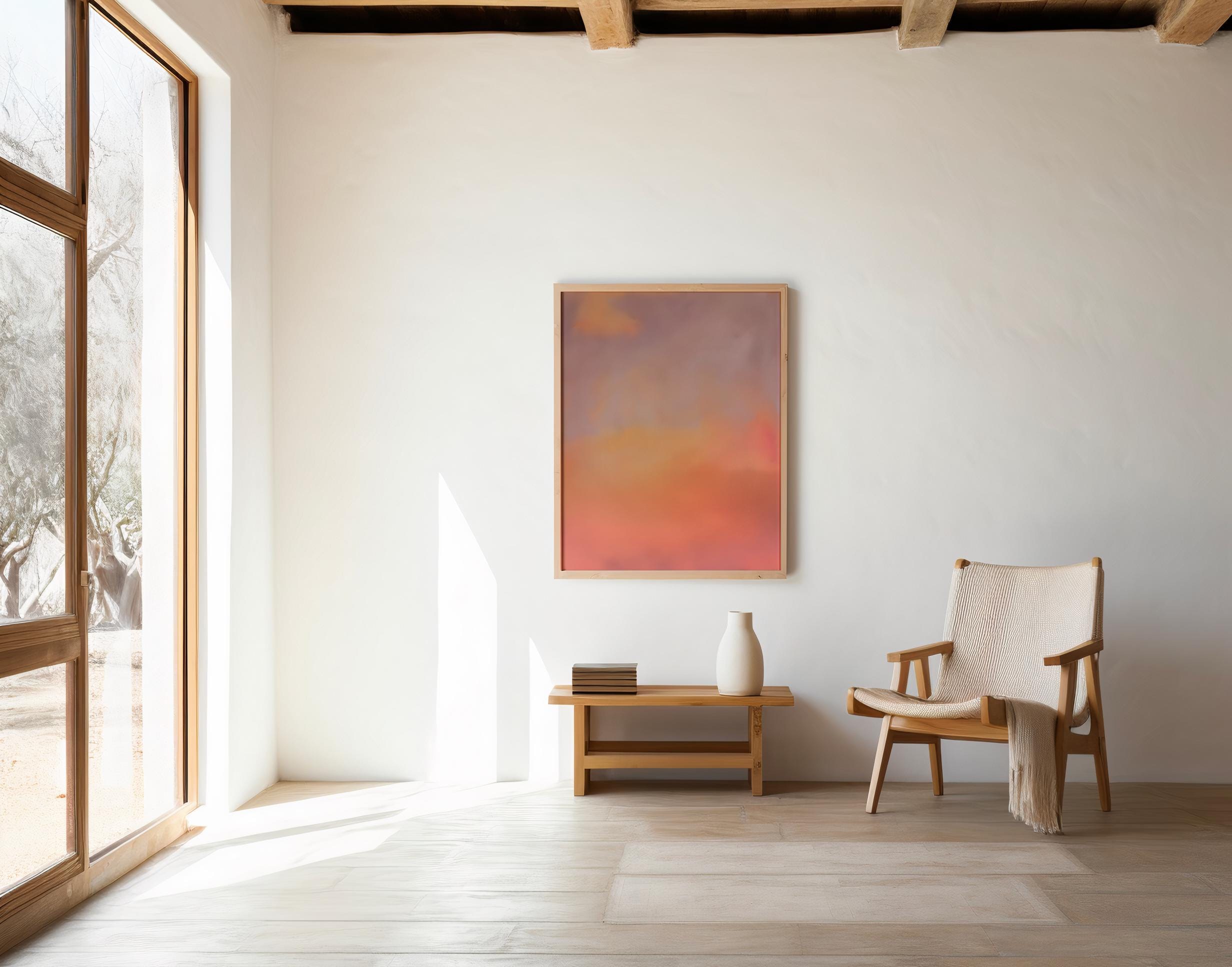 Bring modern warmth into your space with this atmospheric gradient artwork featuring soft lavender haze flowing into peach and coral sunset tones. Clean, minimal, and elevated — designed for Japandi, organic modern, and contemporary interiors.