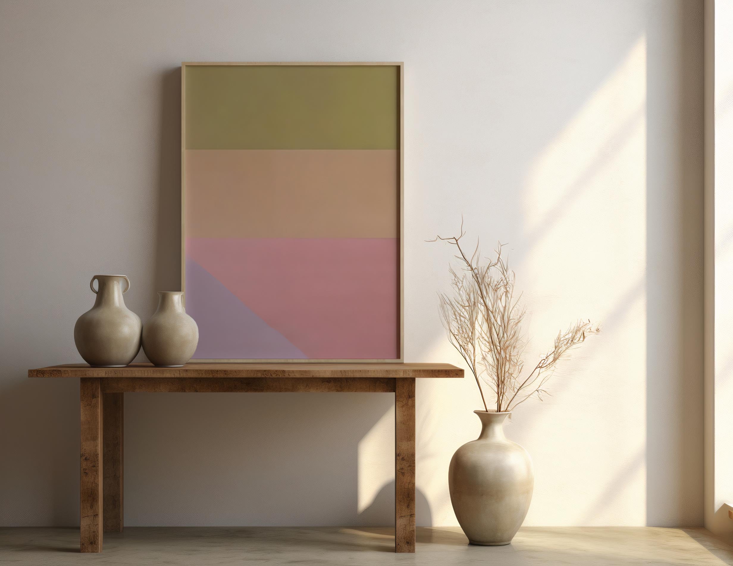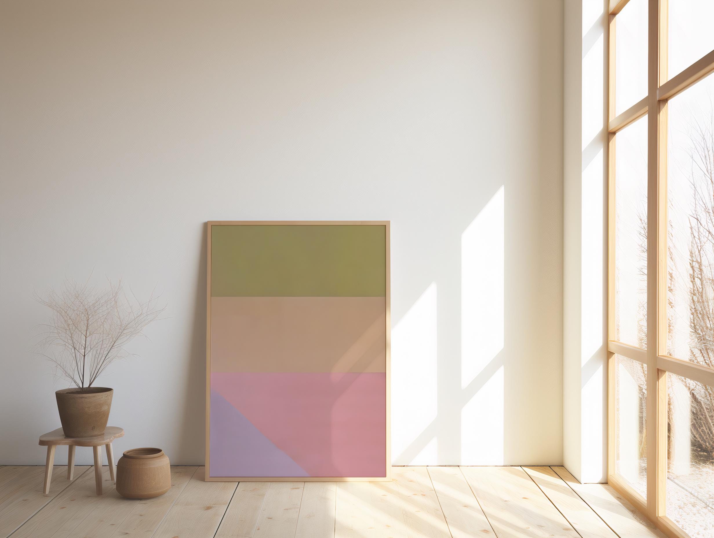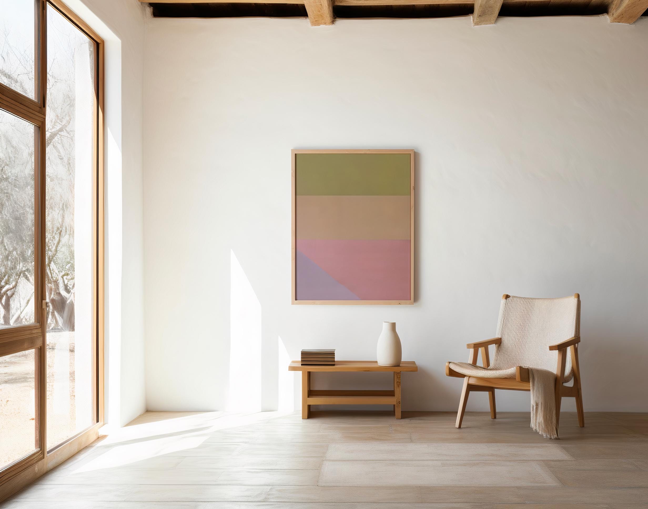 This modern color block wall art features layered earthy tones in a refined minimalist composition. Soft olive, warm sand, muted rose, and subtle lavender create a balanced, contemporary statement designed for calm, elevated interiors.