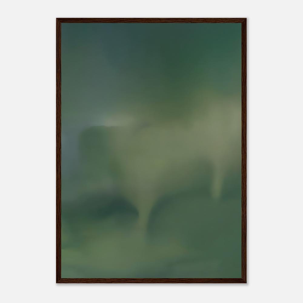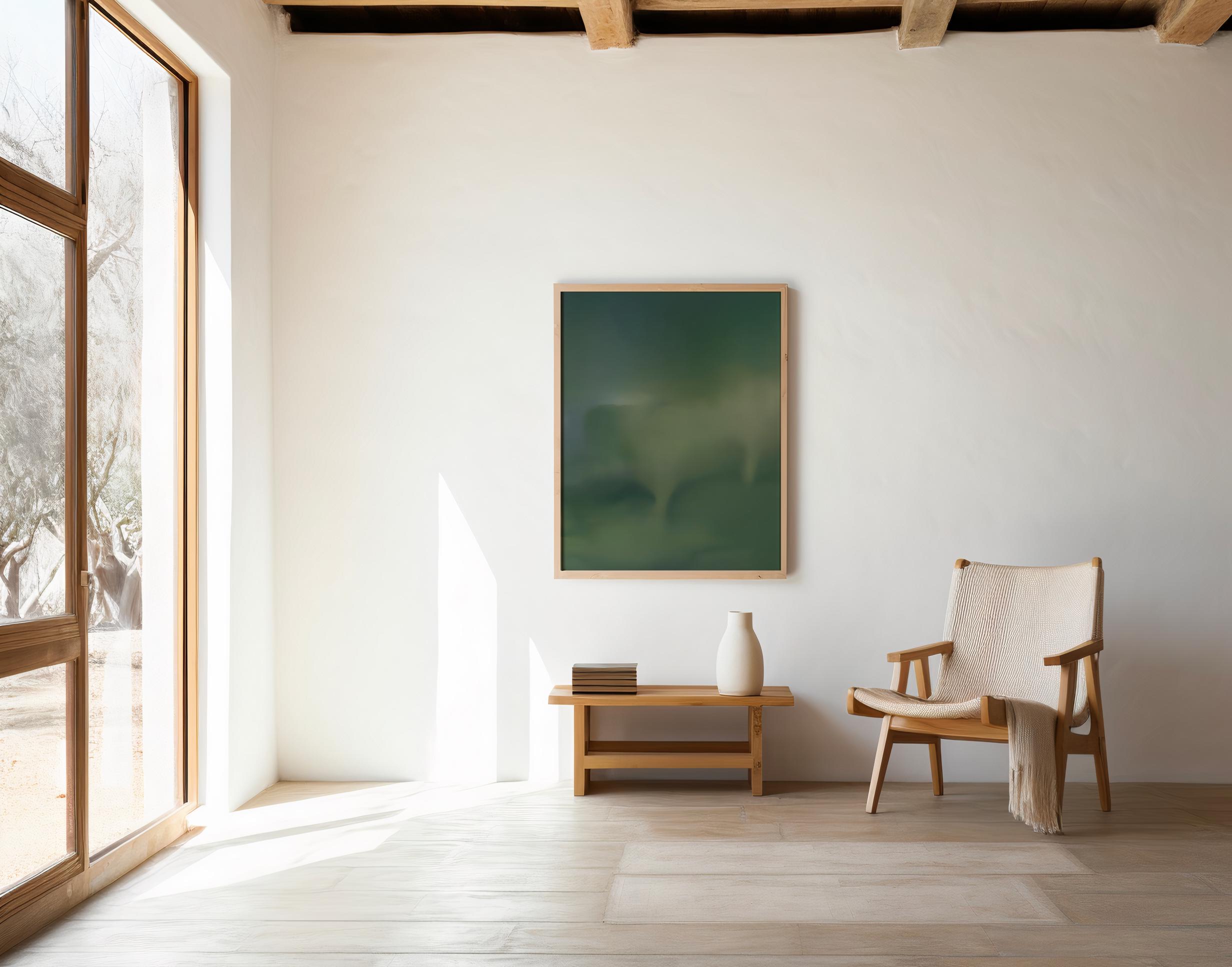 This moody green abstract wall art features layered tonal gradients in deep forest, muted sage, and soft moss hues. The organic flow and atmospheric depth create a calming, sophisticated focal point designed for modern interiors.