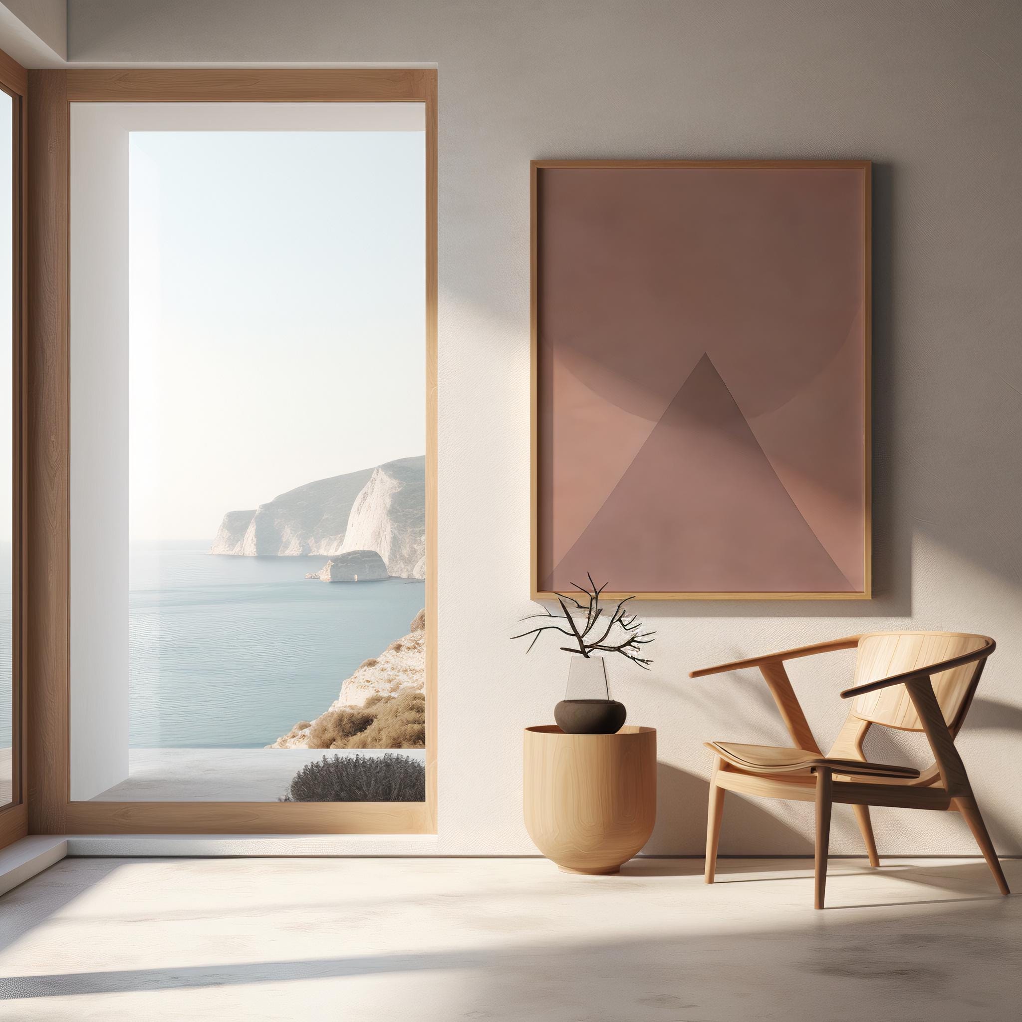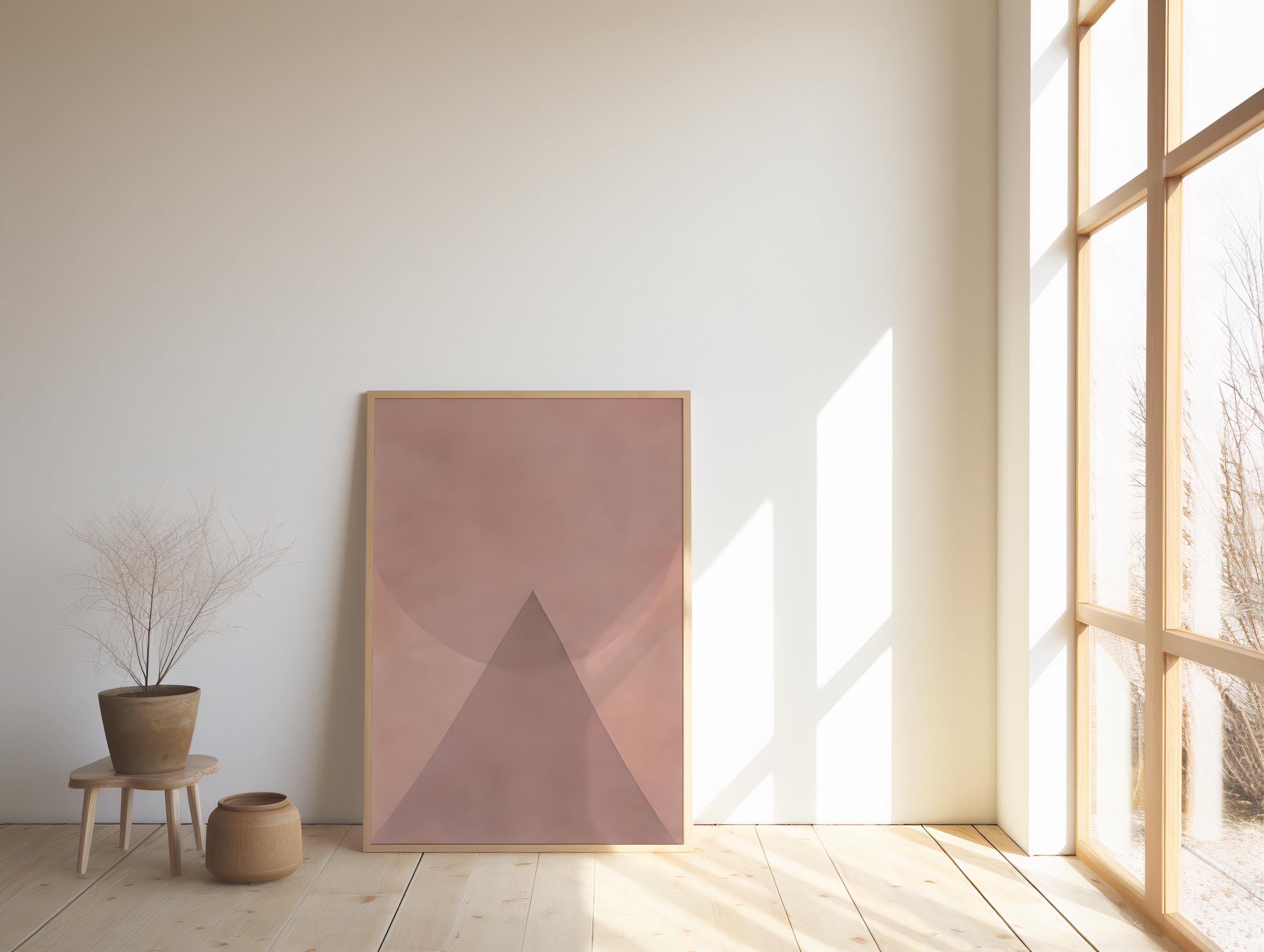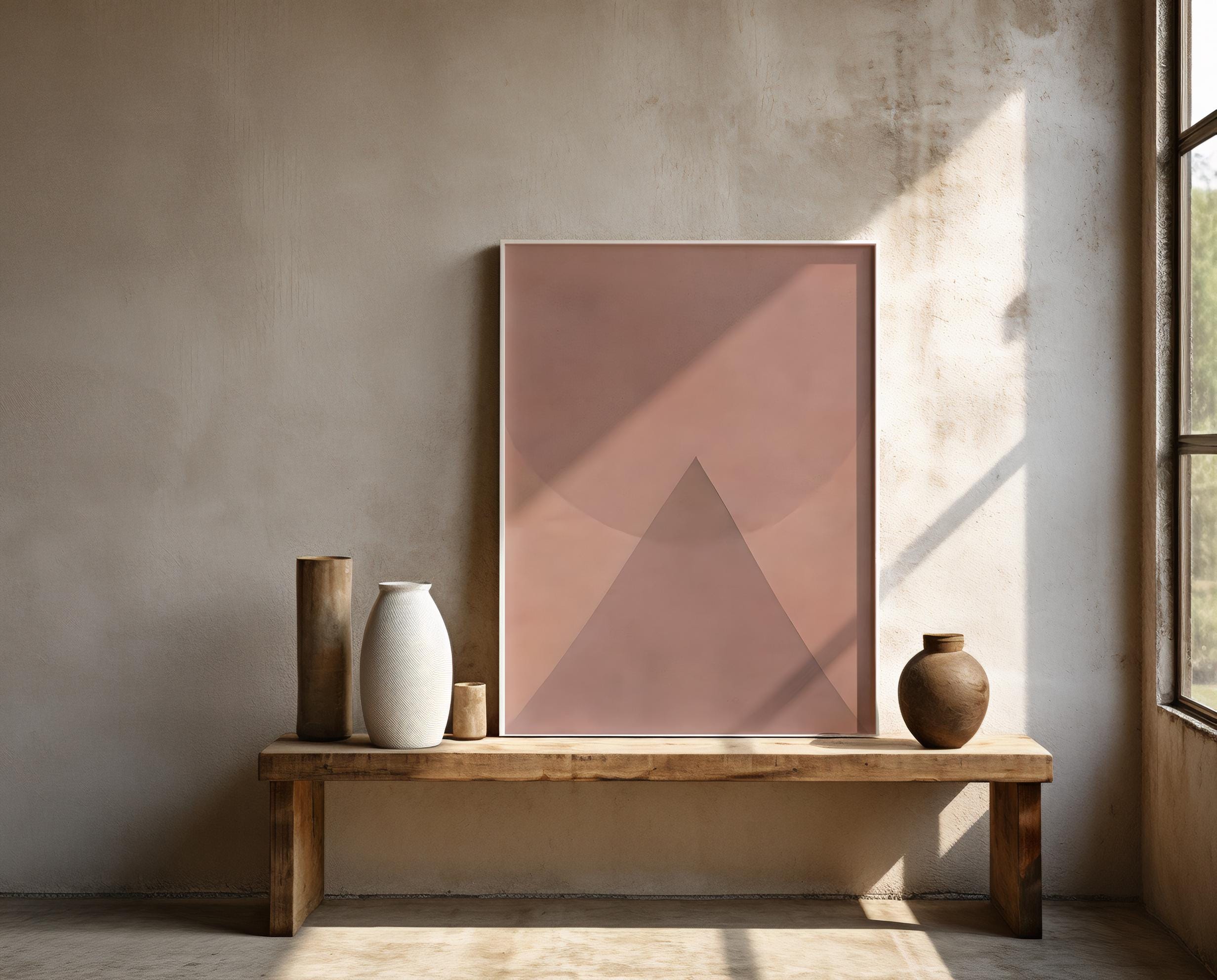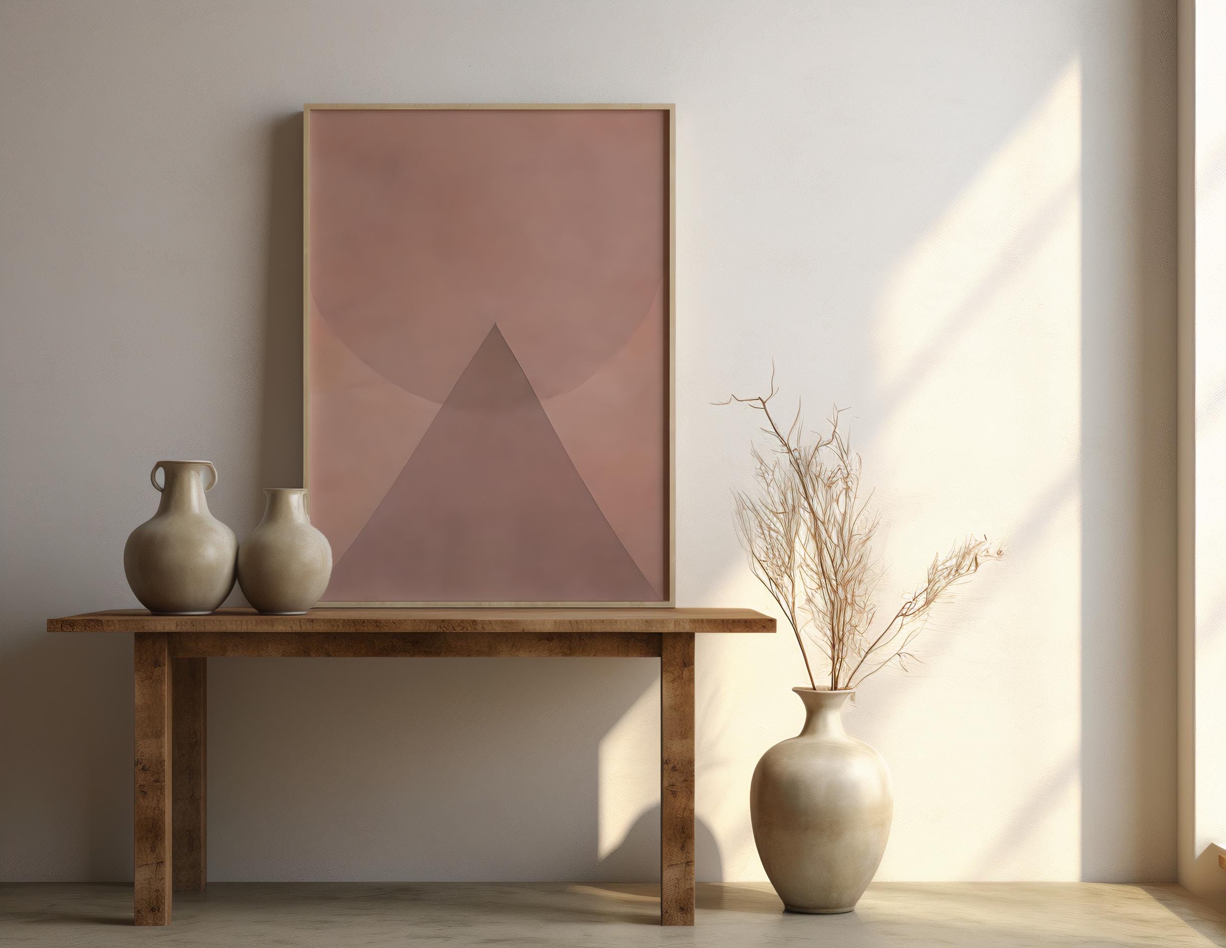 Instant downloadable art. This soft minimalist artwork features layered blush and warm neutral tones arranged in a calm geometric composition. A sculptural triangular form rises beneath a gentle circular shape, creating a balanced and architectural abstract design.