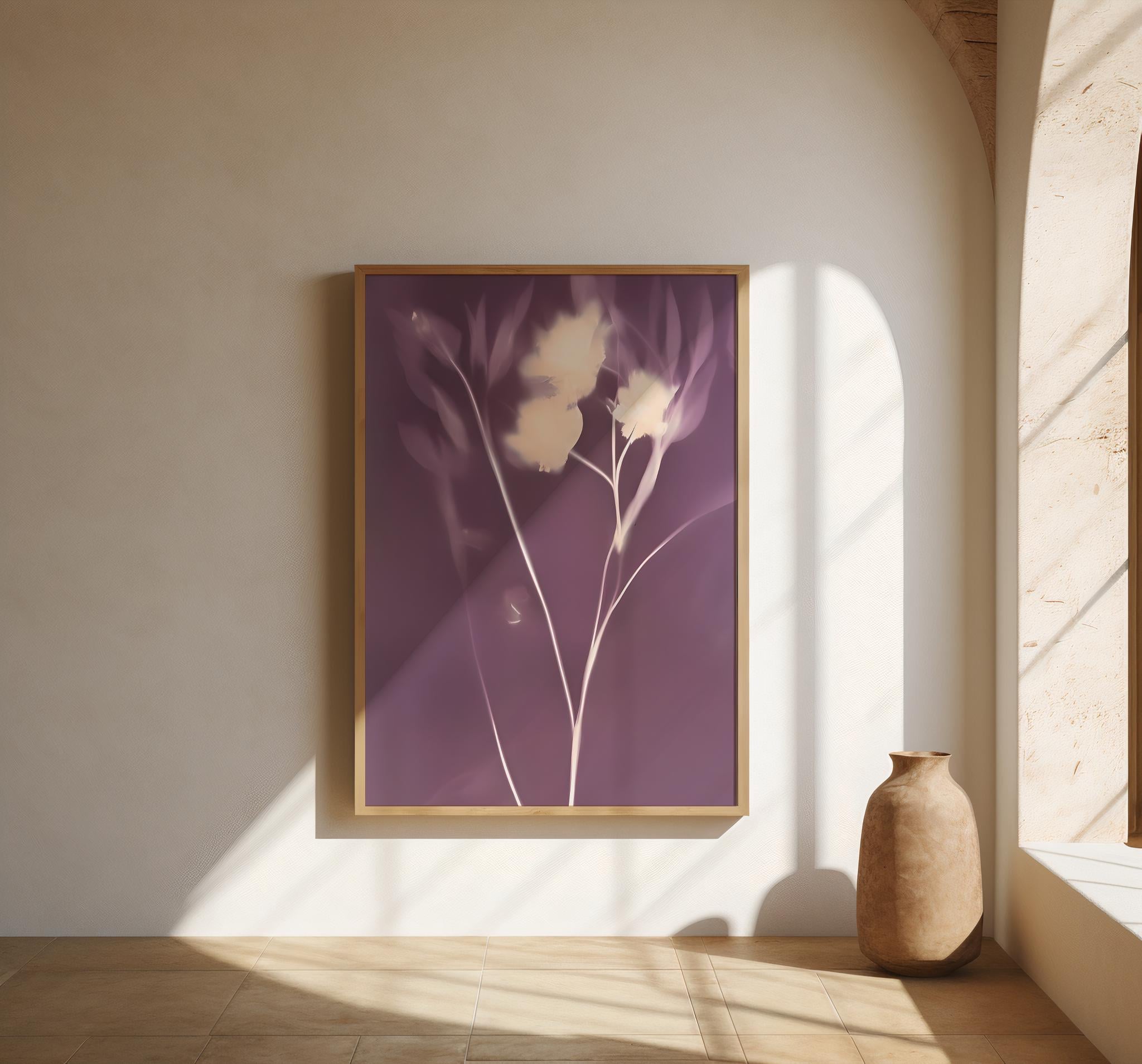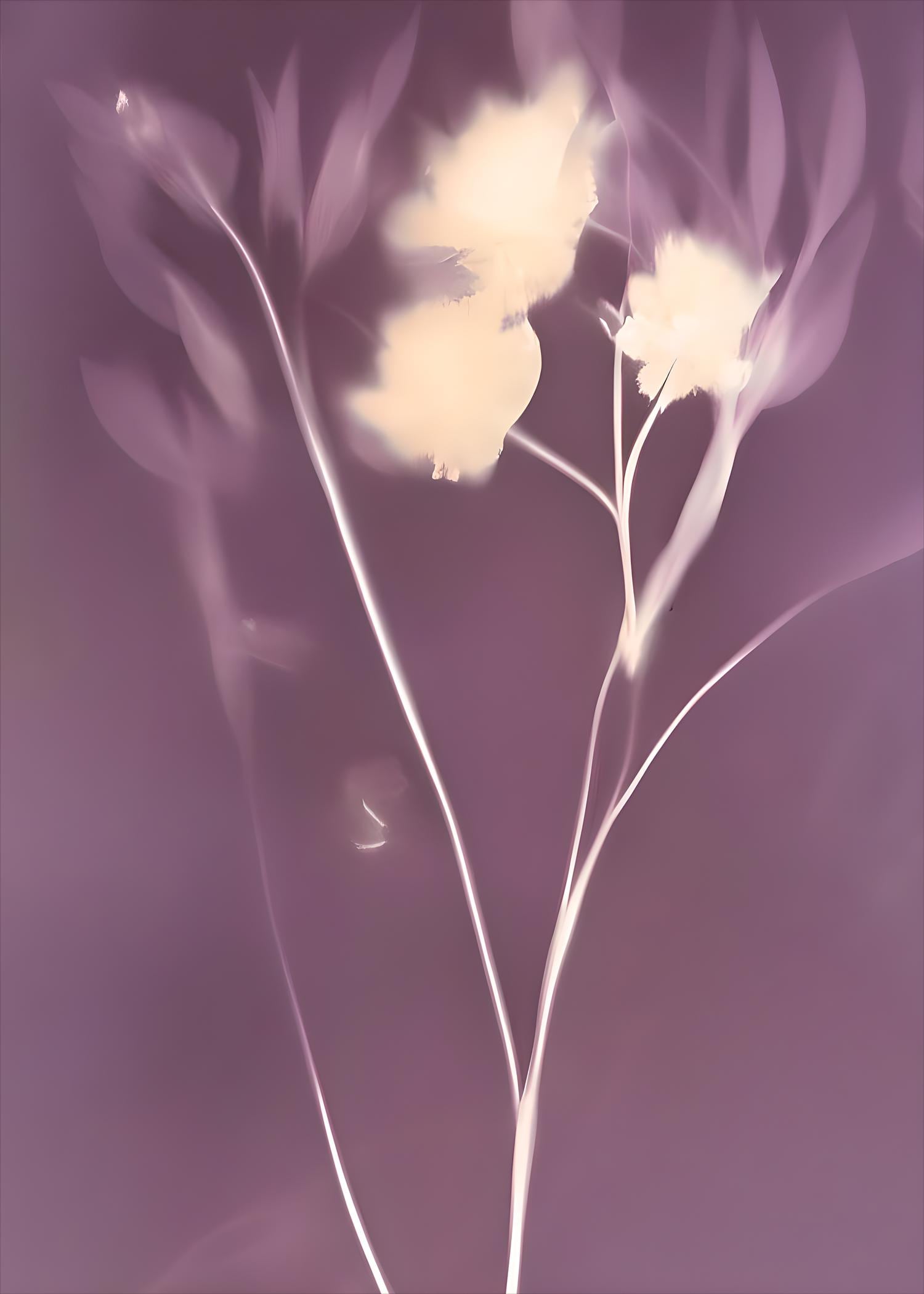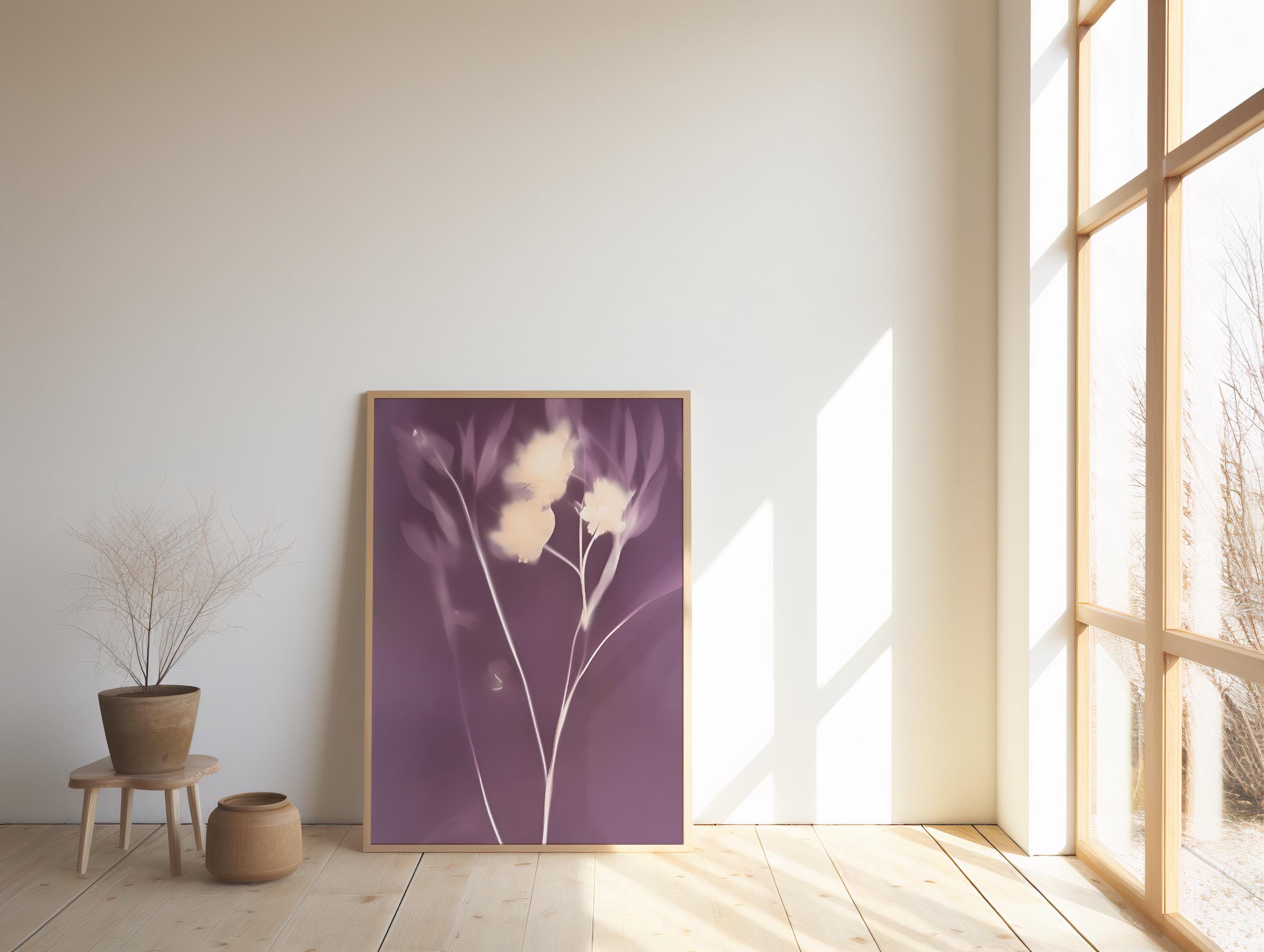 This minimalist floral artwork features delicate botanical stems softly illuminated against a rich muted purple background. The glowing cream blossoms and flowing lines create an elegant, dreamy composition that blends contemporary minimalism with organic botanical forms.