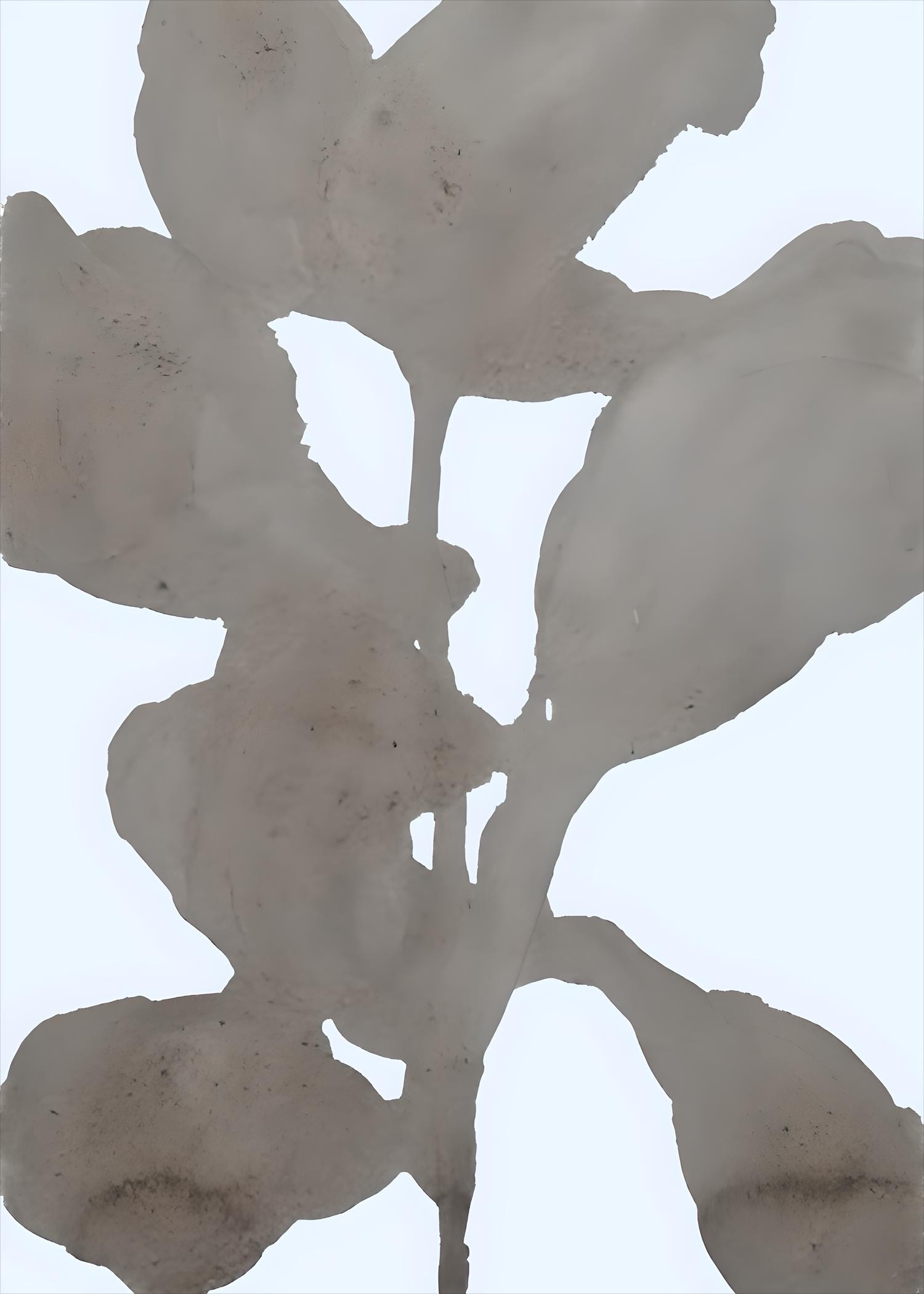 This abstract floral artwork features soft organic shapes in muted grey and blue tones, creating a calm and sculptural composition. The layered forms resemble petals or botanical silhouettes, giving the piece a subtle floral presence while maintaining a modern abstract aesthetic.