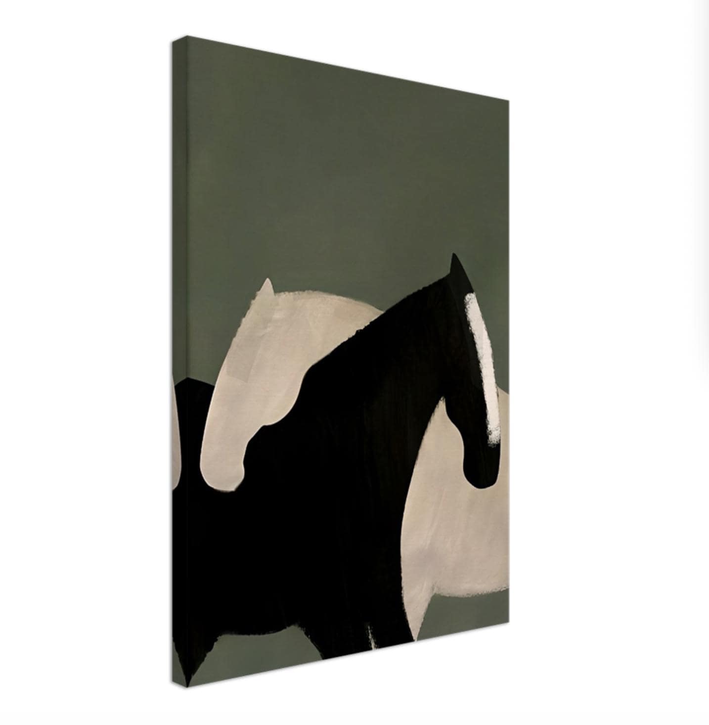 This modern artwork features two stylized horse forms created with bold painterly shapes in deep olive green and soft neutral tones. The expressive brushwork and simplified silhouettes create a striking composition that blends abstract art with equestrian imagery.