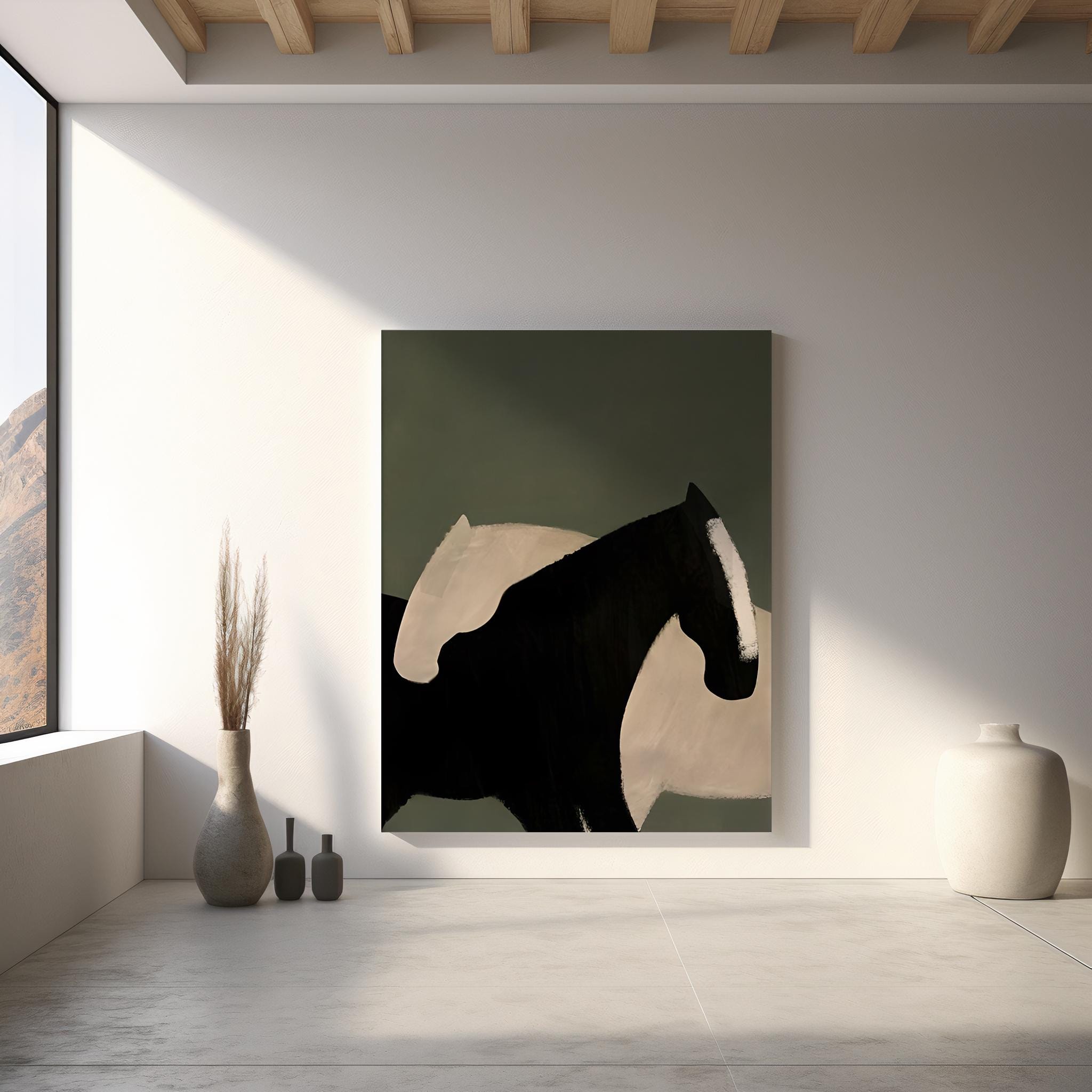 The earthy green palette and strong organic forms bring a sense of movement and quiet strength to the space. This piece works beautifully in living rooms, offices, bedrooms, or equestrian-inspired interiors where modern artwork and natural tones create a refined focal point.