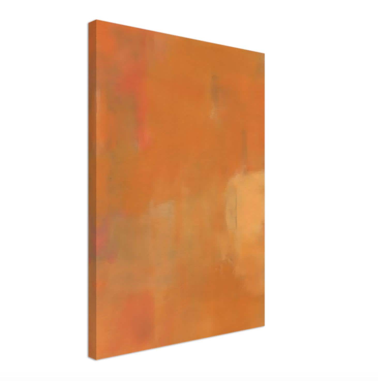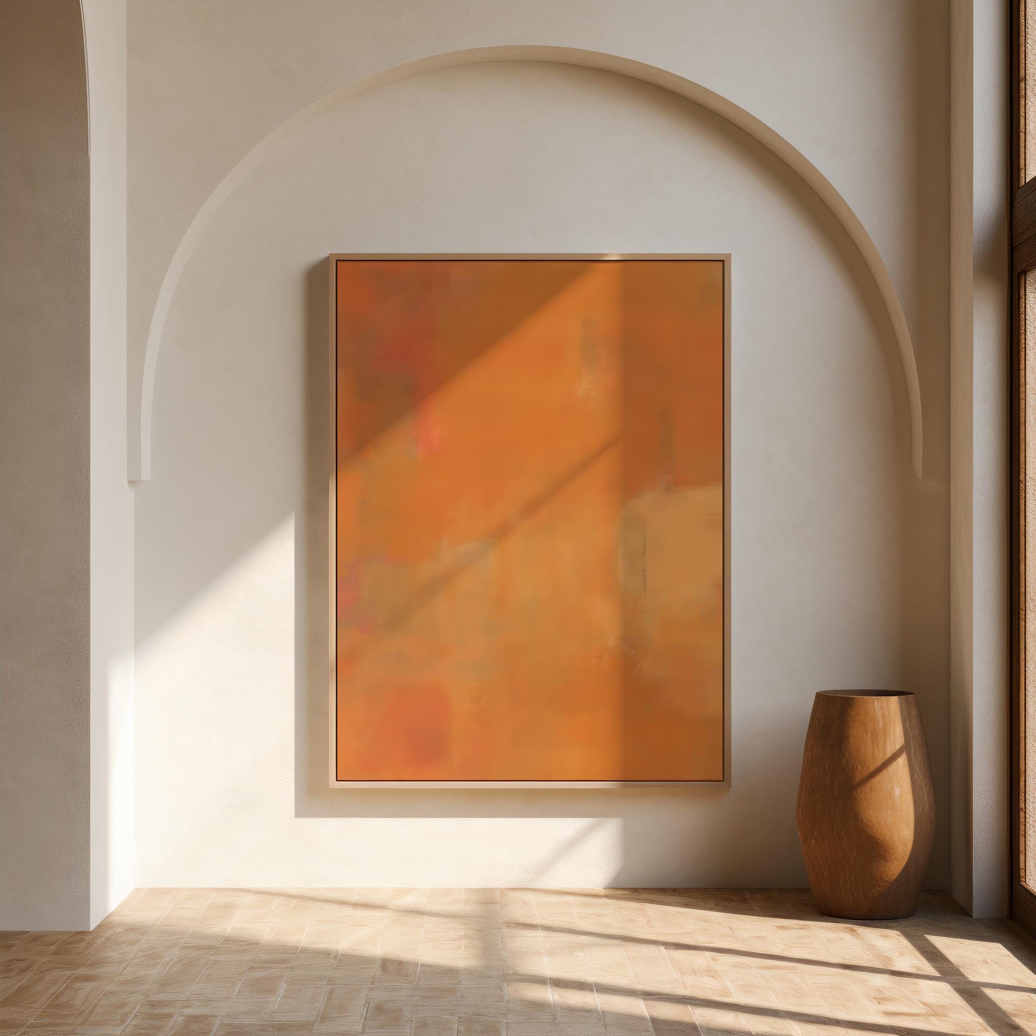 This modern abstract artwork features layered painterly tones of orange, terracotta, and warm neutral hues blended into a soft atmospheric composition. The subtle texture and color transitions create depth while maintaining a calm, minimalist aesthetic.