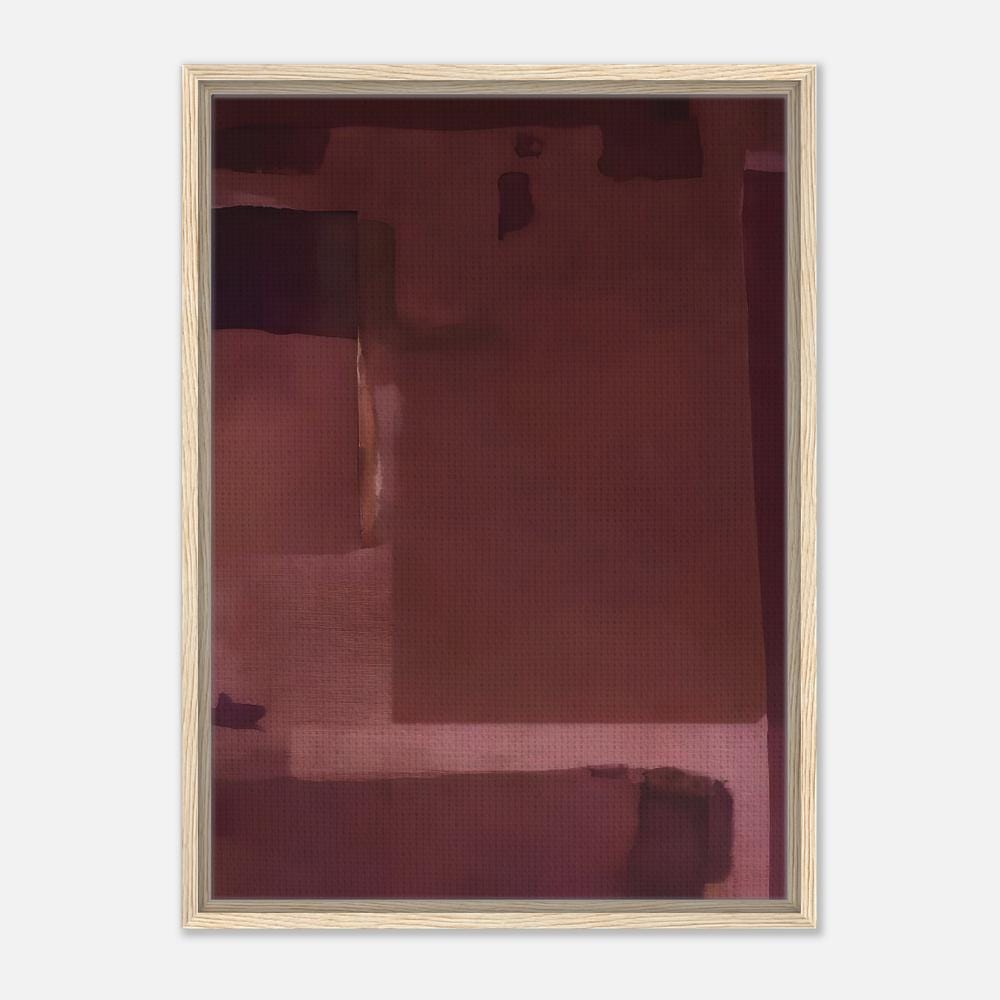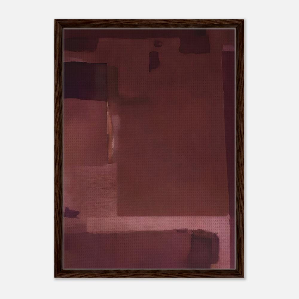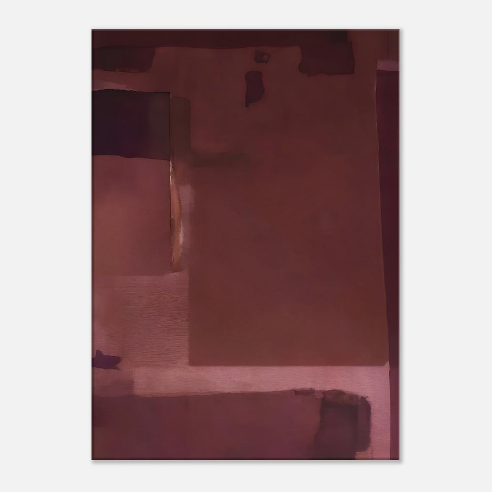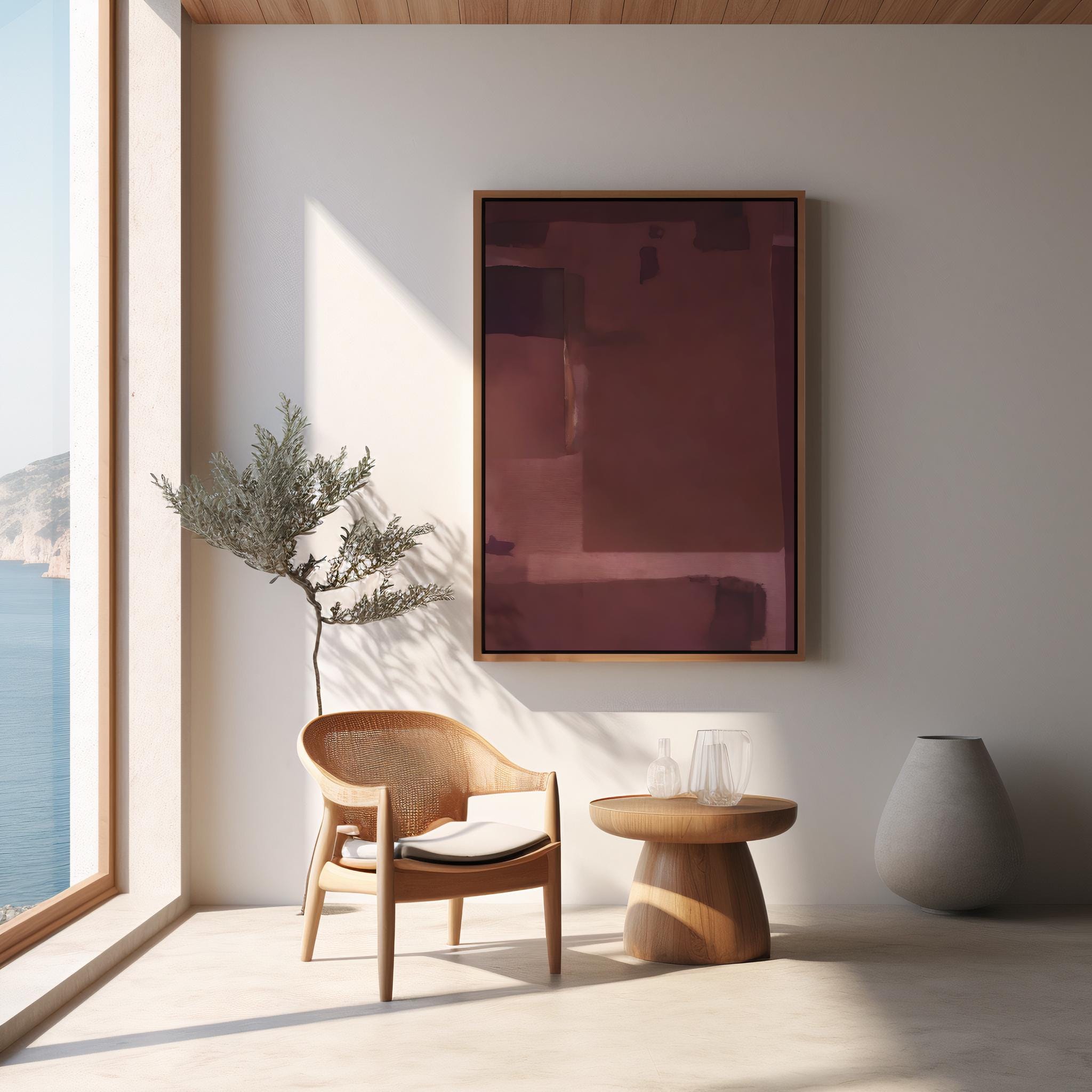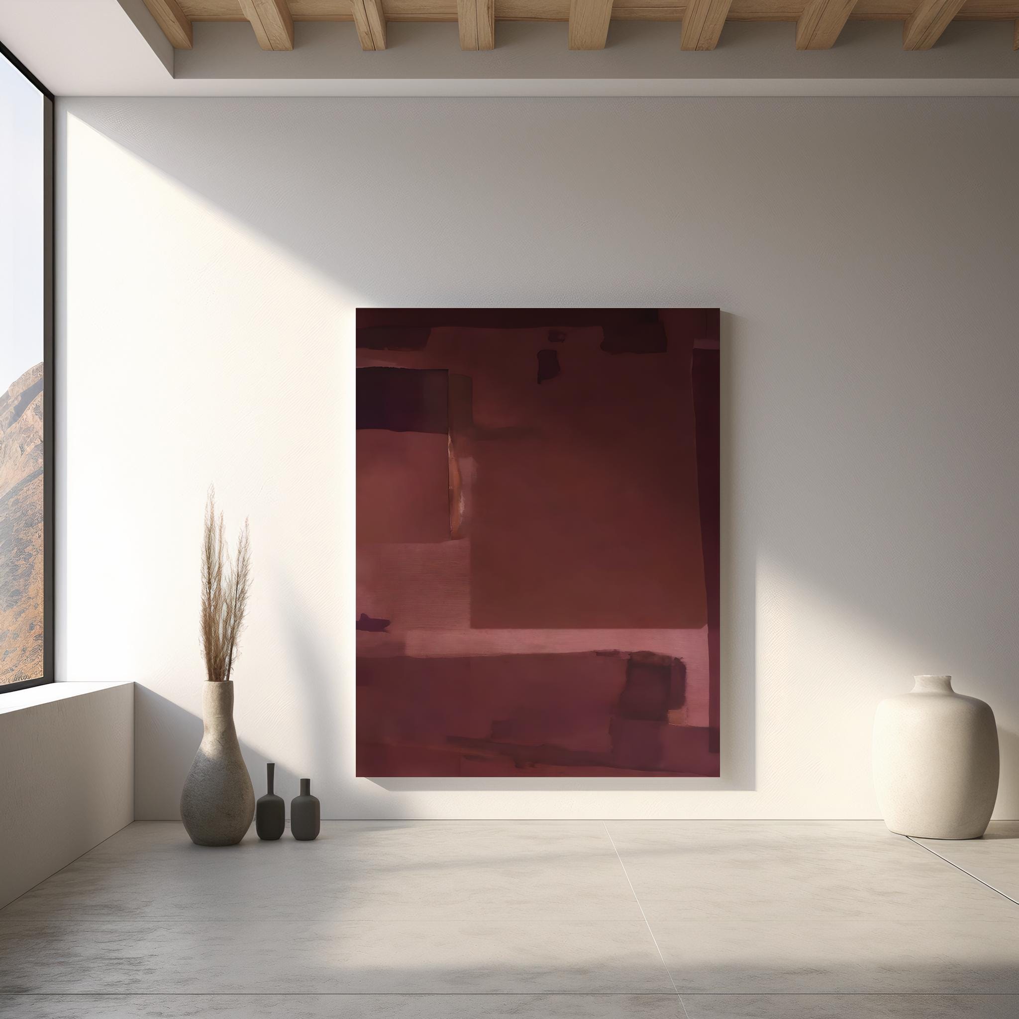 This modern abstract artwork features layered painterly forms in deep burgundy, wine, and muted rose tones. The soft blending of shapes and subtle brush textures create a calm, atmospheric composition that feels both bold and refined.
