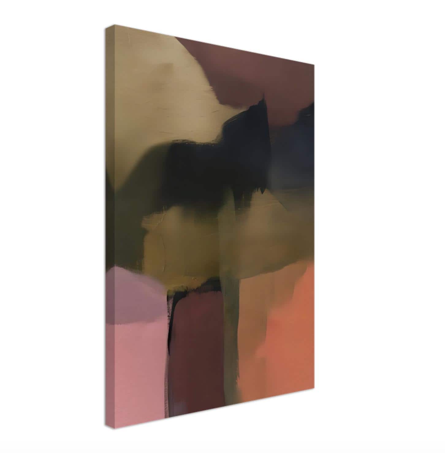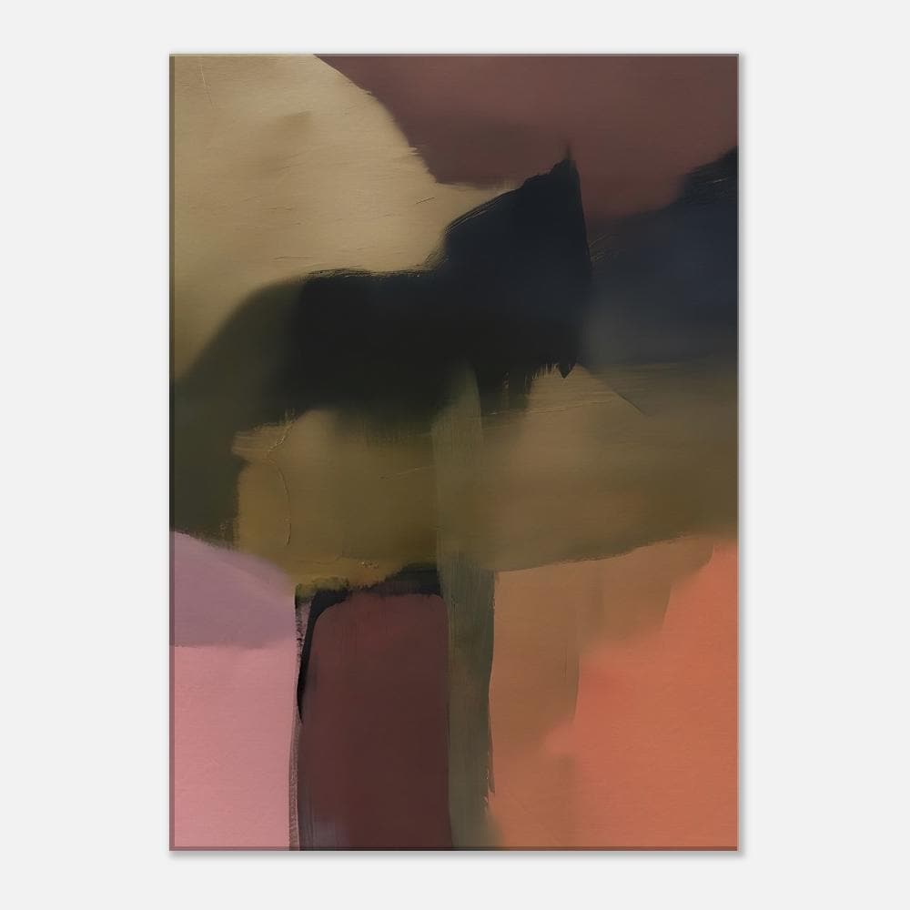 This modern abstract artwork features layered painterly forms in deep charcoal, earthy olive, warm clay, and soft neutral tones. The expressive brush strokes and blended textures create a bold yet atmospheric composition that feels both grounded and contemporary.